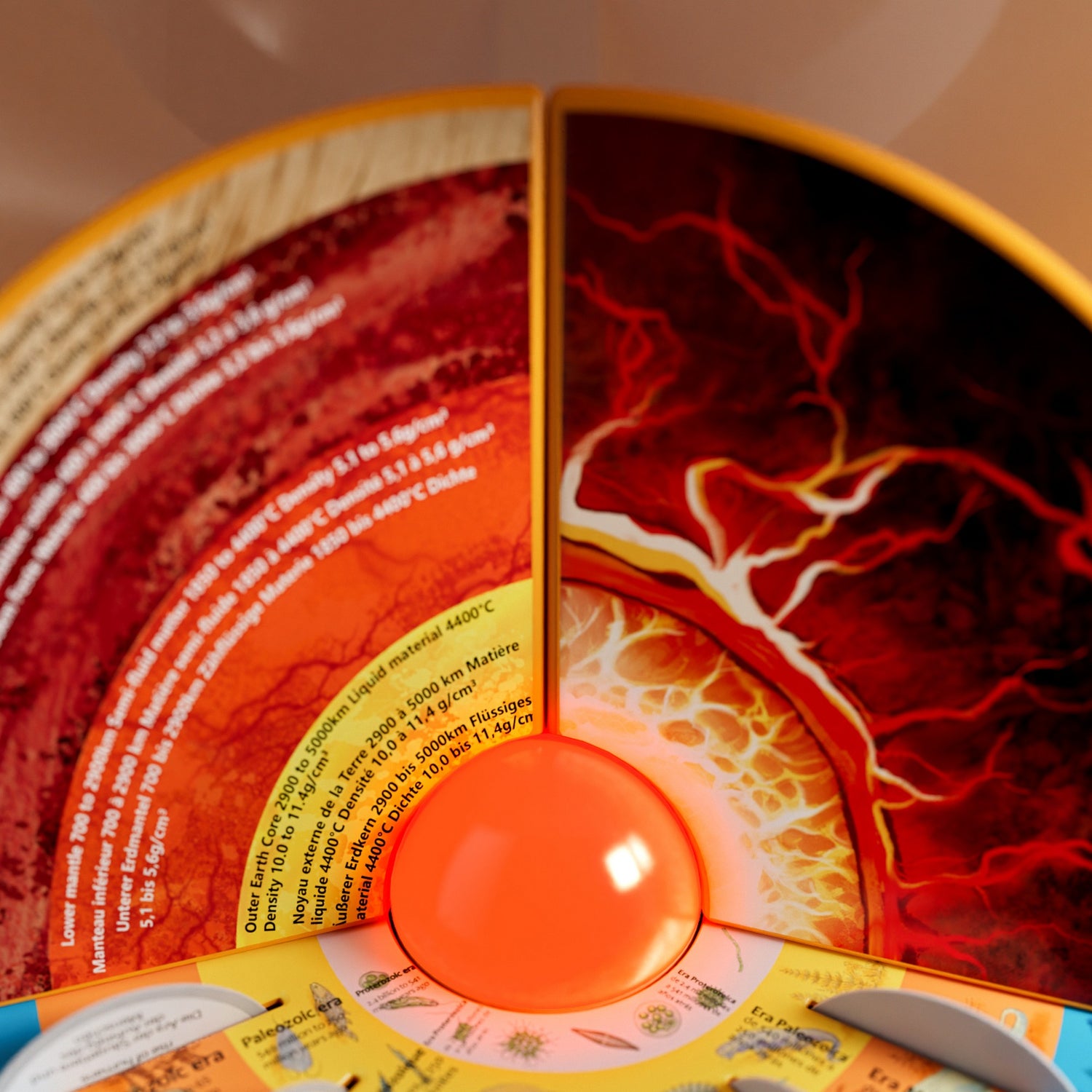 Info: Aufklappbarer Globus mit leuchtendem Erdkern, 66 spannende Fakten (Deutsch oder Englisch), 48 interaktive Quizfragen mit Selbstkontrolle, Herausnehmbare Teile für aktives Entdecken, Lichtfunktion für Aha-Momente mit Tiefgang