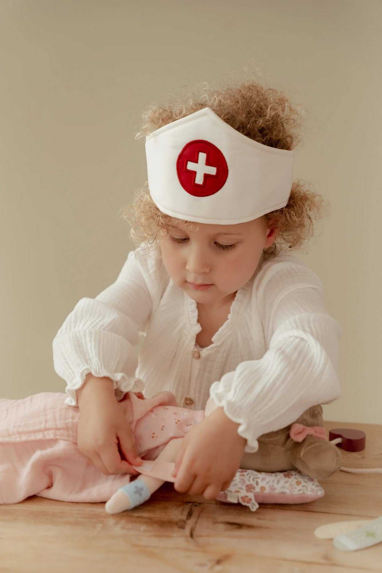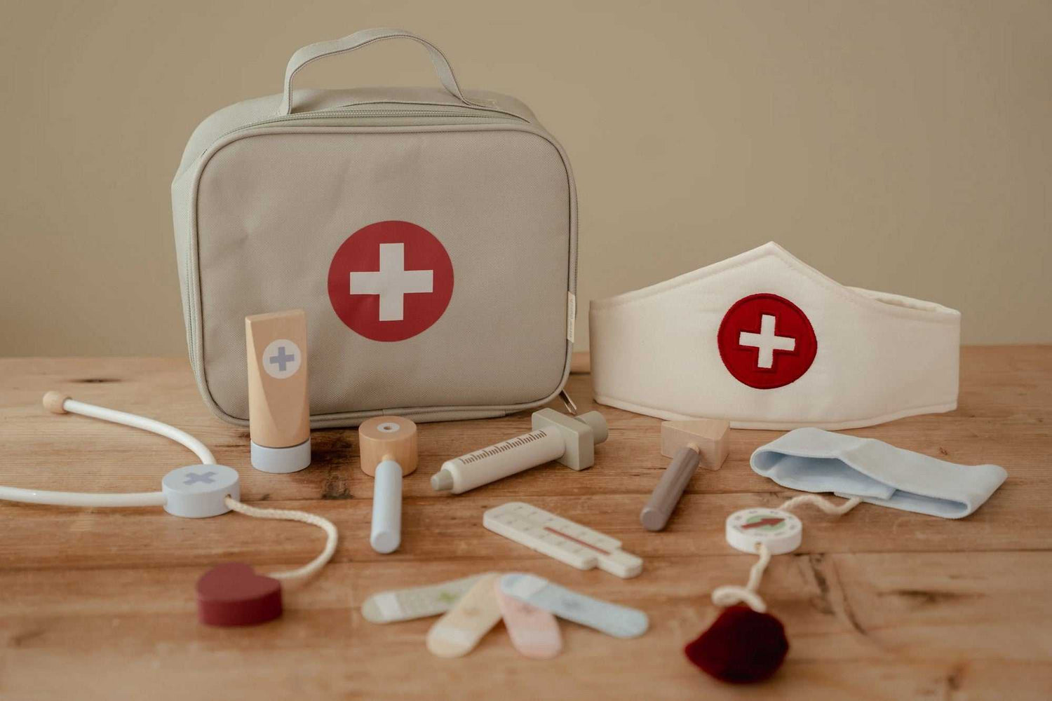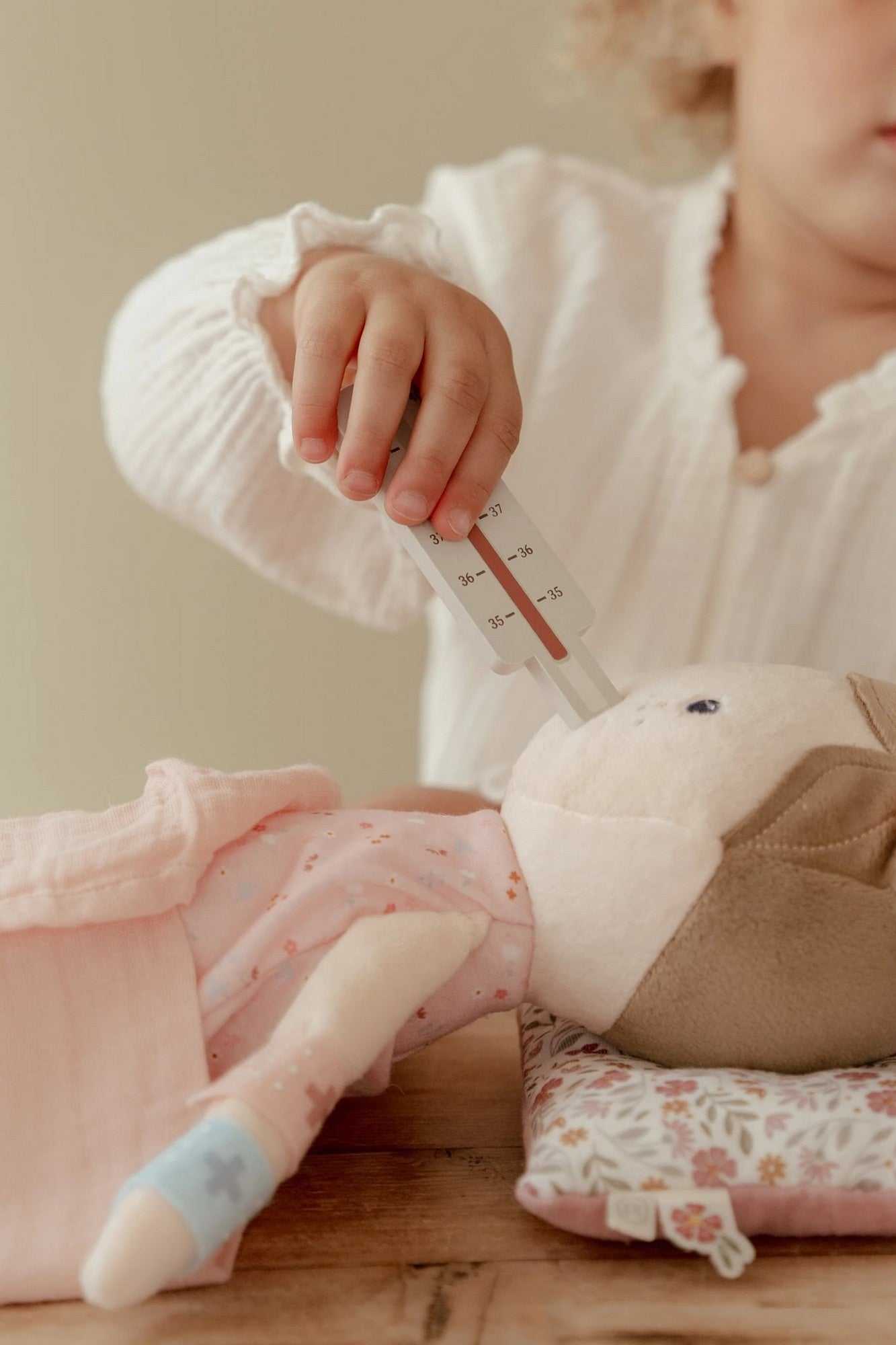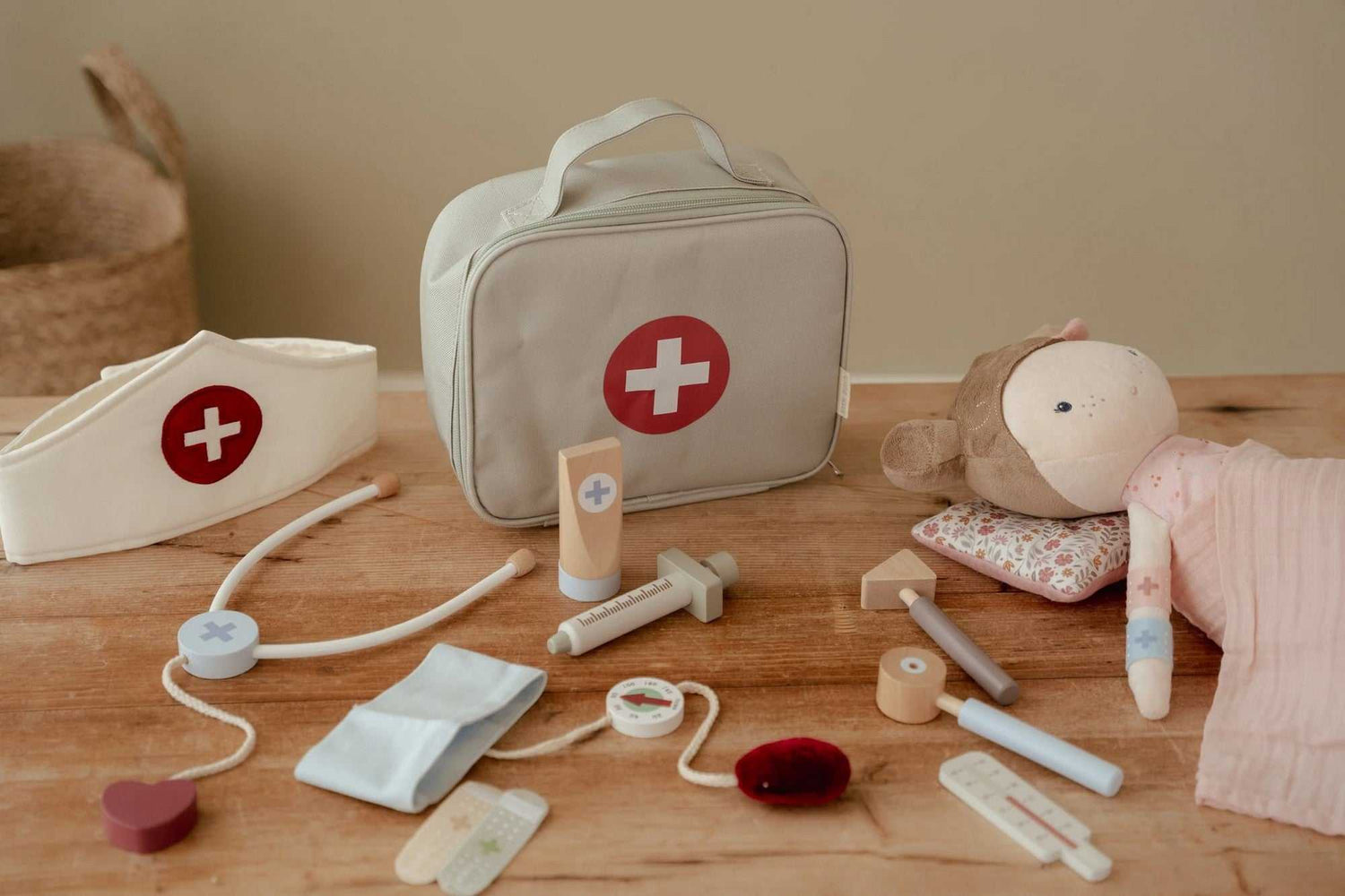 „Der nächste Patient bitte!“ – mit diesem liebevoll gestalteten Arztset von Little Dutch, aus Holz beginnt das Rollenspiel voller Fürsorge und Fantasie. In der hochwertigen Stofftasche steckt alles, was kleine Ärztinnen und Ärzte für eine gute Behandlung brauchen: Thermometer, Spritze, Pflaster, Stethoskop, Blutdruckmessgerät – sogar eine passende Doktorhaube ist dabei.