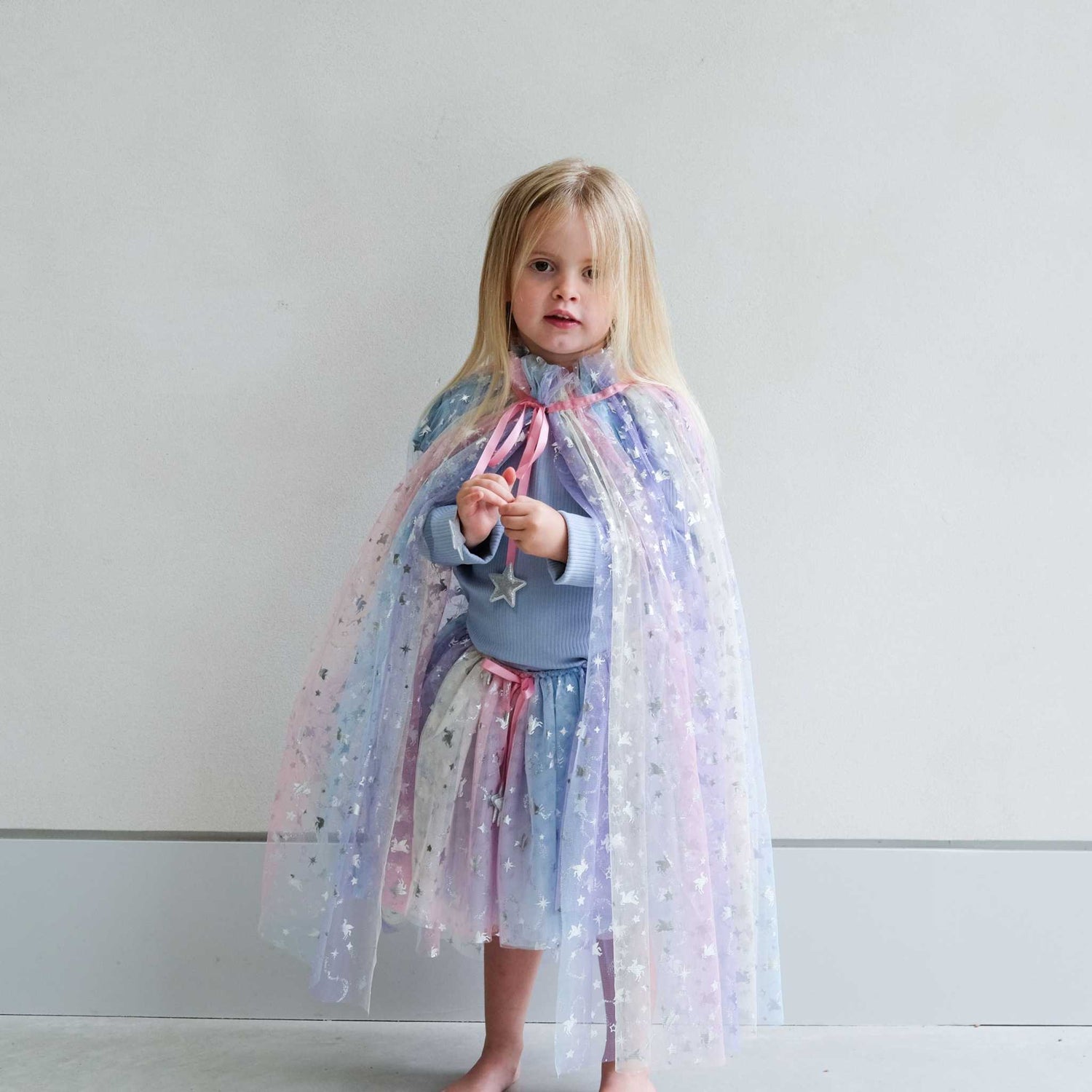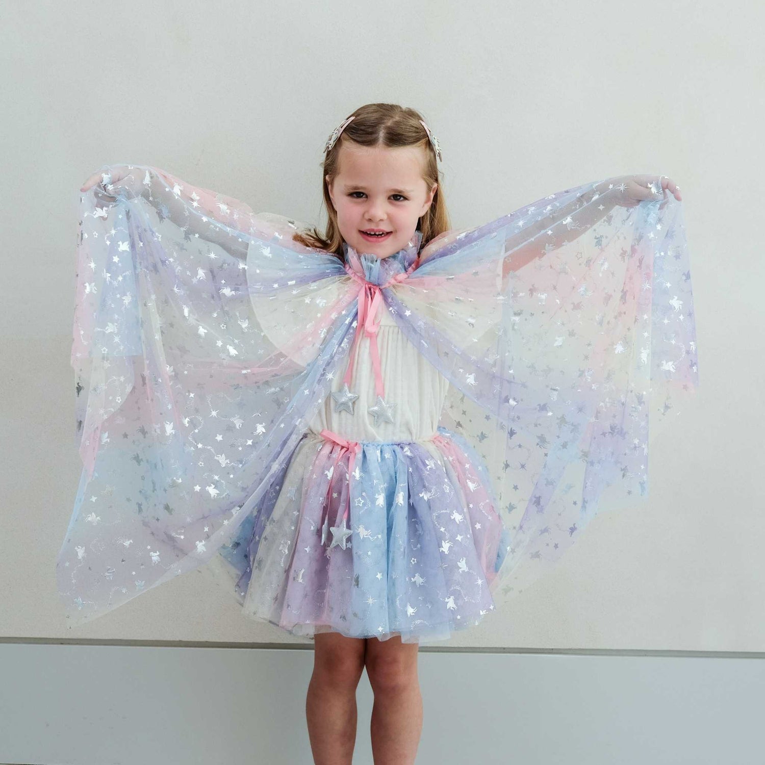 Das Tutu besteht aus mehreren Lagen weichem, fließendem Tüll und hat einen faszinierenden Ombre-Effekt, der durch ein Spektrum wunderschöner Farbnuancen verläuft, die die Essenz eines magischen Einhorns einfangen. Jede Schicht ist mit glänzenden Sternen verziert, die glitzern und funkeln und jeder Drehung und jedem Tanz einen zusätzlichen Hauch von märchenhaftem Charme verleihen. Der elastische Bund sorgt für einen bequemen Sitz. Ergänzt wird der Bund durch ein zartes rosa Satinband, das nicht nur verstellbar ist, sondern auch mit goldenen Sternenanhängern verziert ist. Dieses durchdachte Design-Detail verleiht dem Kleid einen zusätzlichen Hauch von Eleganz und Skurrilität und macht es zu einem auffälligen Stück für jeden Anlass.