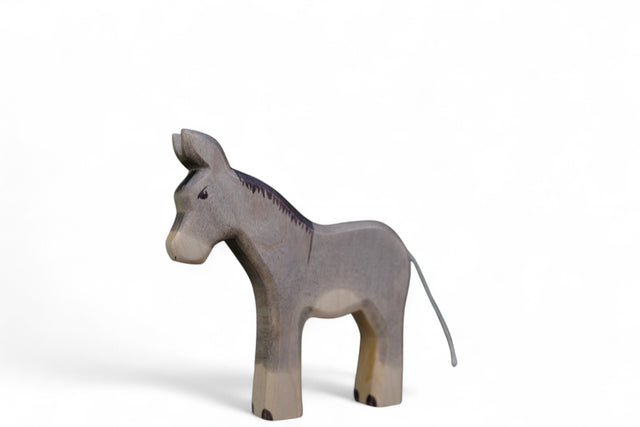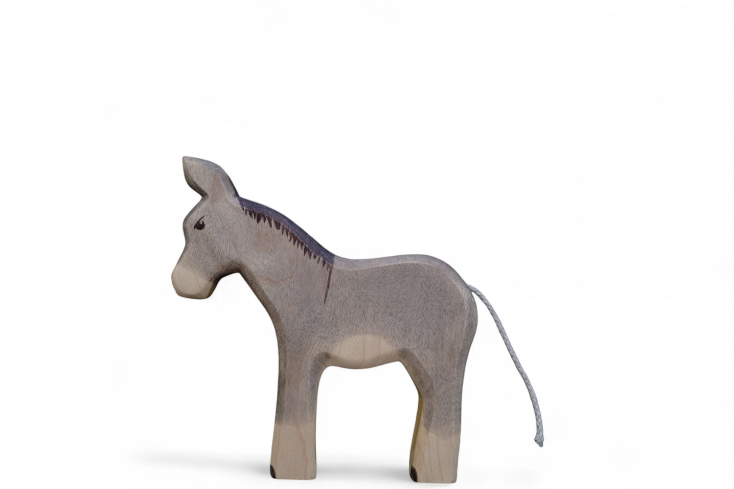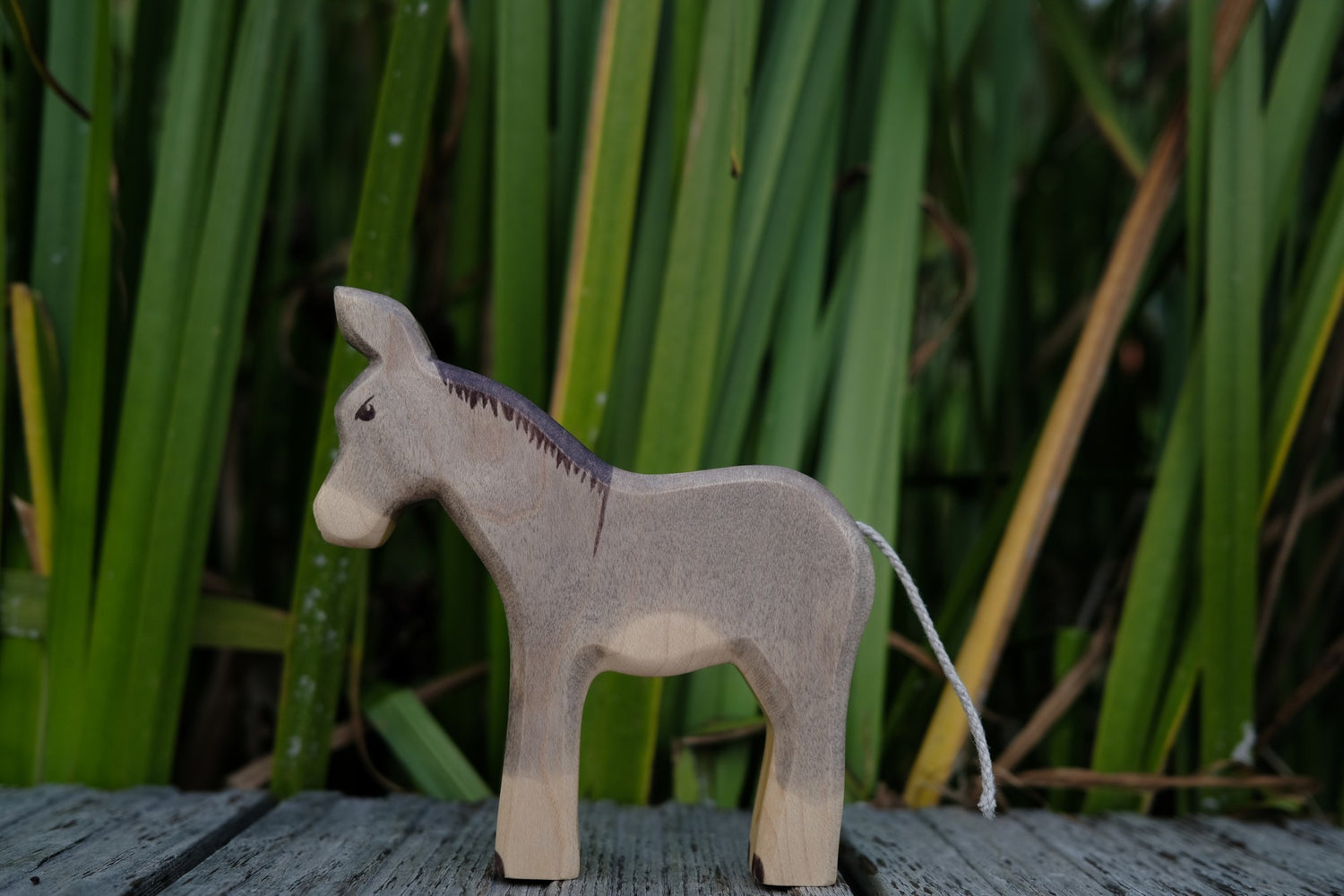 Der HolzWald Esel hat graues Fell und große, aufgestellte Eselsohren.