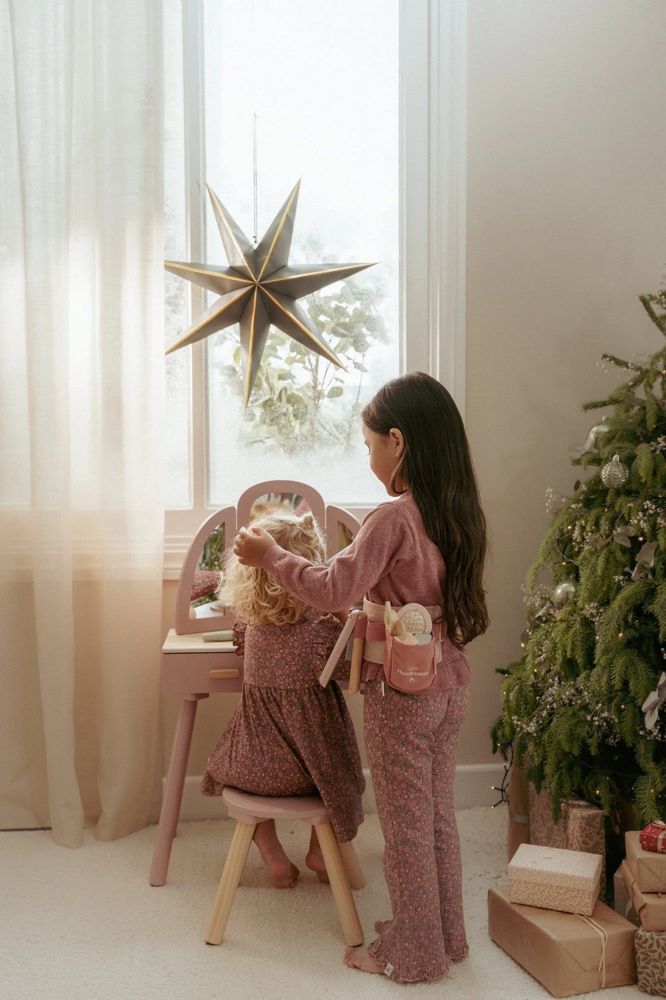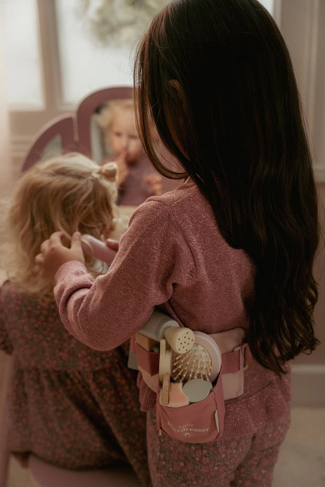 Das Modell „Holzfriseurset mit Hüftgürtel“ von Little Dutch, bringt kleinen Styling-Profis alles mit, was für kreative Friseurspiele gebraucht wird. Der verstellbare rosa Hüftgürtel ist mit realistischen Accessoires ausgestattet: Spielzeugschere, Föhn, Glätteisen, Haarschneider, Bürste, Shampoo, Haarspray und einem Spiegel.