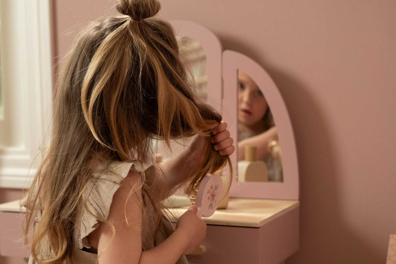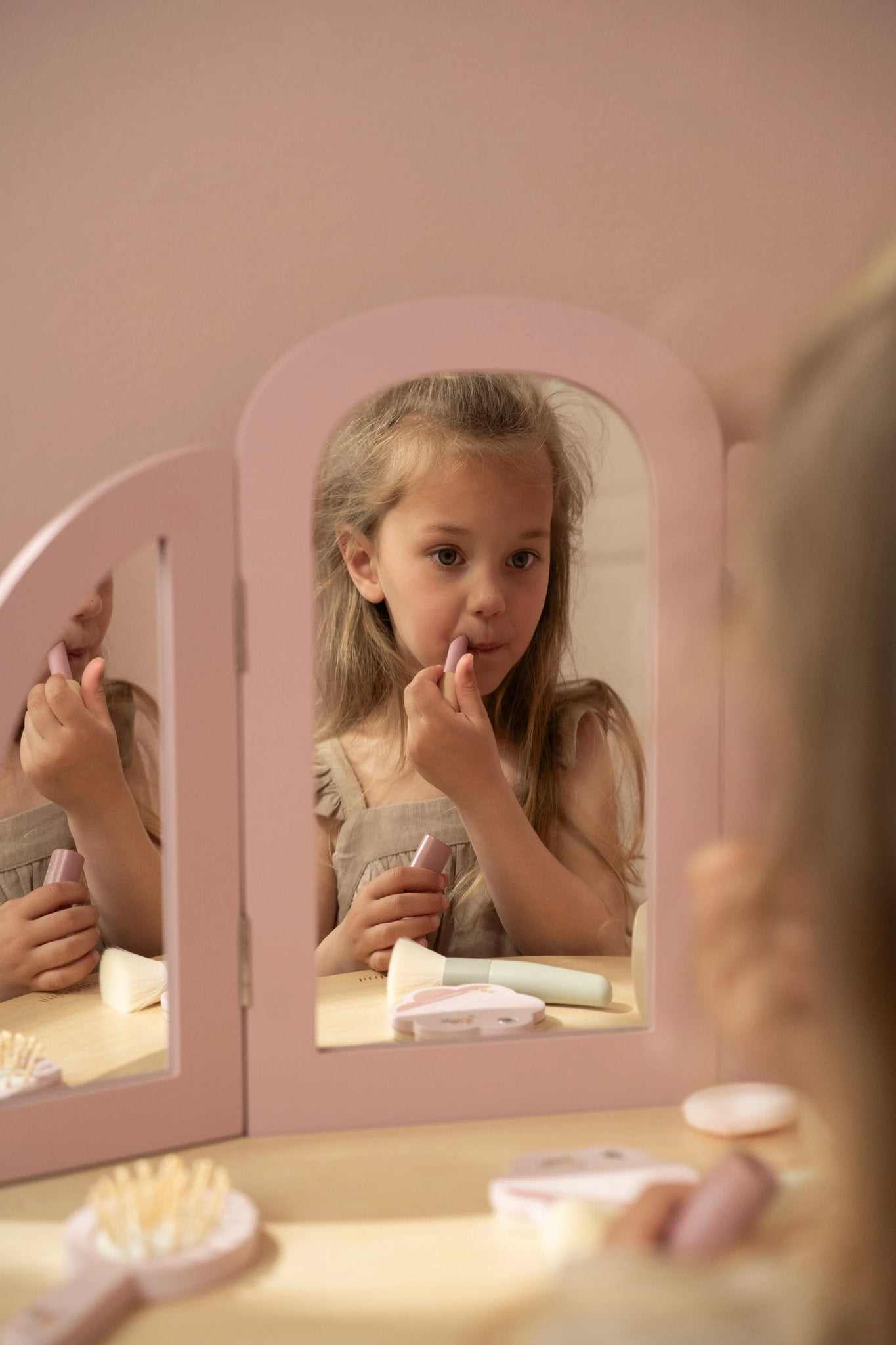 Mit seinem eleganten dreiteiligen Spiegel ermöglicht er es den Kindern, sich von allen Seiten zu bewundern und sich in ihrer Fantasiewelt zu verlieren.