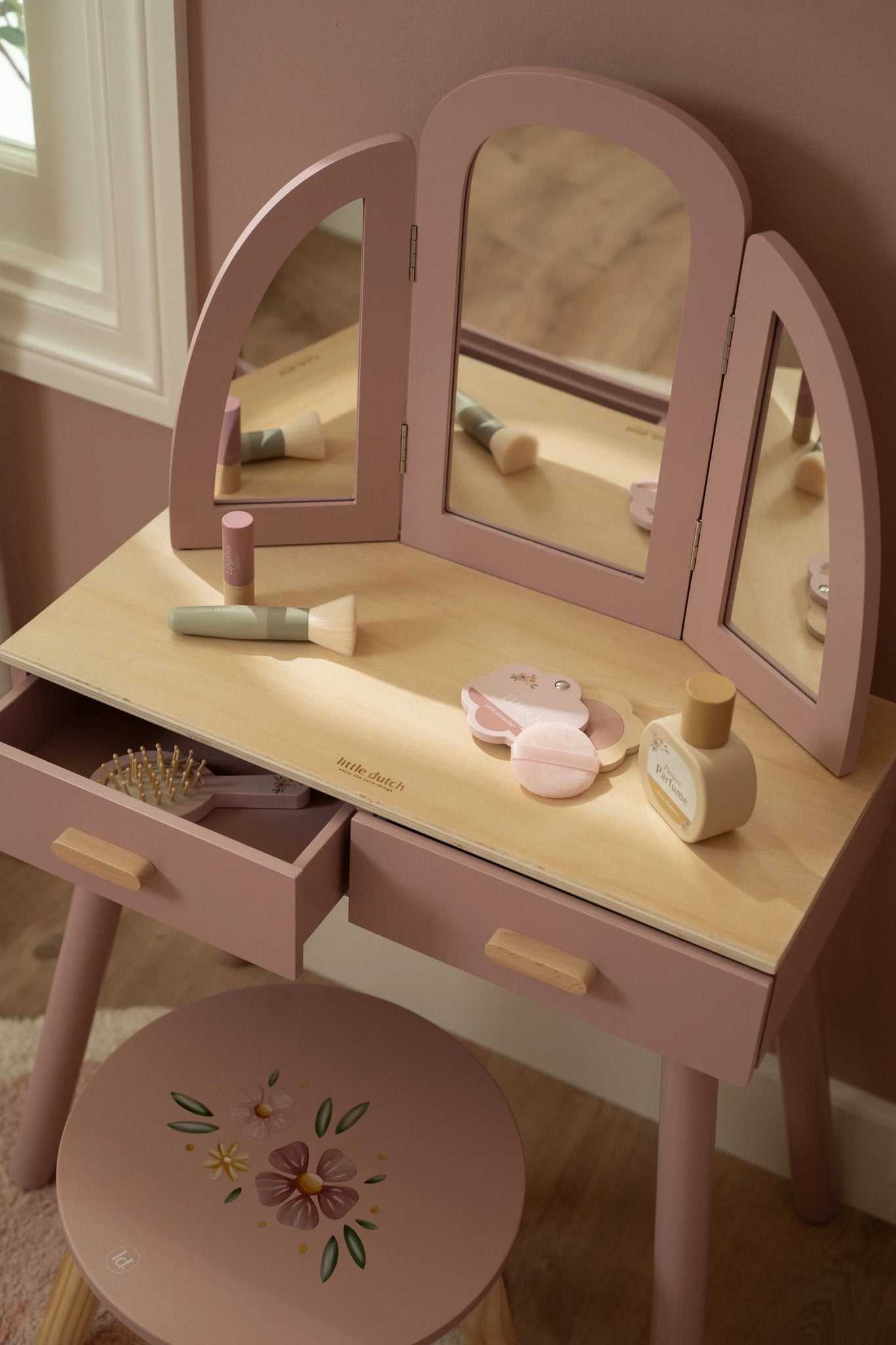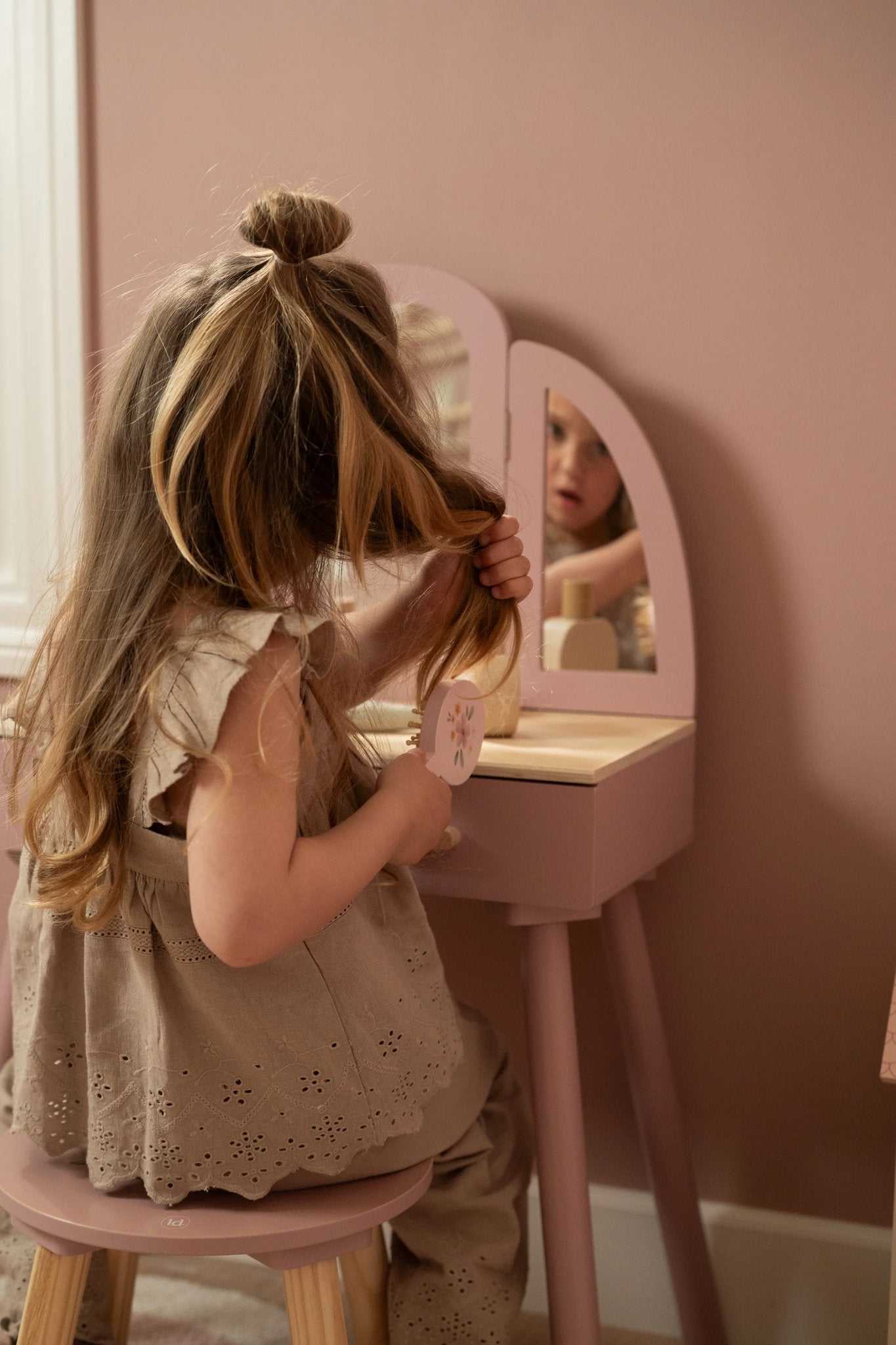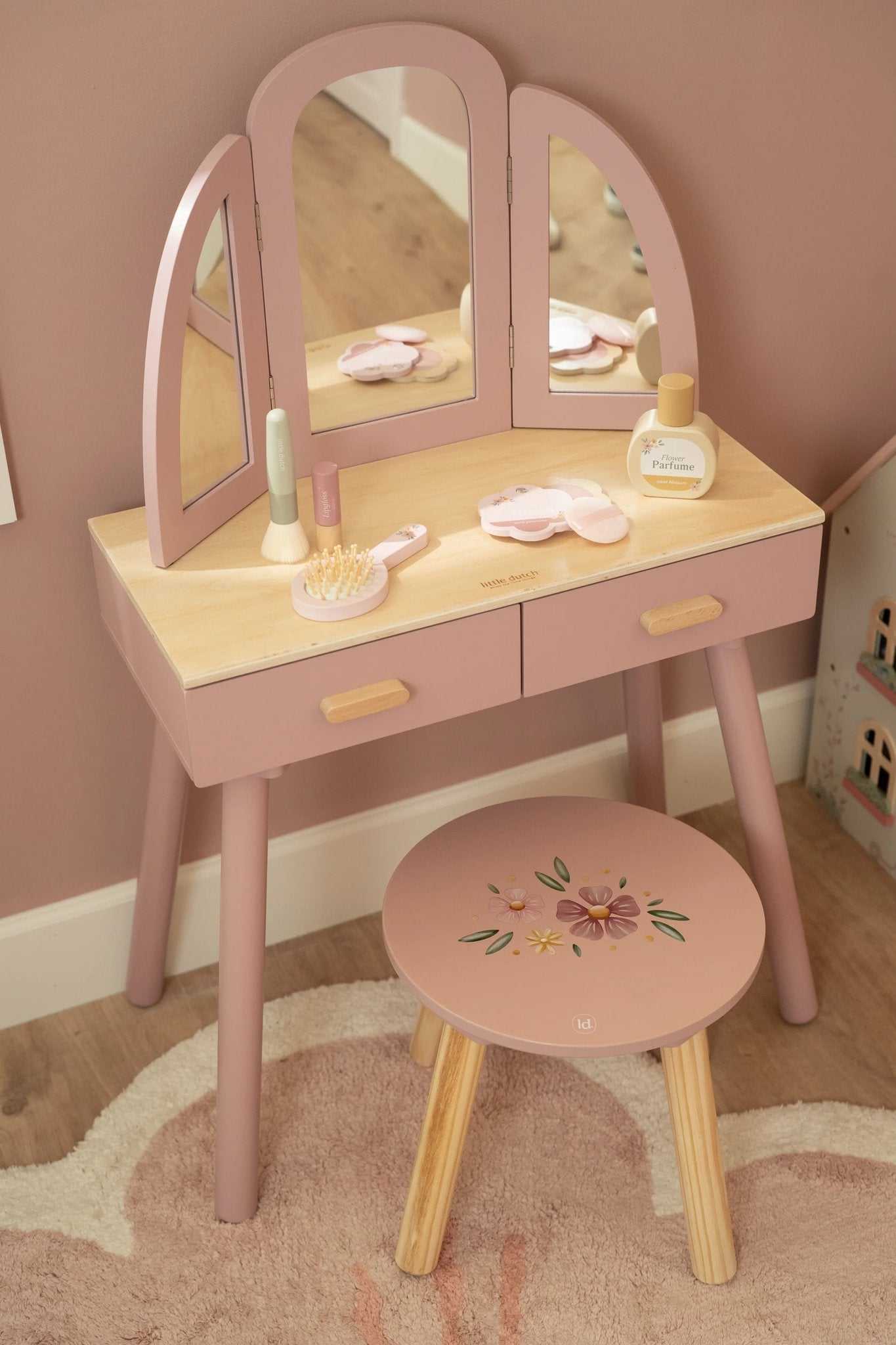 Der Frisiertisch von Little Dutch ist ein wunderschönes Möbelstück aus Holz, das speziell für kleine Mädchen entworfen wurde, um sich wie echte Prinzessinnen zu fühlen.