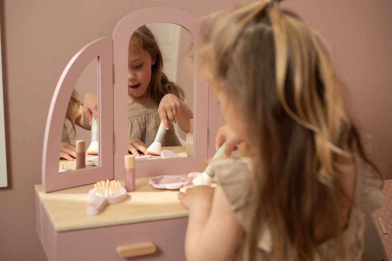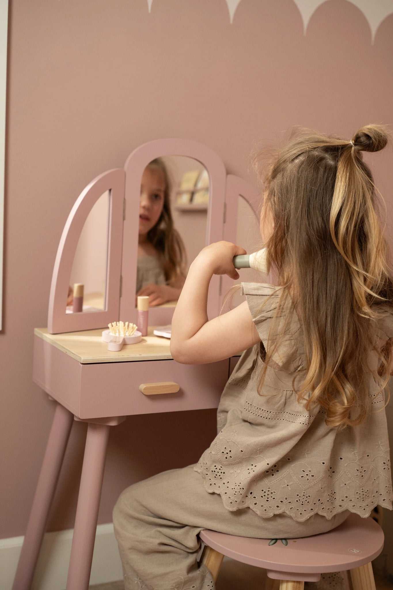 Der Frisiertisch ist in einem zarten Rosa gehalten, was ihn besonders mädchenhaft und ansprechend macht.