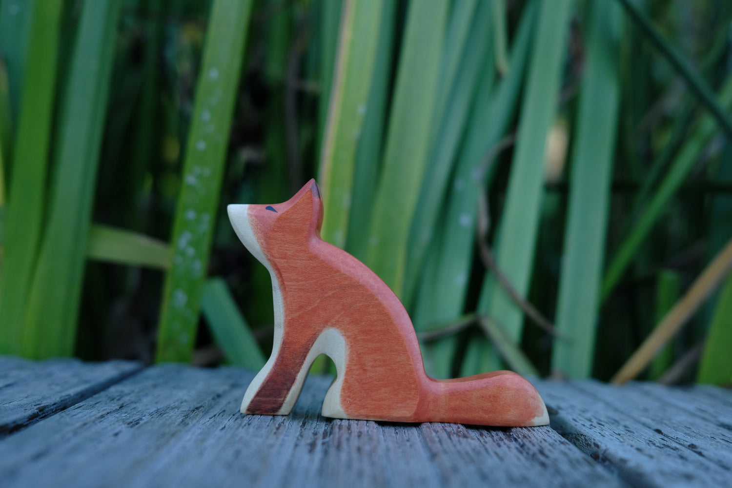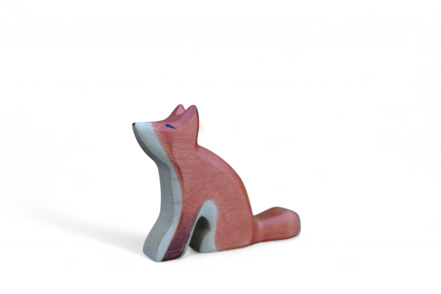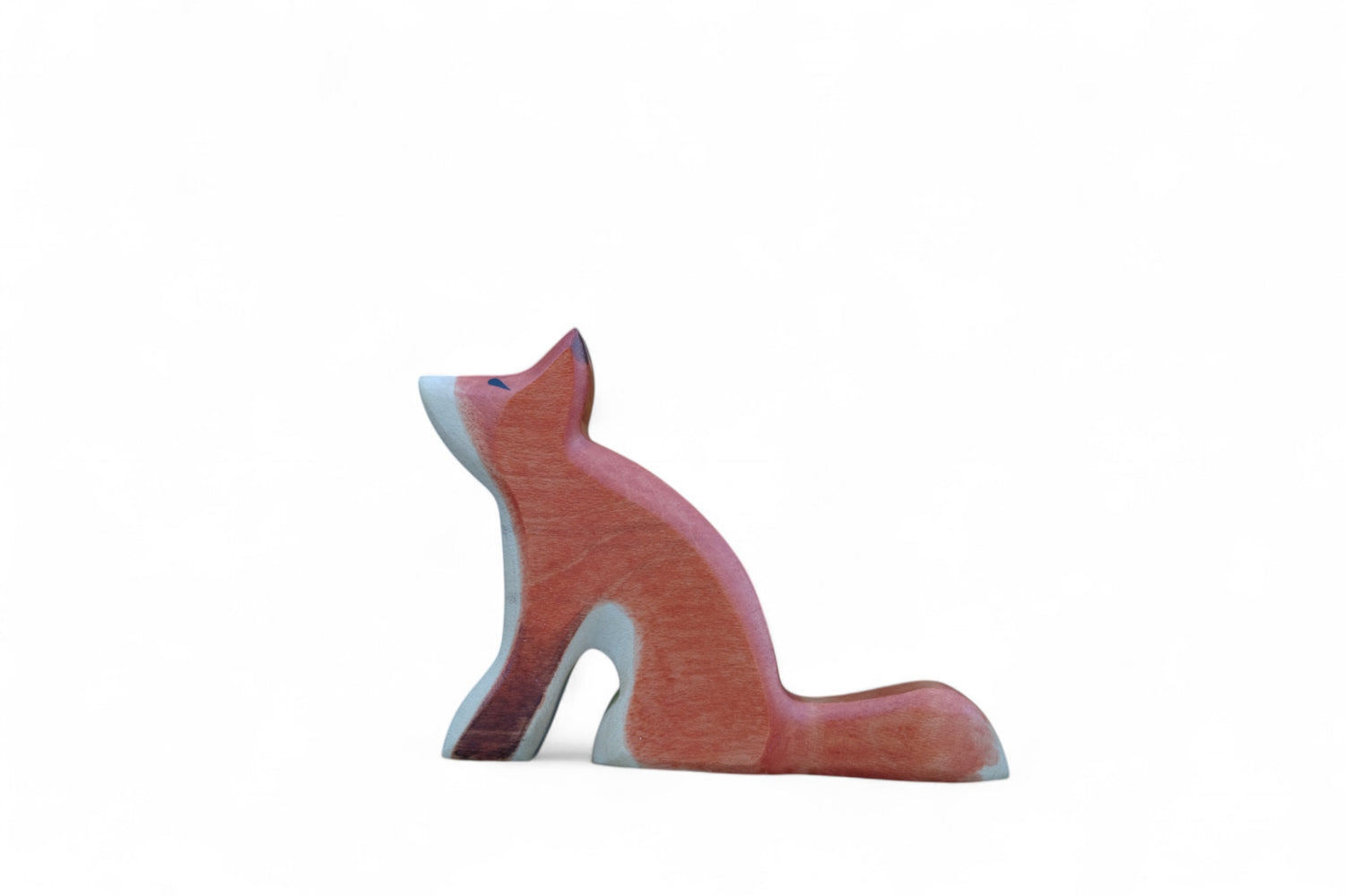 Der schlaue HolzWald Fuchs hat rötlich braunes Fell, sitzt auf seinen Hinterpfoten und hat einen neugierig in die Höhe gereckten Kopf.