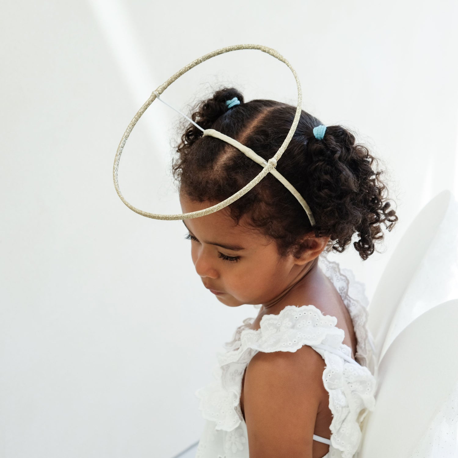 Der Haarreif ist für Kinder von 3 bis 10 Jahren geeignet und mit goldenem Band umwickelt. Der goldglitzernde „Heiligenschein“ ist sicher mit verstellbarem Draht befestigt und misst ca. 20 cm in der Breite.