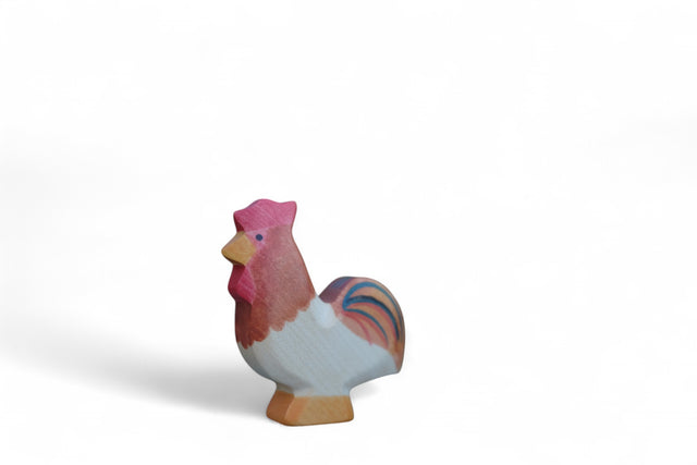 Der HolzWald Hahn präsentiert stolz sein wunderschönes Federkleid, während er auf dem Bauernhof herum spaziert.