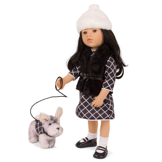 Die Götz Stehpuppe Happy Kidz Kopenhagen - Signature Edition - überzeugt mit hochwertiger Verarbeitung und stilvollem Design. Sie trägt ein klassisches Kleid in schwarz-weißem Karo, kombiniert mit einer eleganten schwarzen Plüschweste und einer weißen Plüschmütze. Schwarze Spangenschuhe runden das Outfit harmonisch ab. Ihr treuer Begleiter, ein Plüschhund, ergänzt das Set. Eine exklusive Puppe mit beweglichen Gelenken – ideal für Sammler und Liebhaber hochwertiger Puppen.