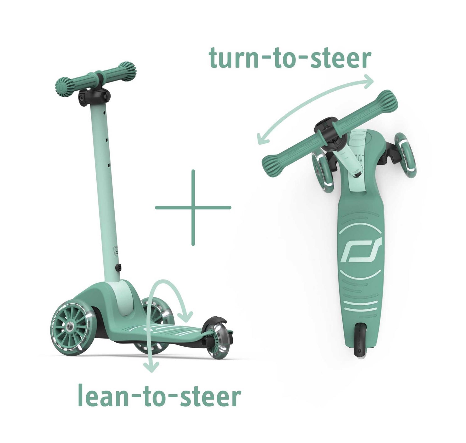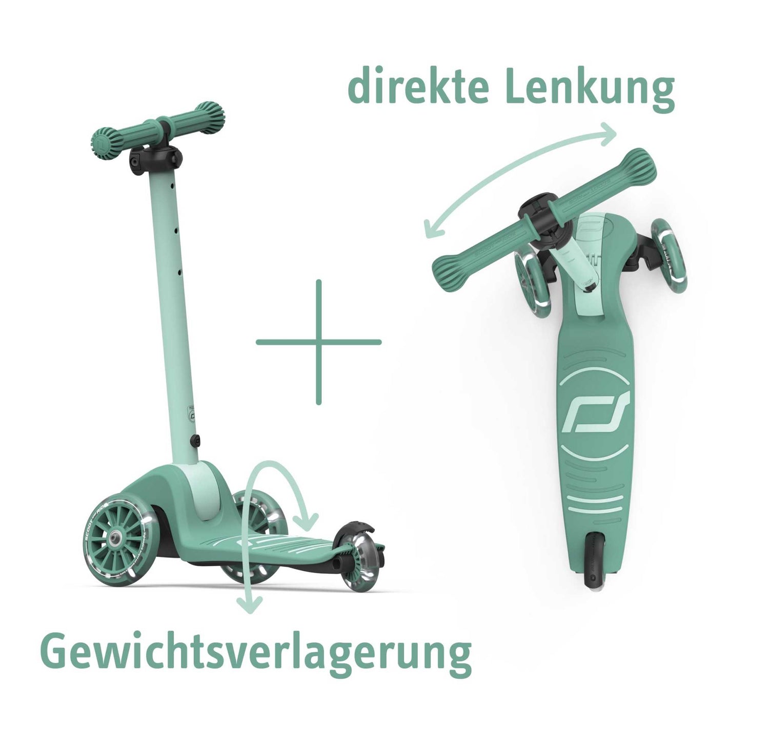 Das besondere Highlight: Die 2-in-1-Lenkung – der Roller lässt sich sowohl klassisch über das Drehen der Lenkstange als auch intuitiv über Gewichtsverlagerung steuern. Das sorgt für eine besonders einfache und sichere Handhabung – gerade für Fahranfänger. Die Lenkstange ist 3-fach höhenverstellbar und wächst so über Jahre hinweg mit. Dank des neuen Faltmechanismus kann die Lenkstange schnell und ohne Werkzeug nach hinten geklappt werden. Ideal zum Verstauen oder Transportieren. Die weiß leuchtenden LED-Vorderräder bringen nicht nur Spaß, sondern sorgen auch für bessere Sichtbarkeit bei Dämmerung – ganz ohne Batterien.