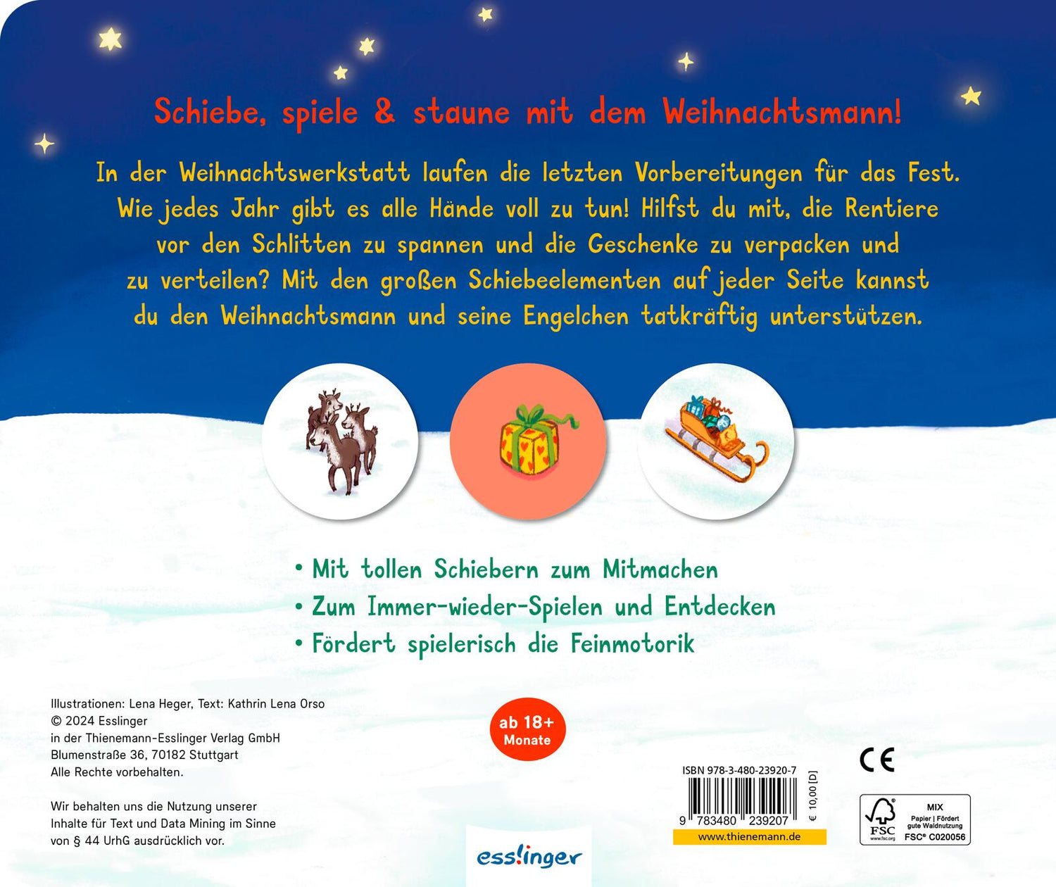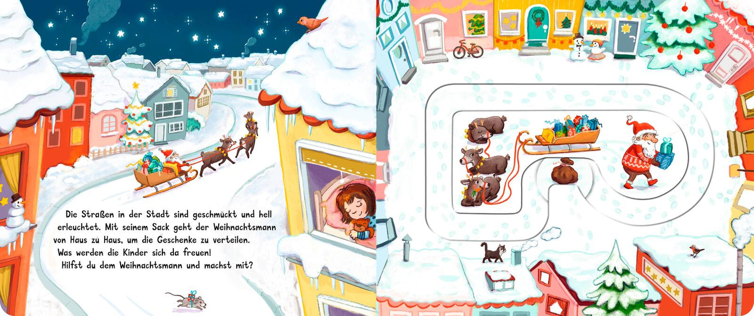Weihnachten steht vor der Tür, und in der Weihnachtswerkstatt laufen die letzten Vorbereitungen. Wie jedes Jahr haben der Weihnachtsmann und seine Engelchen alle Hände voll zu tun! Nur gut, dass die Allerkleinsten sie mit dieser tollen Mitmachpappe tatkräftig unterstützen können. Mit den großen Schiebe-Elementen auf jeder Seite verstauen sie die Geschenke im Sack, spannen das Rentier vor, schieben den Schlitten durch den weihnachtlichen Wald und legen die Geschenke unter den geschmückten Baum.