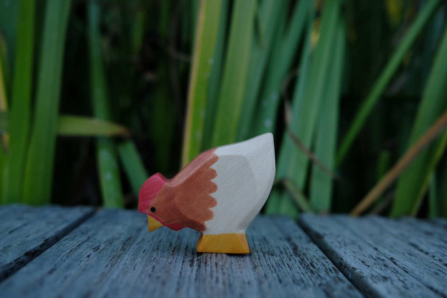 Das HolzWald Huhn hat einen roten Kamm und einen spitzen orangenen Schnabel.