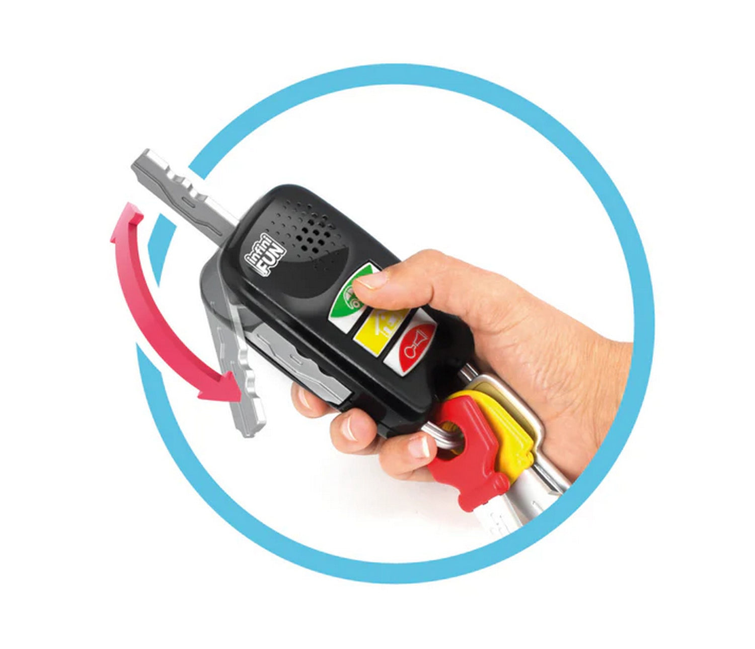 Stell dir vor, du bist im Auto oder auf dem Weg nach Hause und löst viele lustige Geräusche aus, indem du auf die drei Knöpfe drückst… Schau mal! Wenn du auf den grünen Knopf drückst, kommt der Autoschlüssel heraus!
