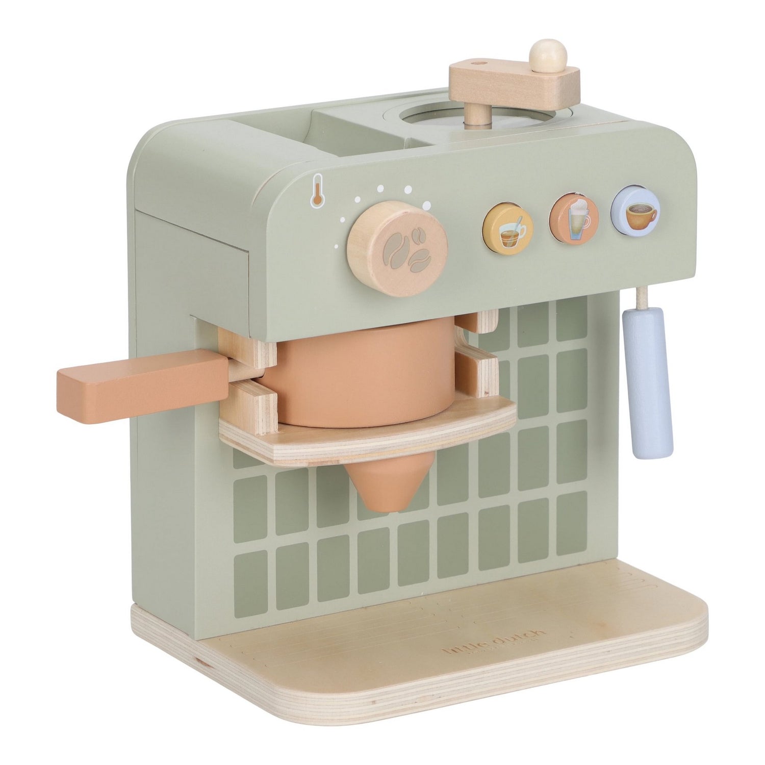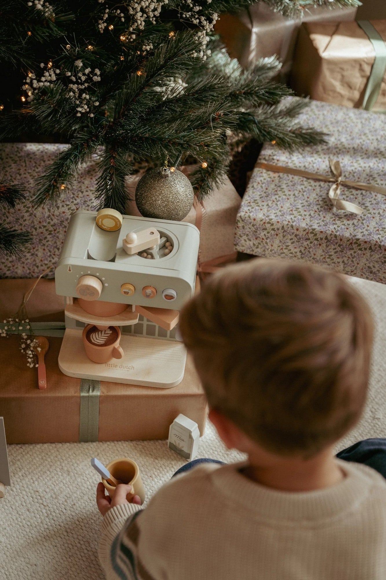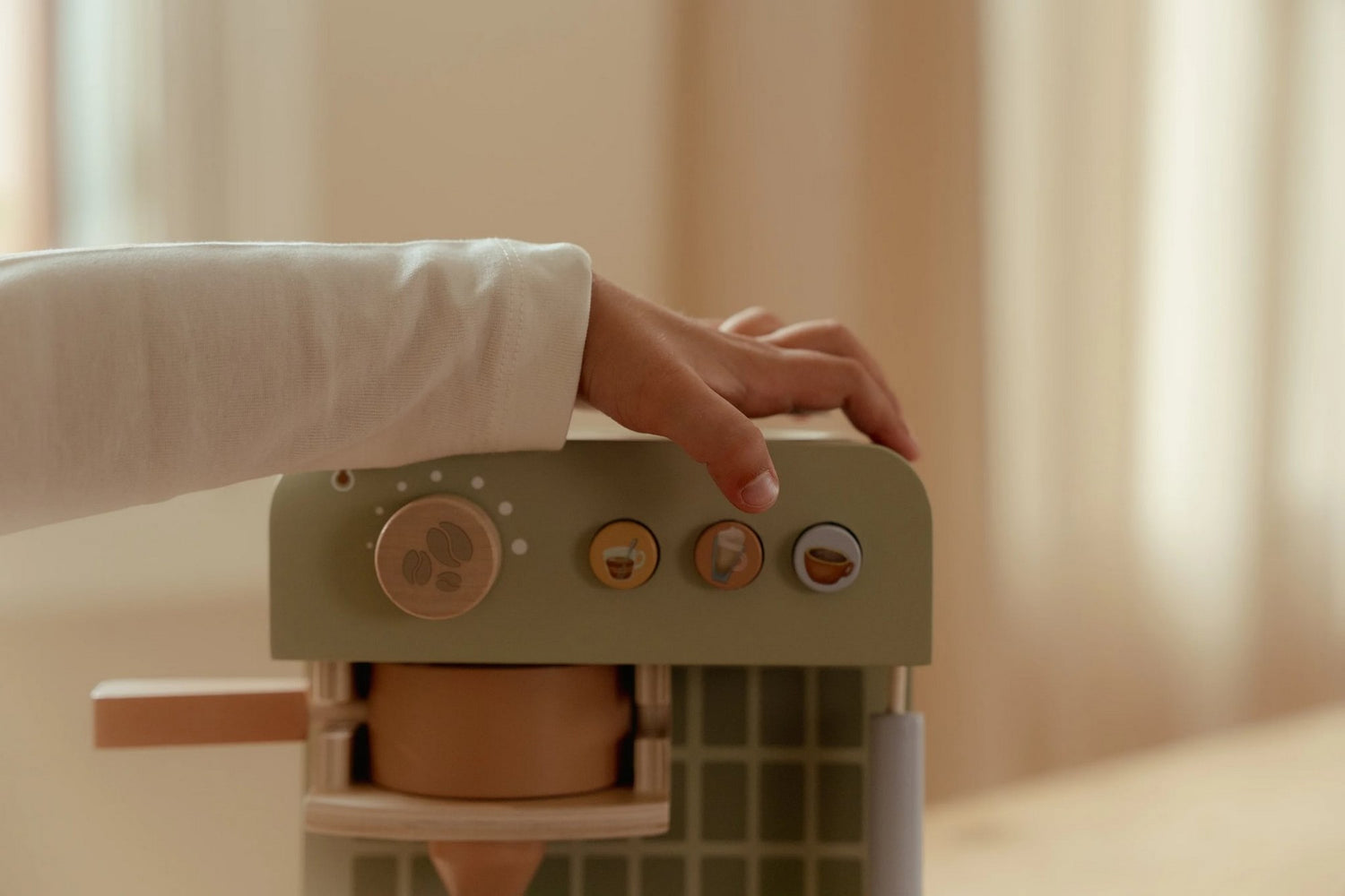 Das Modell „Kaffeemaschine aus Holz“ von Little Dutch, bringt echtes Barista-Feeling ins Spielzimmer. Kleine Kaffeefans können spielerisch Bohnen mahlen, Kaffeekapseln einsetzen und ihre Getränke mit einem Löffel umrühren – ganz wie im Lieblingscafé.