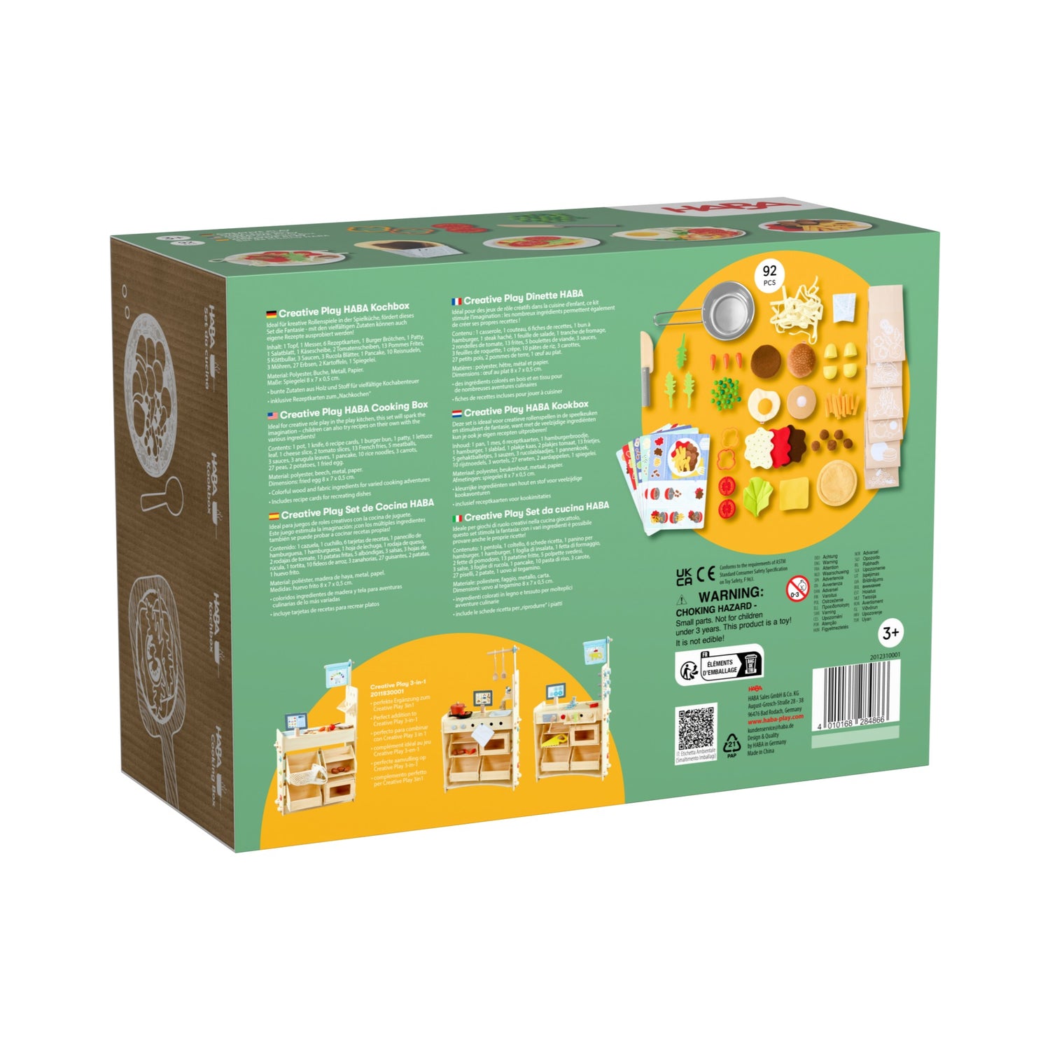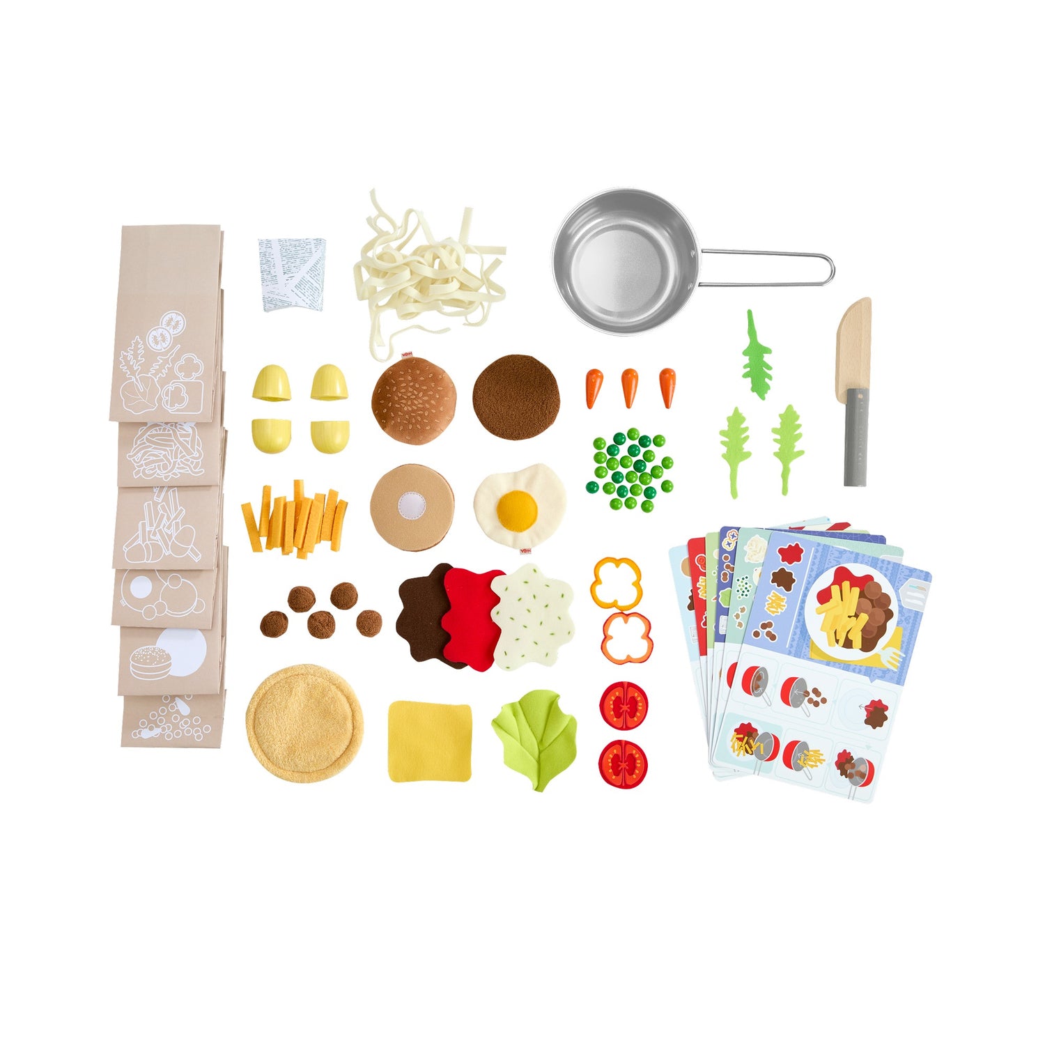 Mit diesem liebevoll gestalteten Einkaufsnetz mit Lebensmitteln von Haba, wird jeder Marktausflug zum fantasievollen Rollenspiel. Ob Croissant, Käse, Möhren oder Pesto – die Kombination aus Holz- und Stoffelementen lädt dazu ein, Alltagssituationen nachzuspielen und erste Einkaufserlebnisse kreativ zu gestalten. Mit diesem spannenden Kochbox-Set wird das Kochen zum Abenteuer! Das Set enthält eine bunte Auswahl an Zutaten aus hochwertigem Holz und weichem Stoff, die es den Kindern ermöglichen, leckere Gerichte wie Burger mit Pommes, Wraps, Ramen oder Köttbullar mit frischem Gemüse und Kartoffeln zuzubereiten. Zusätzlich enthält das Set Rezeptkarten, die die Zubereitung der Gerichte bildlich darstellen und den kleinen Köchinnen und Köchen helfen, die Schritte nachzuahmen. Ideal für kreative Rollenspiele in der Spielküche, fördert dieses Set die Fantasie - mit den vielfältigen Zutaten können auch eigene Rezepte ausprobiert werden!