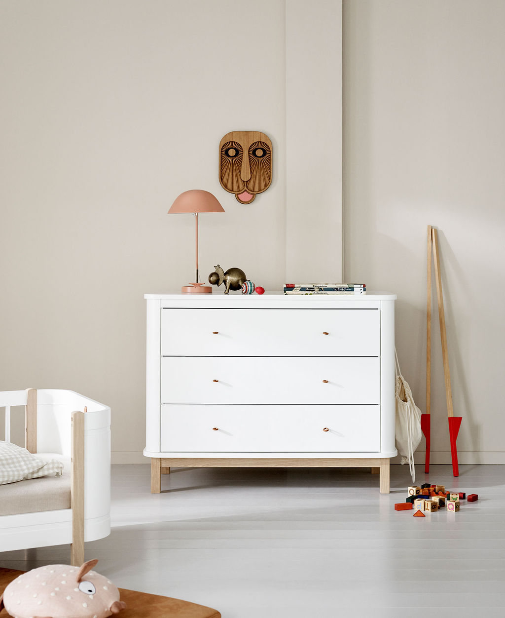 Die Wood Kommode mit ihren sanft abgerundeten Kanten – sowohl zur Wand hin als auch nach außen – bringt Wärme und natürliche Eleganz ins Kinderzimmer. Mit ihrem harmonischen Design wirkt sie leicht und freundlich – eine stilvolle Ergänzung, die sowohl funktional als auch ästhetisch überzeugt.
