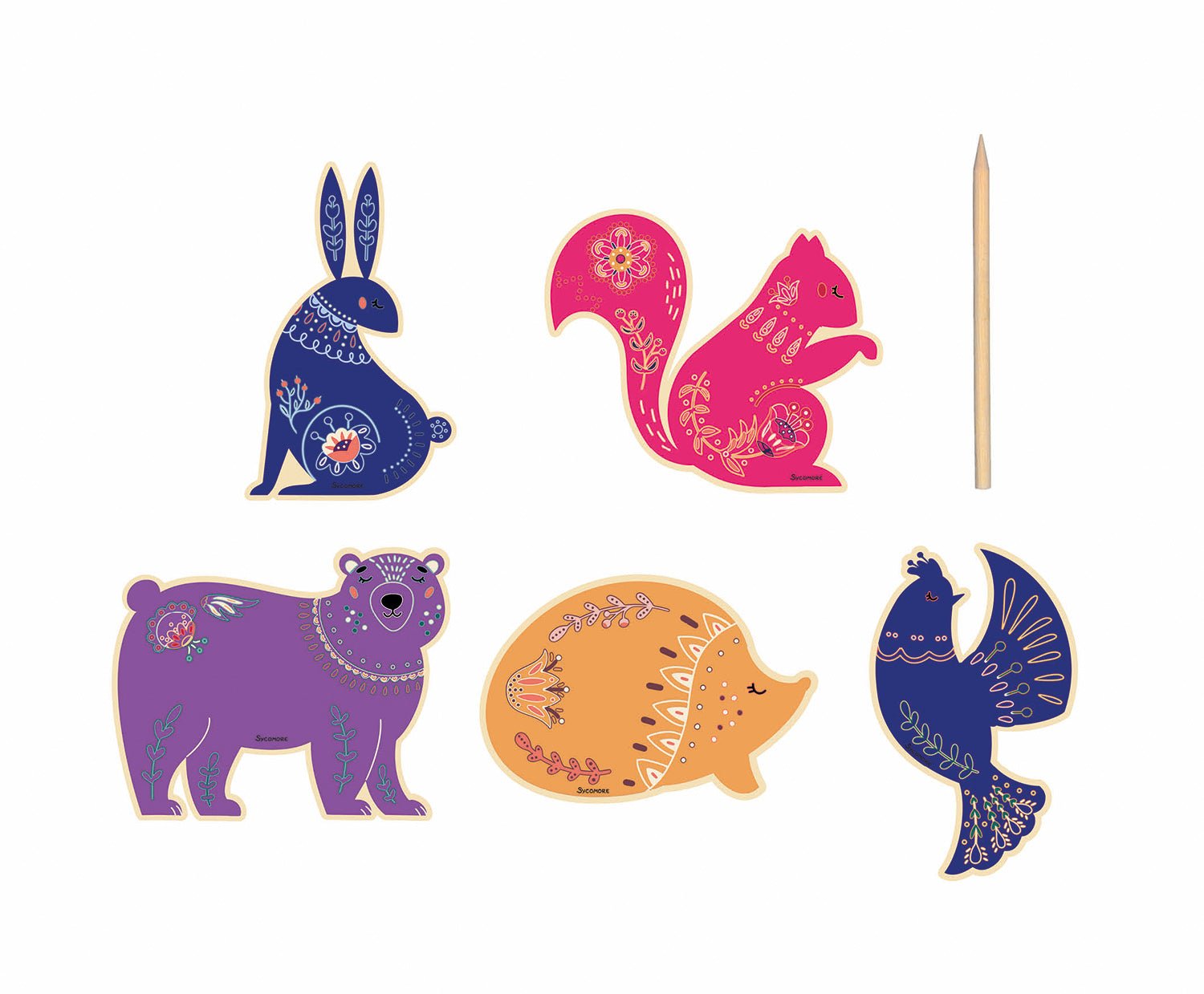 Die Packung enthält 5 niedliche Tiere mit einer bunten Oberfläche, die mit einem Bambusstift freigelegt werden können.