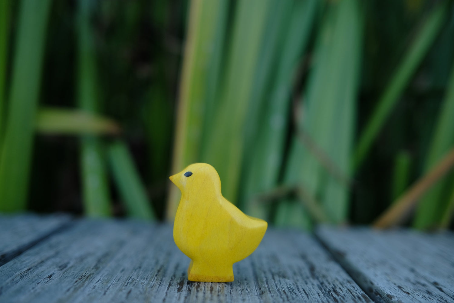 Das kleine HolzWald Küken hat ein sonnengelbes Federkleid und hüpft piepsend mit seinen Geschwisterchen über den Bauernhof.