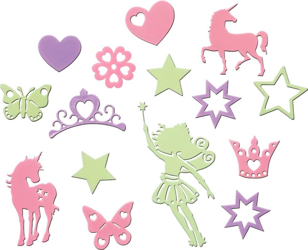 Das Set enthält insgesamt 16 Klebepunkte, mit denen die Elemente kinderleicht an Wänden, Decken oder Möbeln befestigt werden können.
