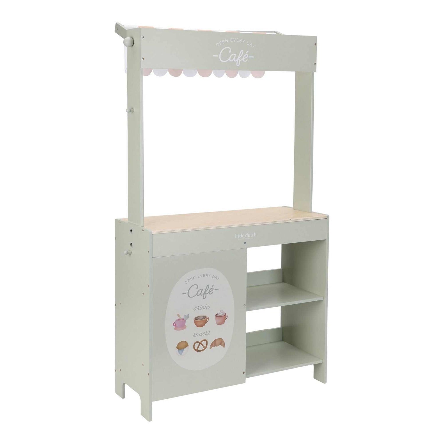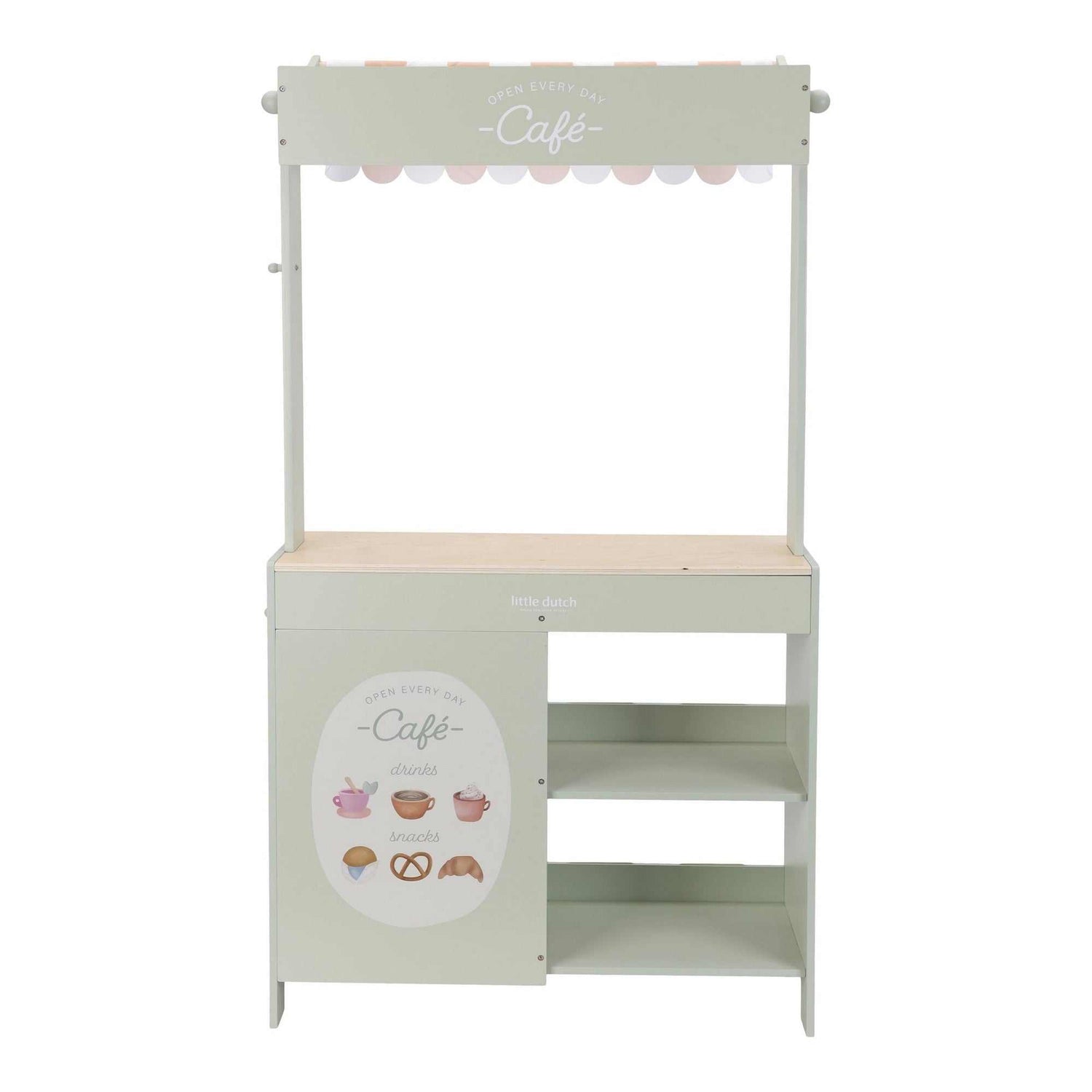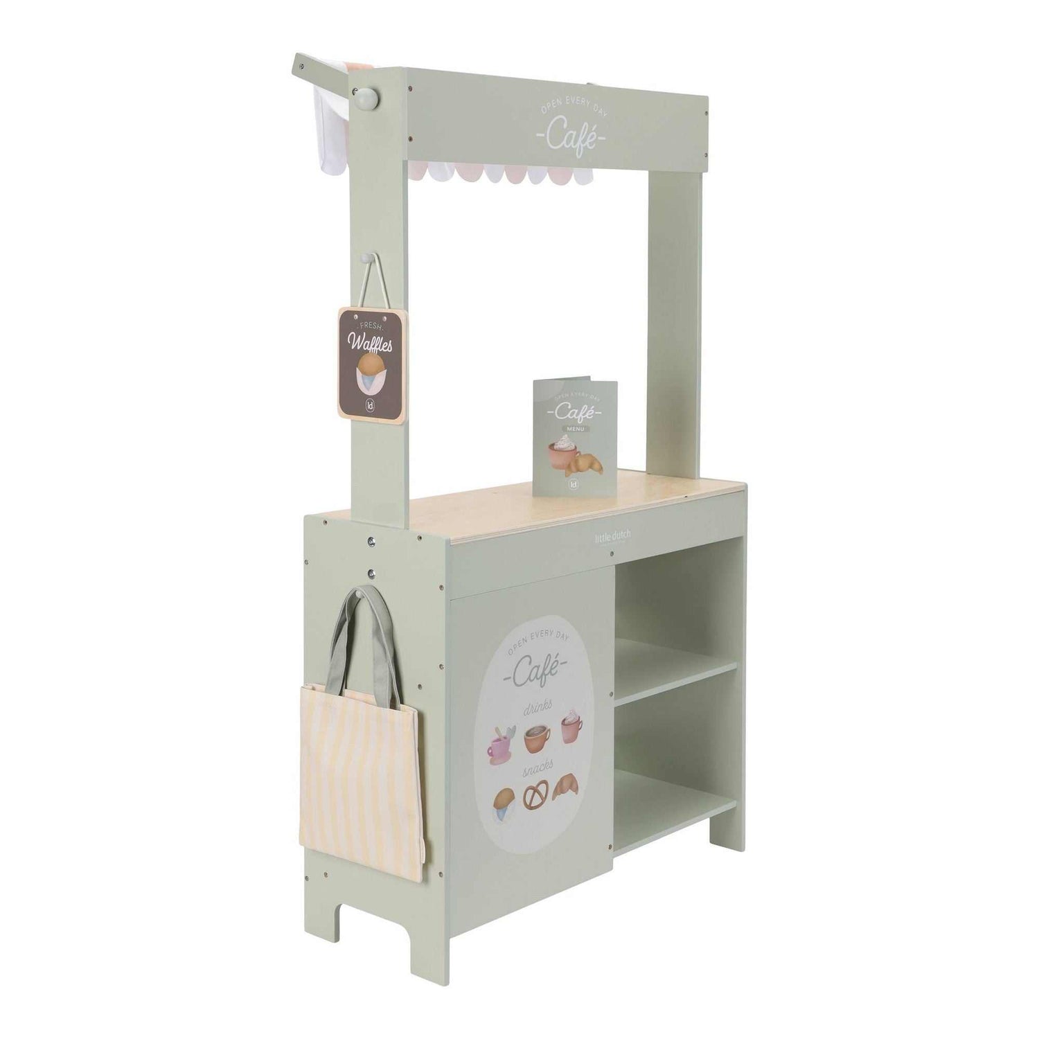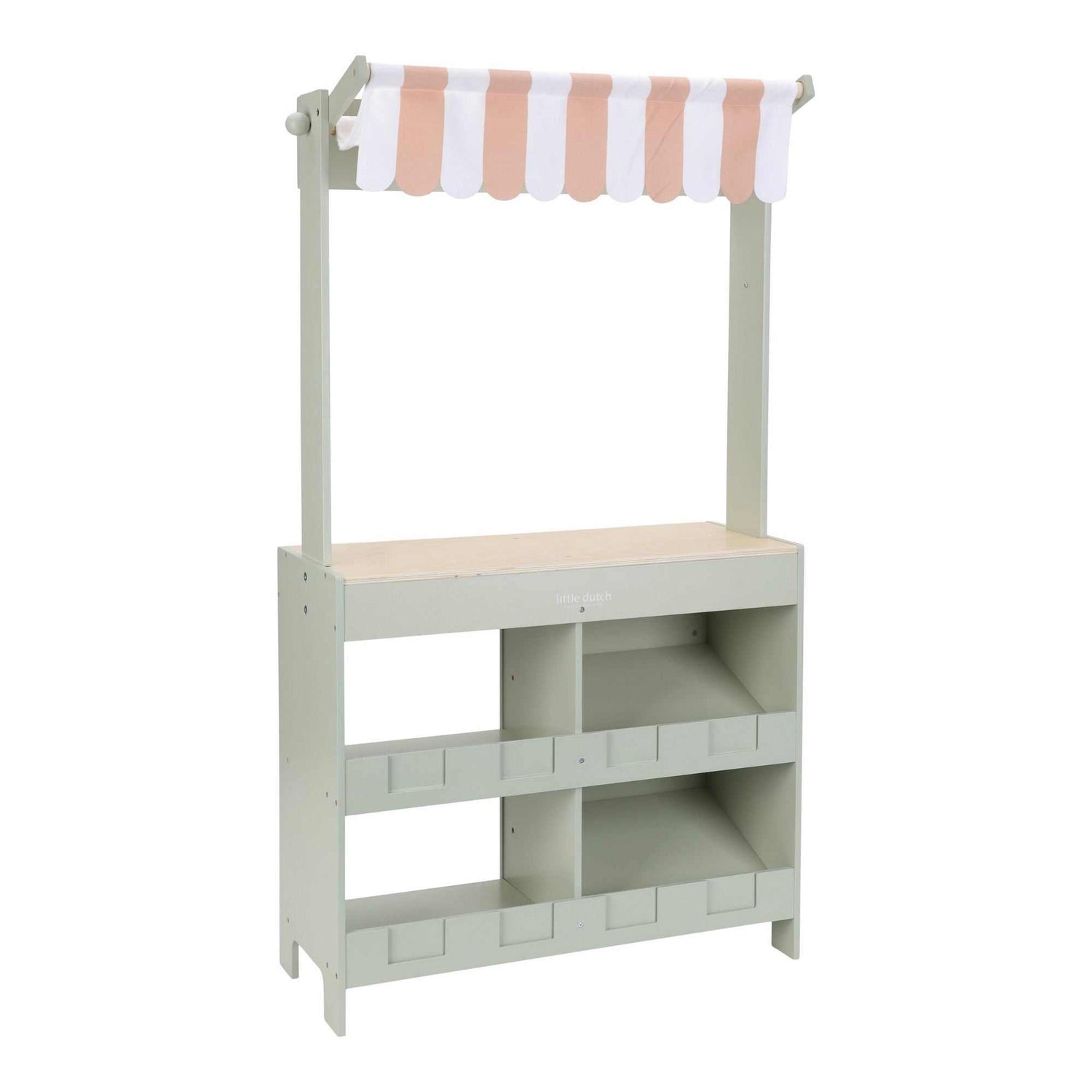 Willkommen auf dem Markt! Mit dem liebevoll gestalteten Modell „Marktstand & Café“ von Little Dutch, eröffnen Kinder ihren eigenen kleinen Laden – ob als Marktbude oder als charmantes Straßencafé. Das grüne Stoffdach sorgt für authentisches Marktflair, während Kreidetafel und beschriftete Karten eine ansprechende Präsentation der Produkte ermöglichen.