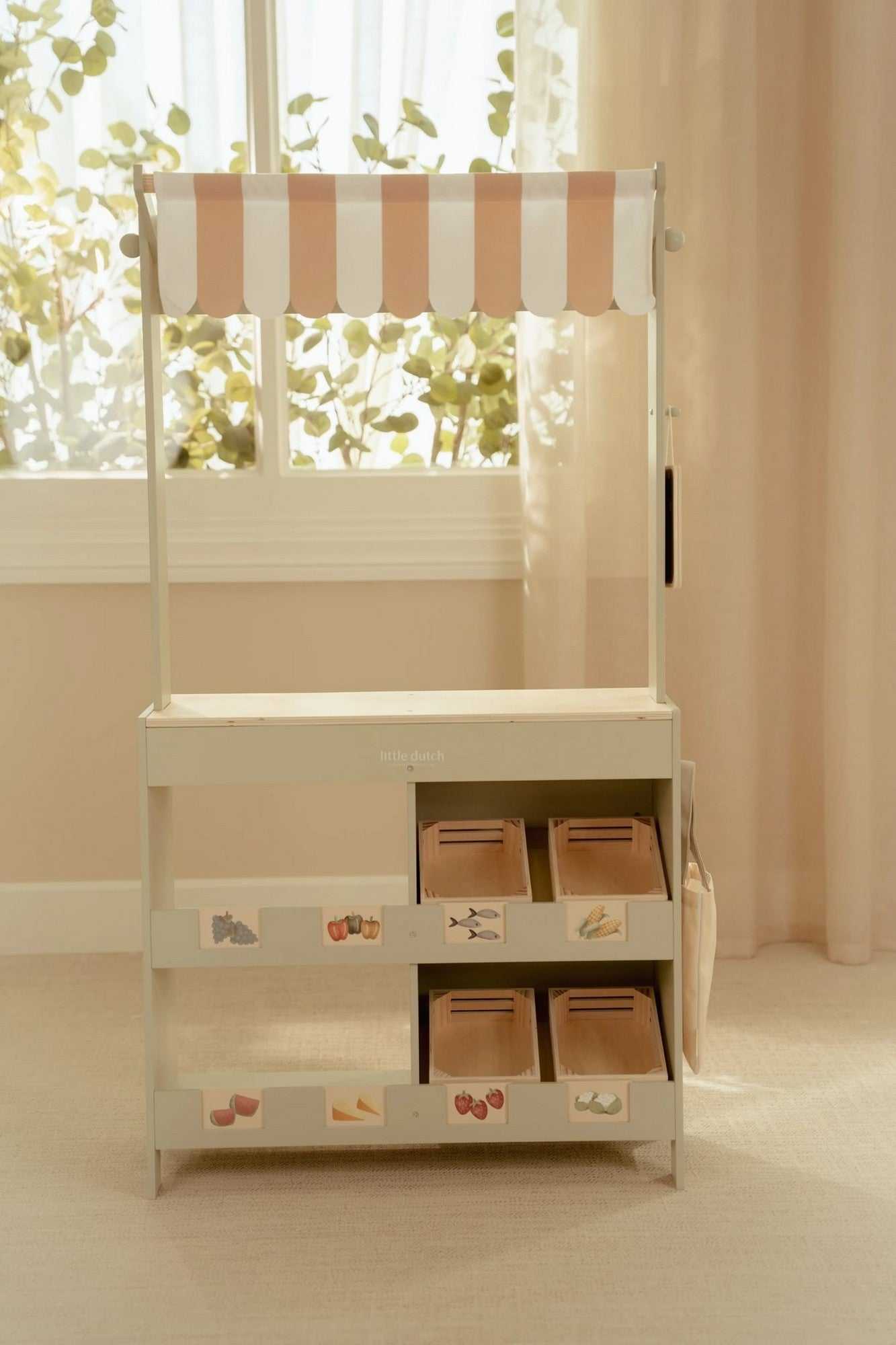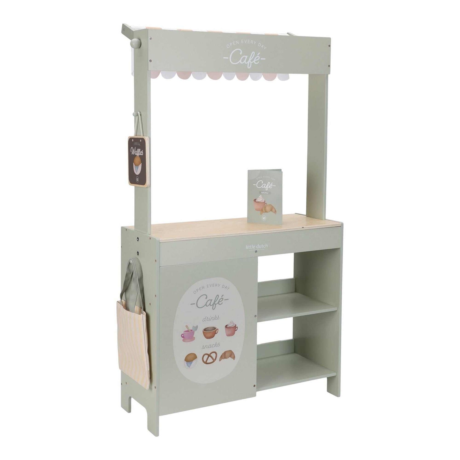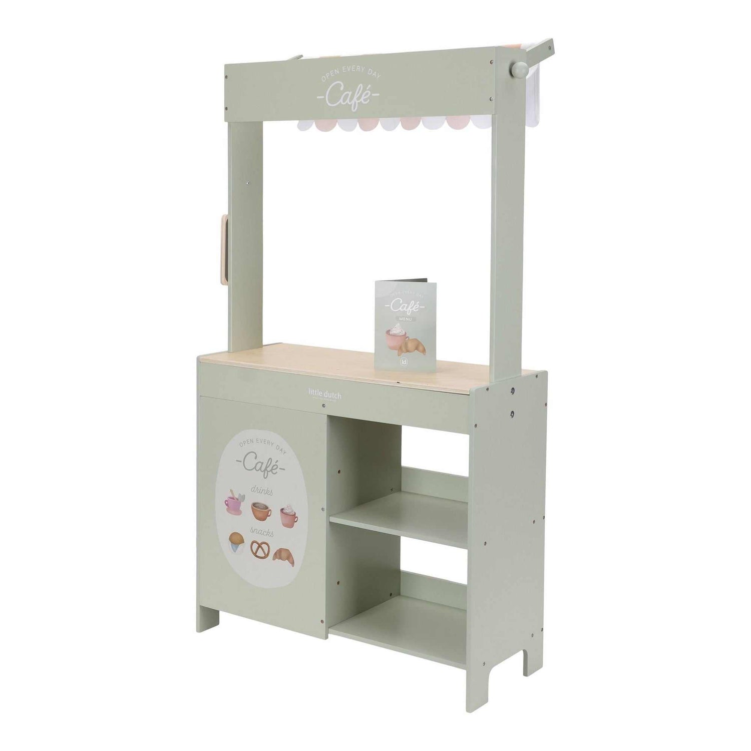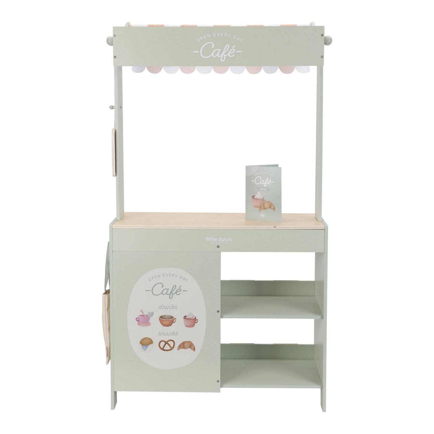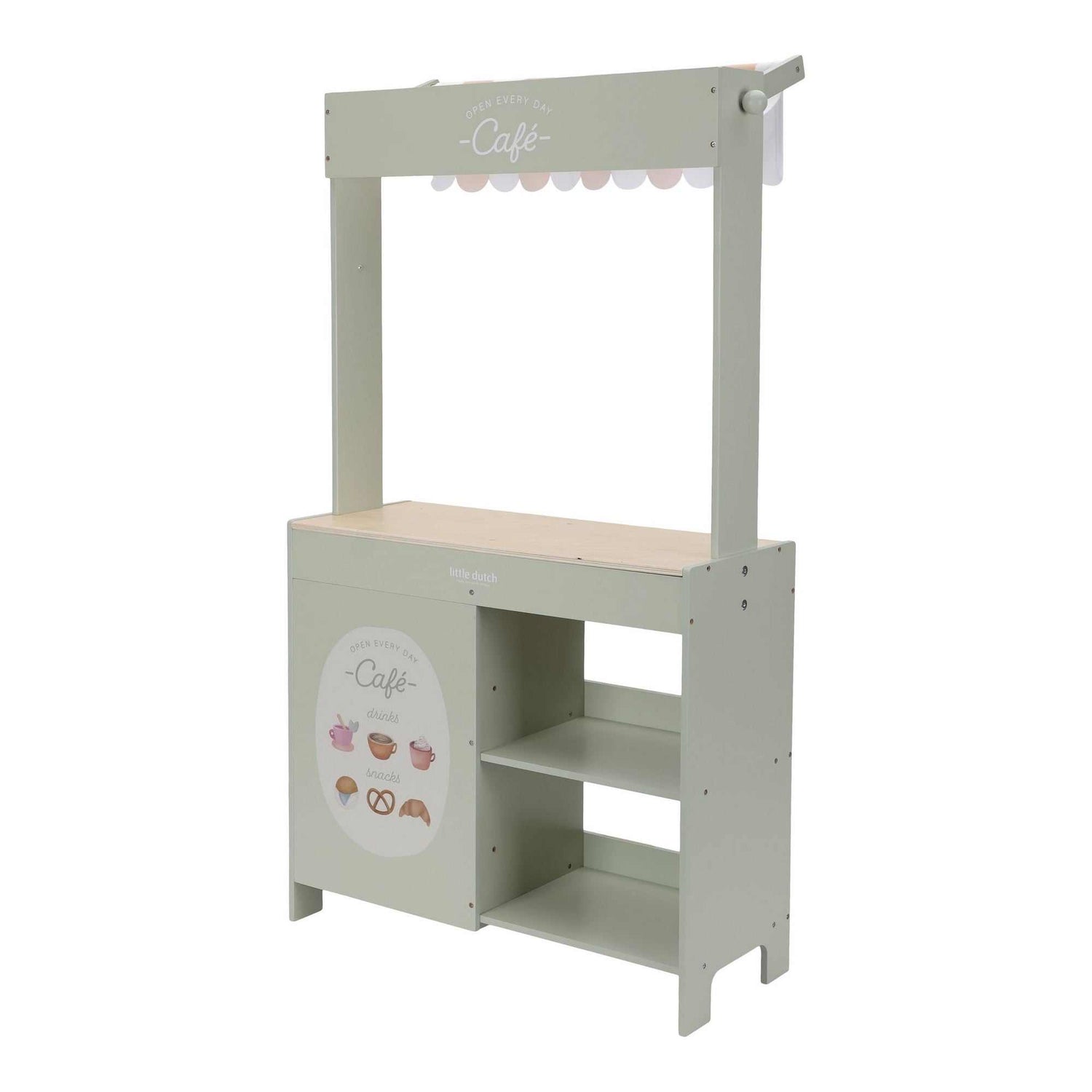 Willkommen auf dem Markt! Mit dem liebevoll gestalteten Modell „Marktstand & Café“ von Little Dutch, eröffnen Kinder ihren eigenen kleinen Laden – ob als Marktbude oder als charmantes Straßencafé. Das grüne Stoffdach sorgt für authentisches Marktflair, während Kreidetafel und beschriftete Karten eine ansprechende Präsentation der Produkte ermöglichen.