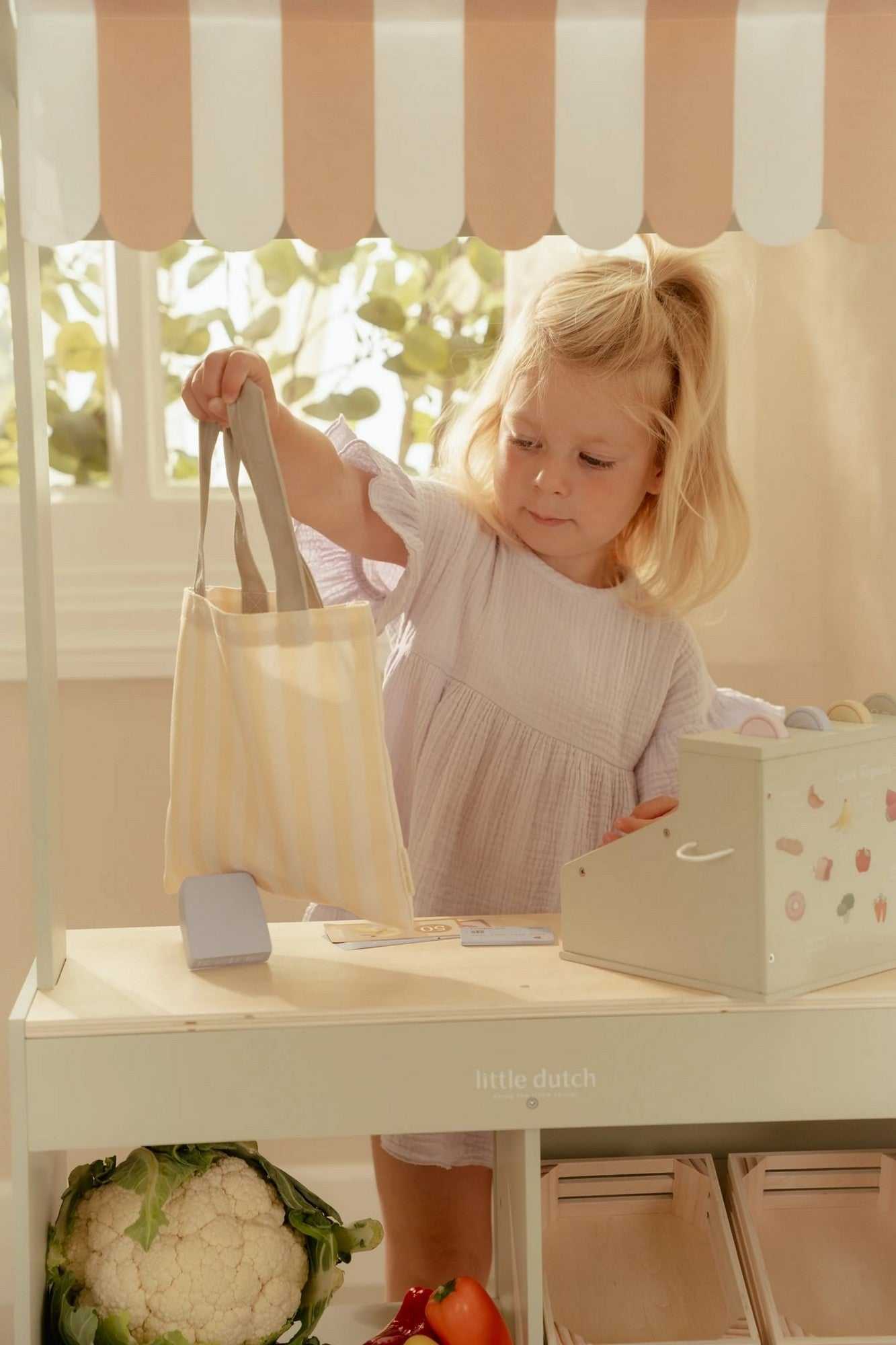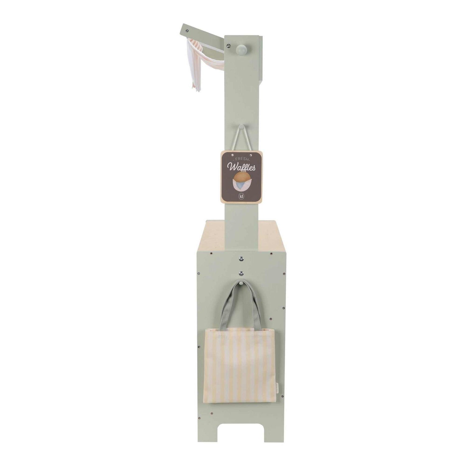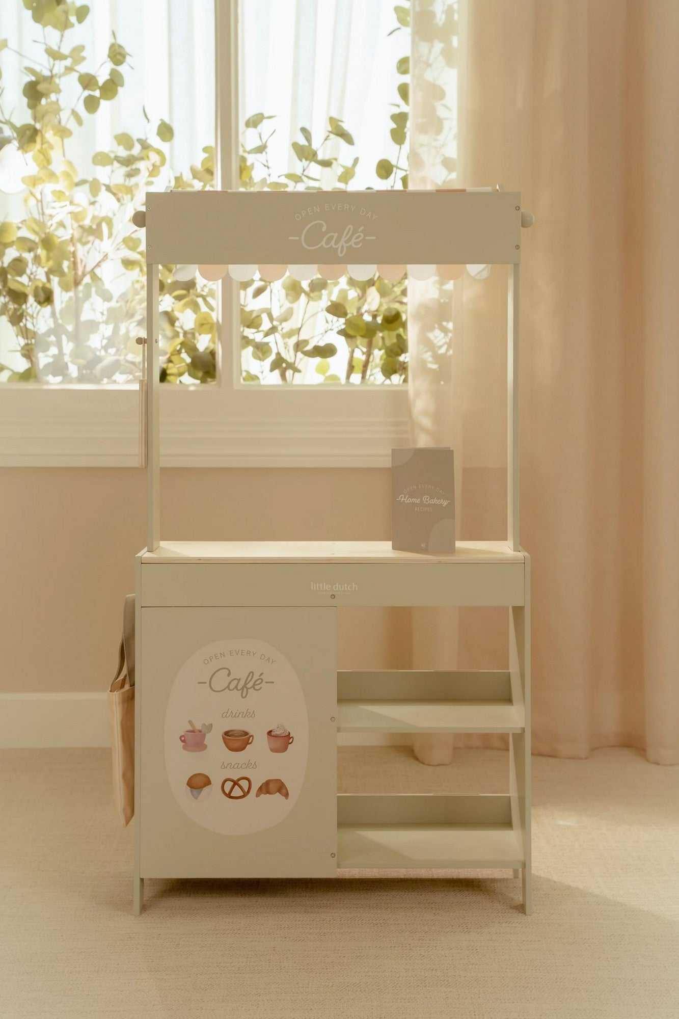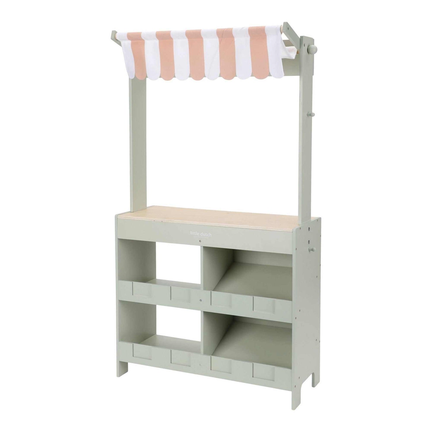 Willkommen auf dem Markt! Mit dem liebevoll gestalteten Modell „Marktstand & Café“ von Little Dutch, eröffnen Kinder ihren eigenen kleinen Laden – ob als Marktbude oder als charmantes Straßencafé. Das grüne Stoffdach sorgt für authentisches Marktflair, während Kreidetafel und beschriftete Karten eine ansprechende Präsentation der Produkte ermöglichen.