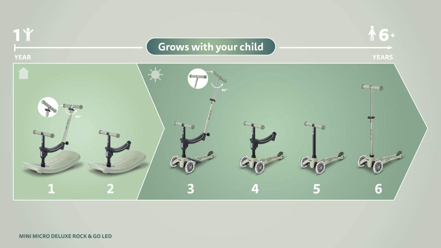 Der Mini Micro Deluxe Rock & Go LED ist ein innovativer Kinderroller, der die motorische Entwicklung von Kleinkindern auf vielfältige Weise fördert. Als weltweit erster Rocking Scooter bietet er sechs Funktionen in einem Produkt: Wippe, Ride-on, Lauflernhilfe und vollwertiger Scooter mit LED-Rädern – für Kinder im Alter von 1 bis 6+ Jahren.