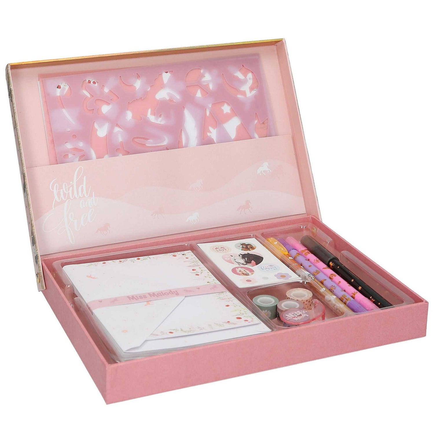 Handlettering ist Trend! In dieser Kreativ-Box von Miss Melody findet sich alles, was man für wunderschön gestaltete Briefe und Karten braucht: 10 Briefblätter, 10 Briefumschläge, 5 Postkarten, 4 Stifte (2 Doppelfasermaler (rosa und pink), 1 schwarzer Magic-Handlettering-Stift, 1 goldener Gelstift), 3 Stickerbogen, 1 Abroller mit 4 Tapes sowie 2 Schablonen. Auch dabei: ein Büchlein mit einfachen Gestaltungs-Anleitungen und -Ideen. Mit diesem coolen Set, ist ihr Kind sicher eine Weile beschäftigt.