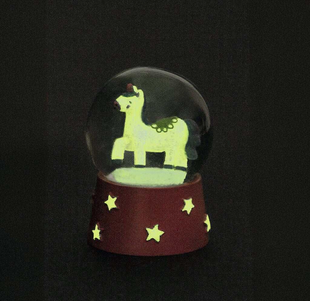 Einmal geschüttelt, schon wirbeln Schneeflocken und Glitzer um Engel, Schneemann, Bär oder Lama. Doch damit nicht genug: Sowohl die Sterne am Sockel als auch die Figuren im Inneren beginnen im Dunkeln geheimnisvoll zu leuchten. So verwandeln die Schneekugeln jedes Kinderzimmer in eine kleine Winterzauberwelt.