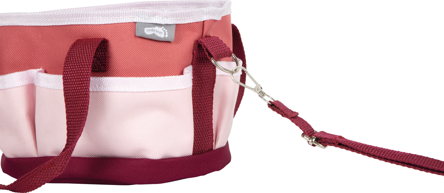 Mit einer Pferdeputztasche in ansprechenden Rosa- und Beerentönen und hochwertigem Zubehör aus Holz können Kinder ihre Fantasie beim Hobby Horsing voll ausleben.