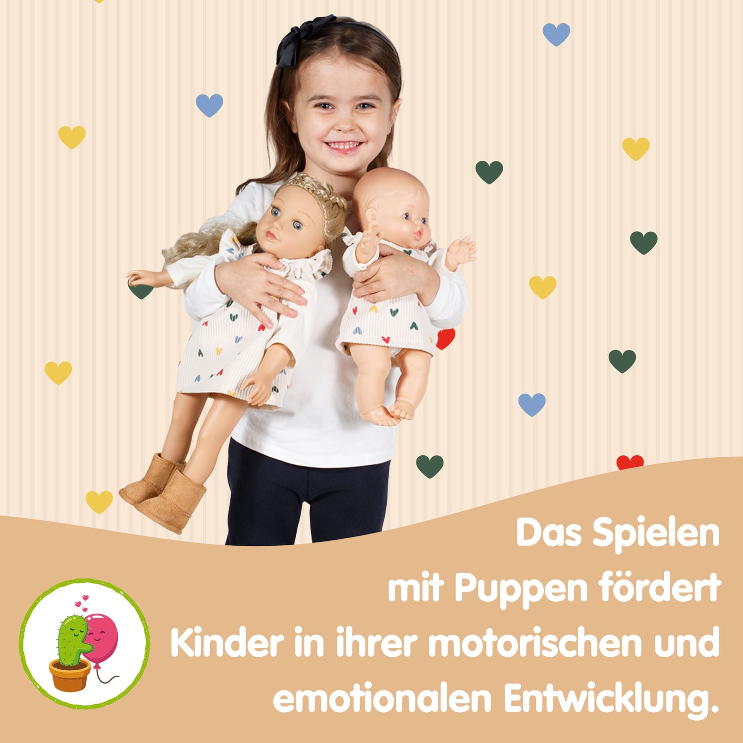 Mit den angesagten Puppen-Stiefeln in Wildleder-Optik von Heless wird die Puppe zum absoluten Trendsetter und ist immer perfekt gestylt. Die Stiefel sind eine prima Ergänzung zu den Outfits der „Herz-Konfetti“-Kollektion, passen aber auch zu vielen weiteren Puppenkleidern des Heless-Sortiments.