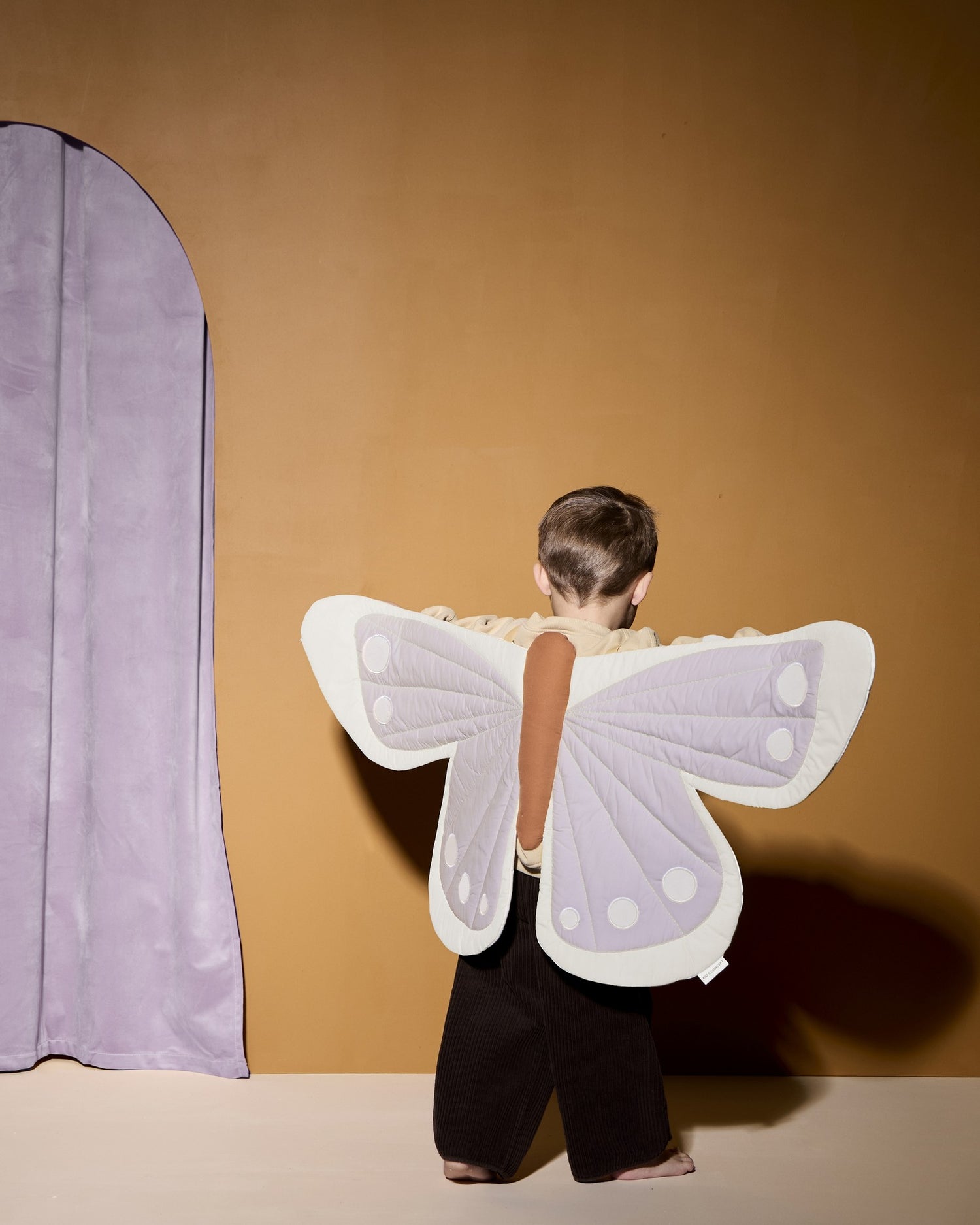 Die Flügel sind in einer zarten Mischung aus Weiß und zartem Lila gehalten, mit einem weichen braunen Körper in der Mitte. Sie sind leicht gepolstert, um ihre Form zu halten.