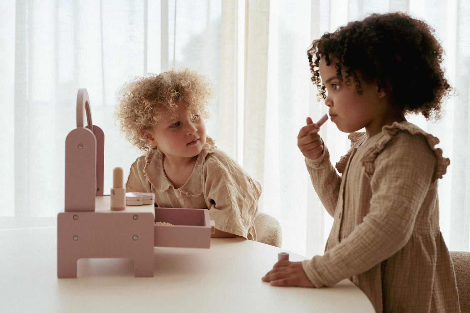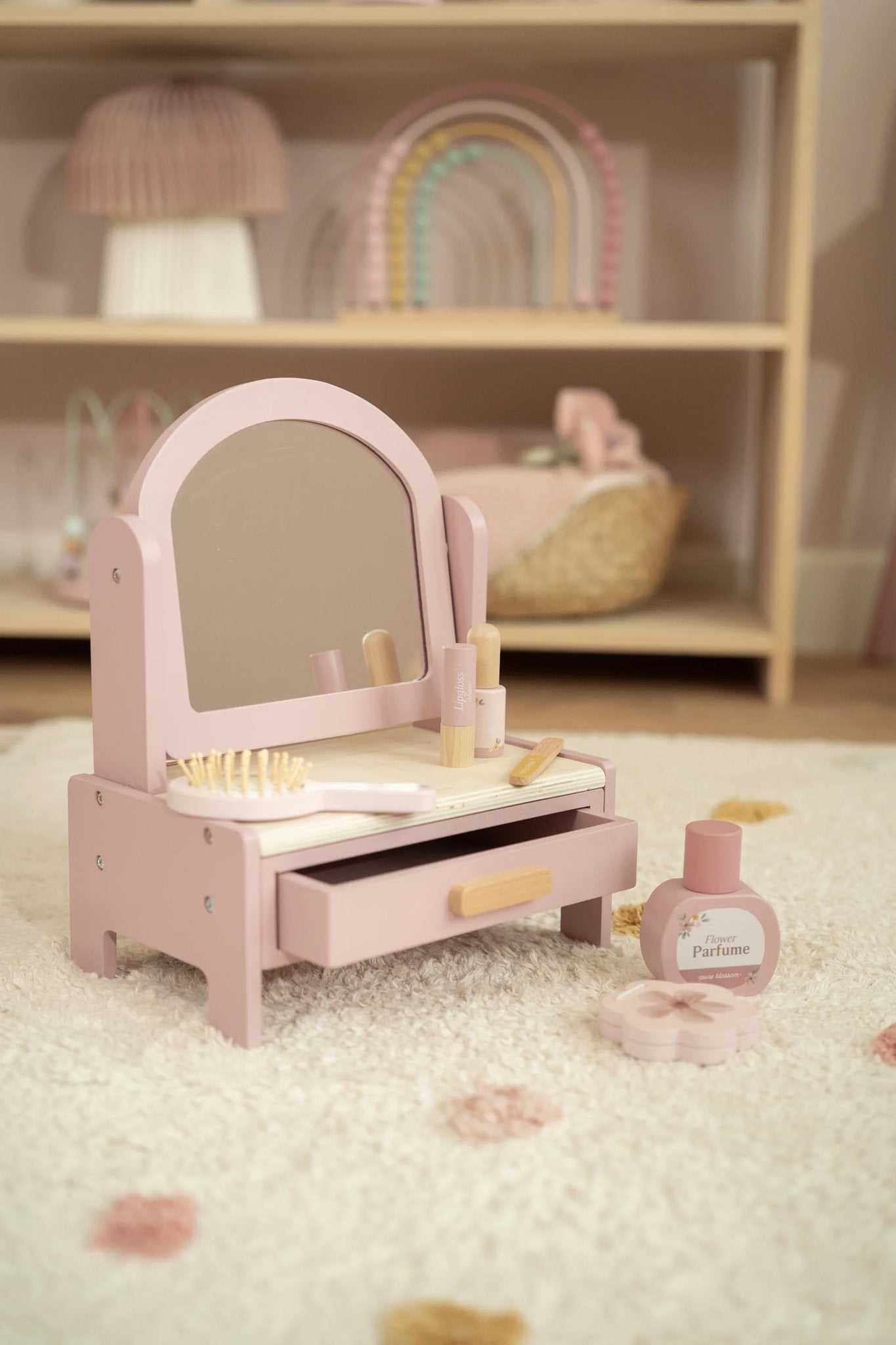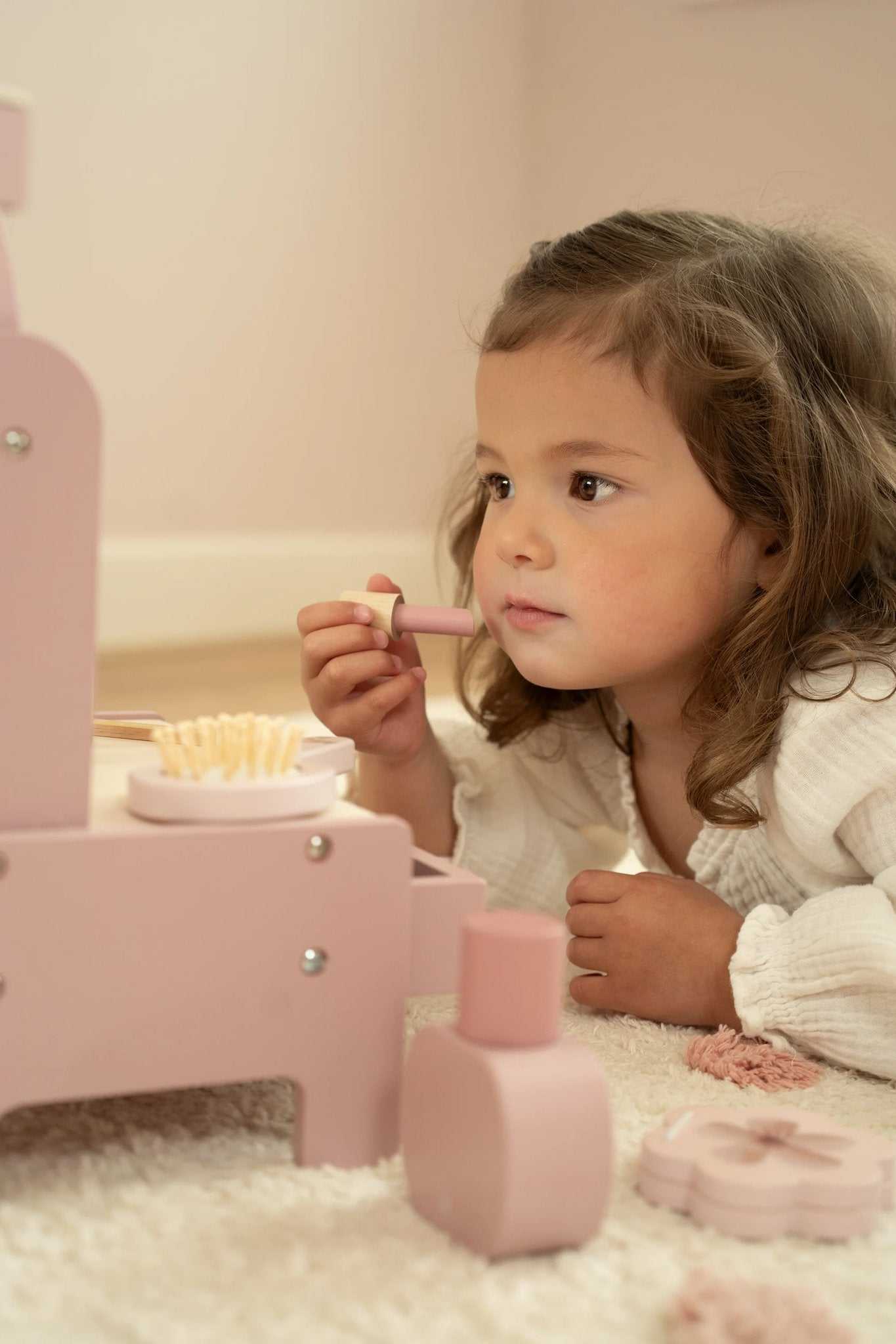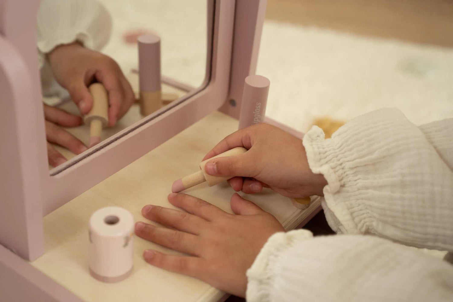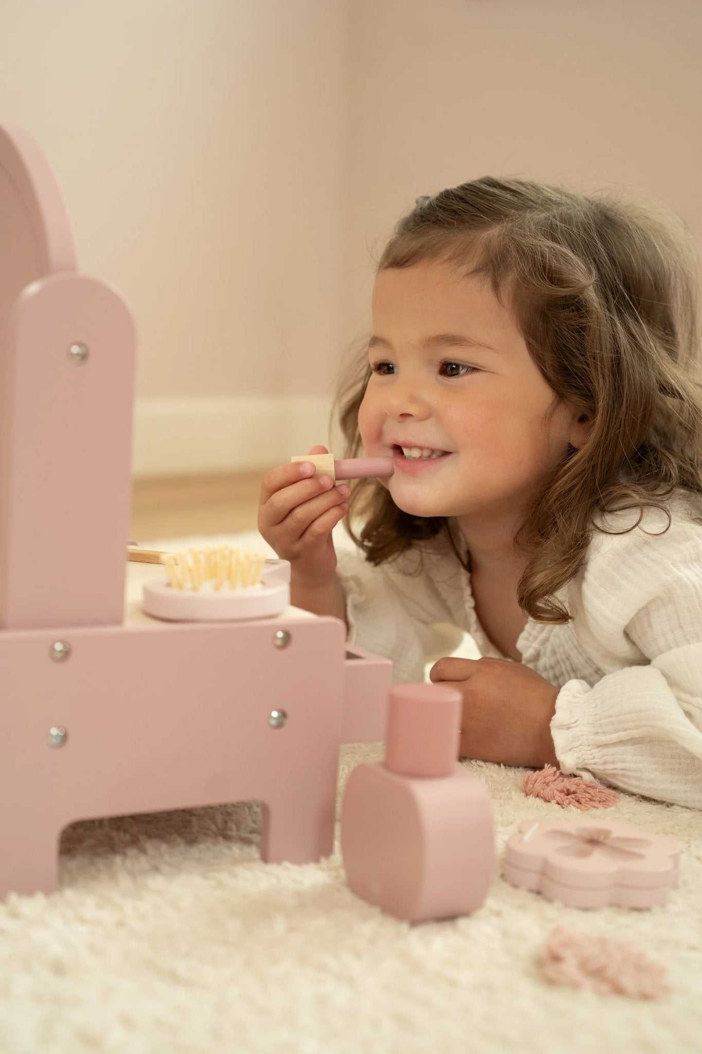 Stilvoller Schminktisch aus Holz von Little Dutch in zartem Rosa – ideal für kreative Rollenspiele rund um Styling und Schönheit. Ausgestattet mit drehbarem Spiegel und sechs liebevoll gestalteten Schönheitsaccessoires, darunter Haarbürste, Lippenstift und Parfümflakon. Fördert Fantasie, Feinmotorik und selbstständiges Spielen.