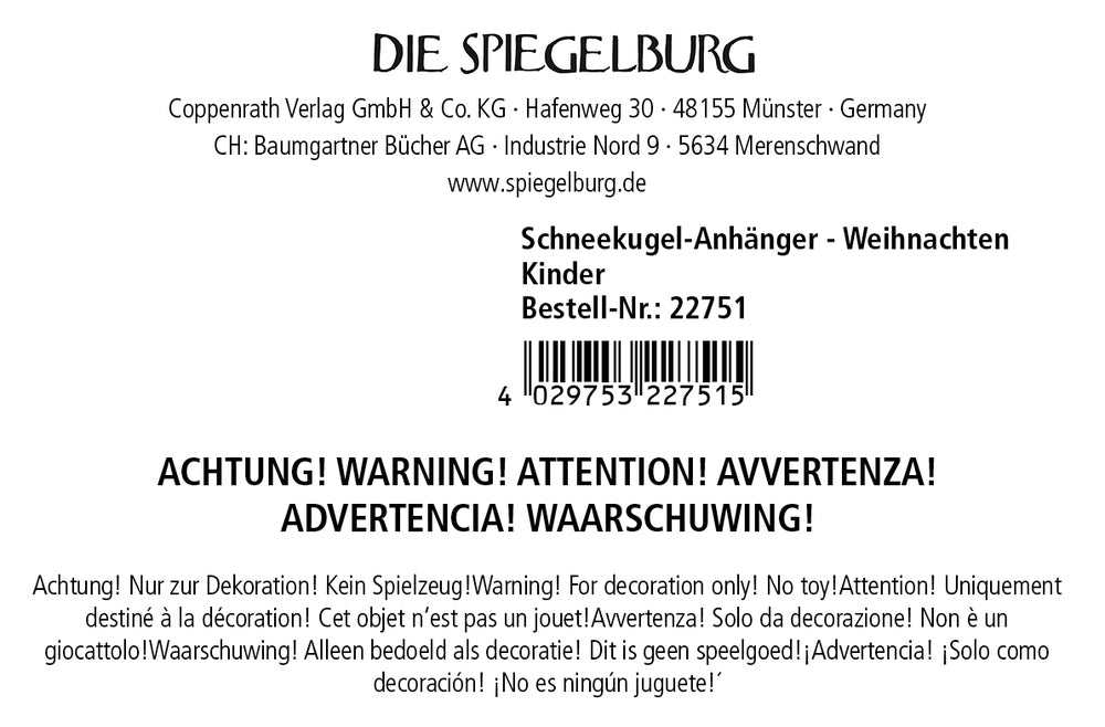 Der Mini-Schneekugel-Anhänger von Die Spiegelburg/ Coppenrath ist ein stimmungsvoller Hingucker für die Weihnachtszeit. Ob als Deko im Kinderzimmer, als origineller Geschenkanhänger oder am Weihnachtsbaum – die liebevoll gestalteten Figuren bringen winterliche Magie in jeden Raum.