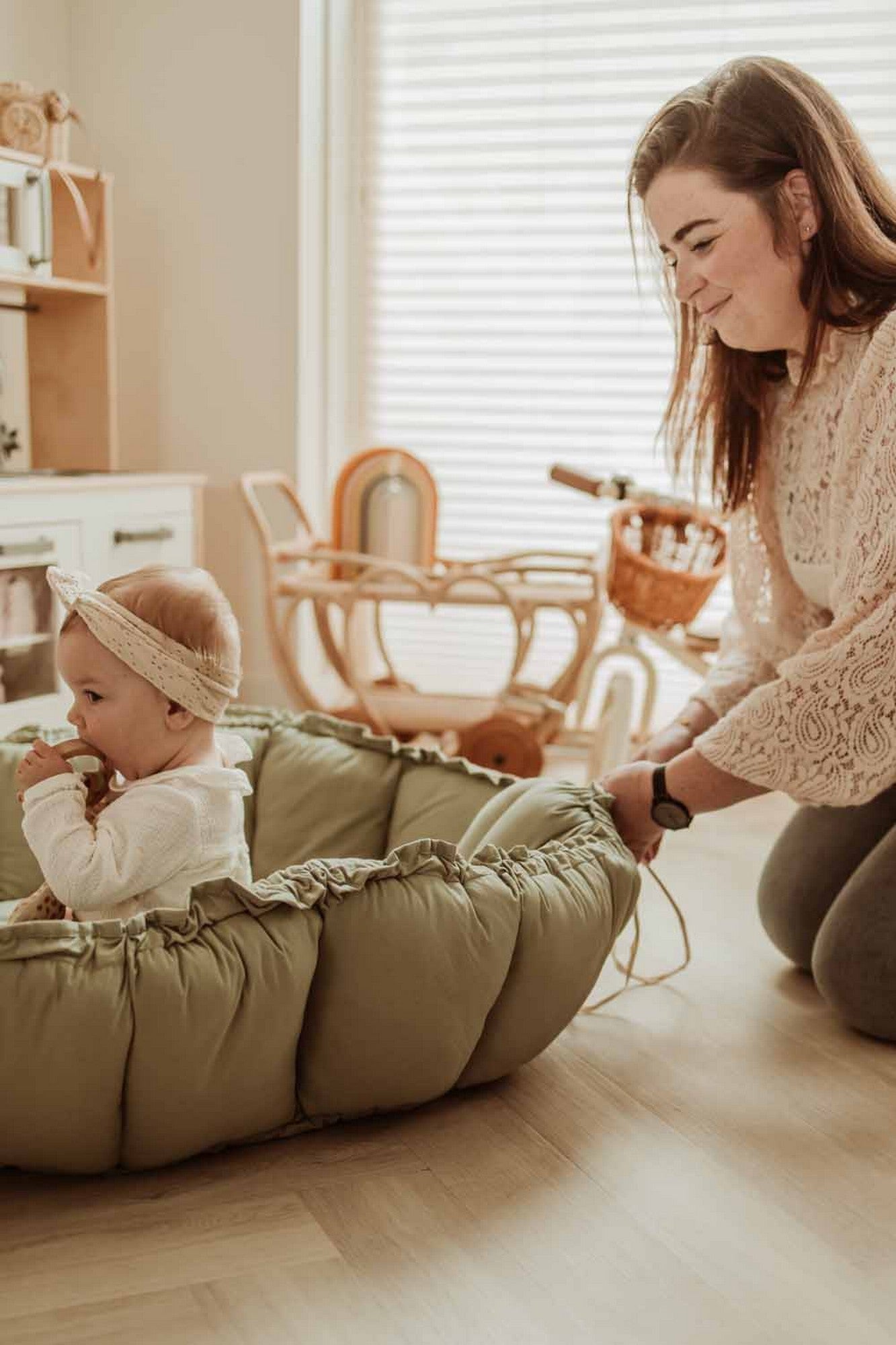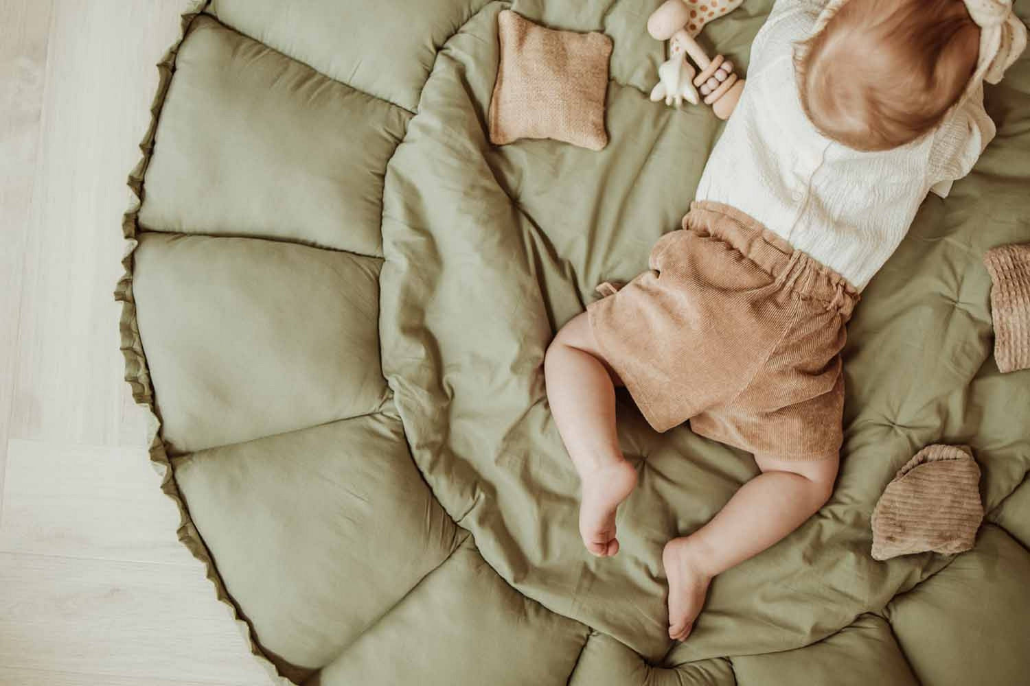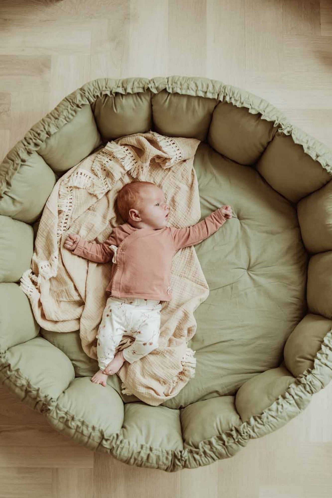 Was tun, wenn Ihr kleiner Wirbelwind einen sicheren Spielplatz, ein gemütliches Nest und gleichzeitig eine praktische Aufbewahrung braucht? Die Play&Go Bloom Babymatte macht’s möglich – und das gleich dreifach! Flach ausgebreitet bietet sie eine weiche, gepolsterte Fläche aus GOTS-zertifizierter Bio-Baumwolle, auf der Babys nach Herzenslust spielen, krabbeln oder entspannen können. Und wenn die kleine Pause kommt, verwandelt sich die Matte im Nu in ein kuscheliges Nest mit erhöhtem Rand – ideal für ein sicheres, behütetes Liegen auf dem Bauch. Doch damit nicht genug: Nach der Kuschelrunde dient das Bloom Babynest als cleverer Aufbewahrungskorb für Kuscheltiere, Schnuller & Co. So bleibt das Kinderzimmer immer ordentlich und charmant zugleich! Modell: Play&Go Bloom Farbe: Meadow green Maße: Ø 130 cm Pflege: Waschbar bei 30 °C Füllung: Recycelte PET-Flaschenfasern Altersempfehlung: Neugeborene bis alle Altersgruppen Material: Außenhülle 100 % GOTS-zertifizierte Bio-Baumwolle Zertifizierungen: GOTS (Global Organic Textile Standard) Hinweise: Nur unter Aufsicht verwenden. Entfernen Sie vor Gebrauch sämtliches Verpackungsmaterial.