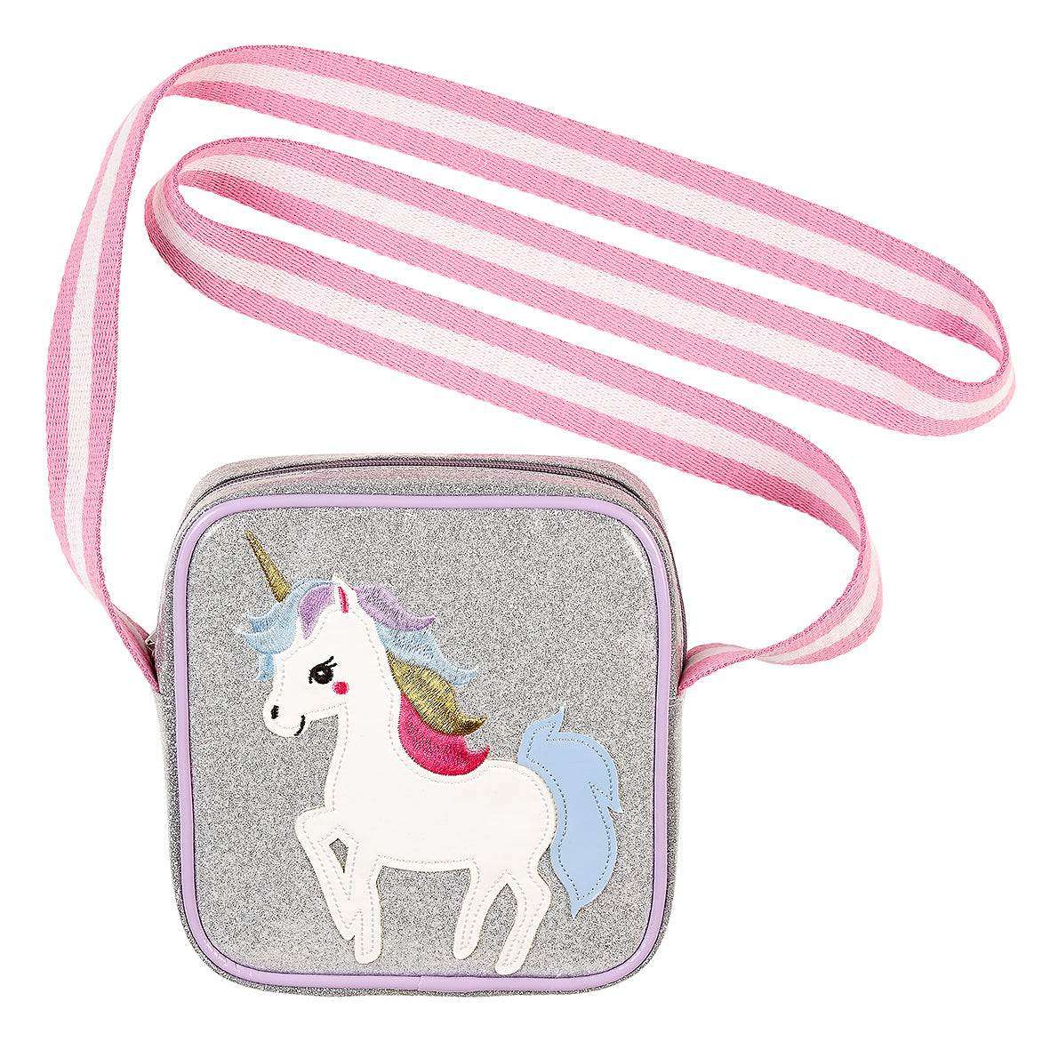 Die glitzernde Mädchentasche ist mit einer Einhorn Applikation verziert.