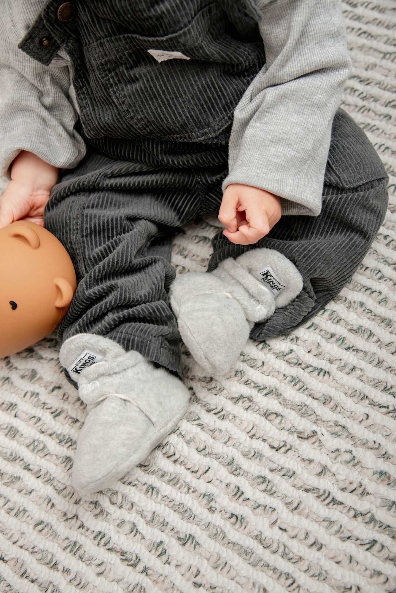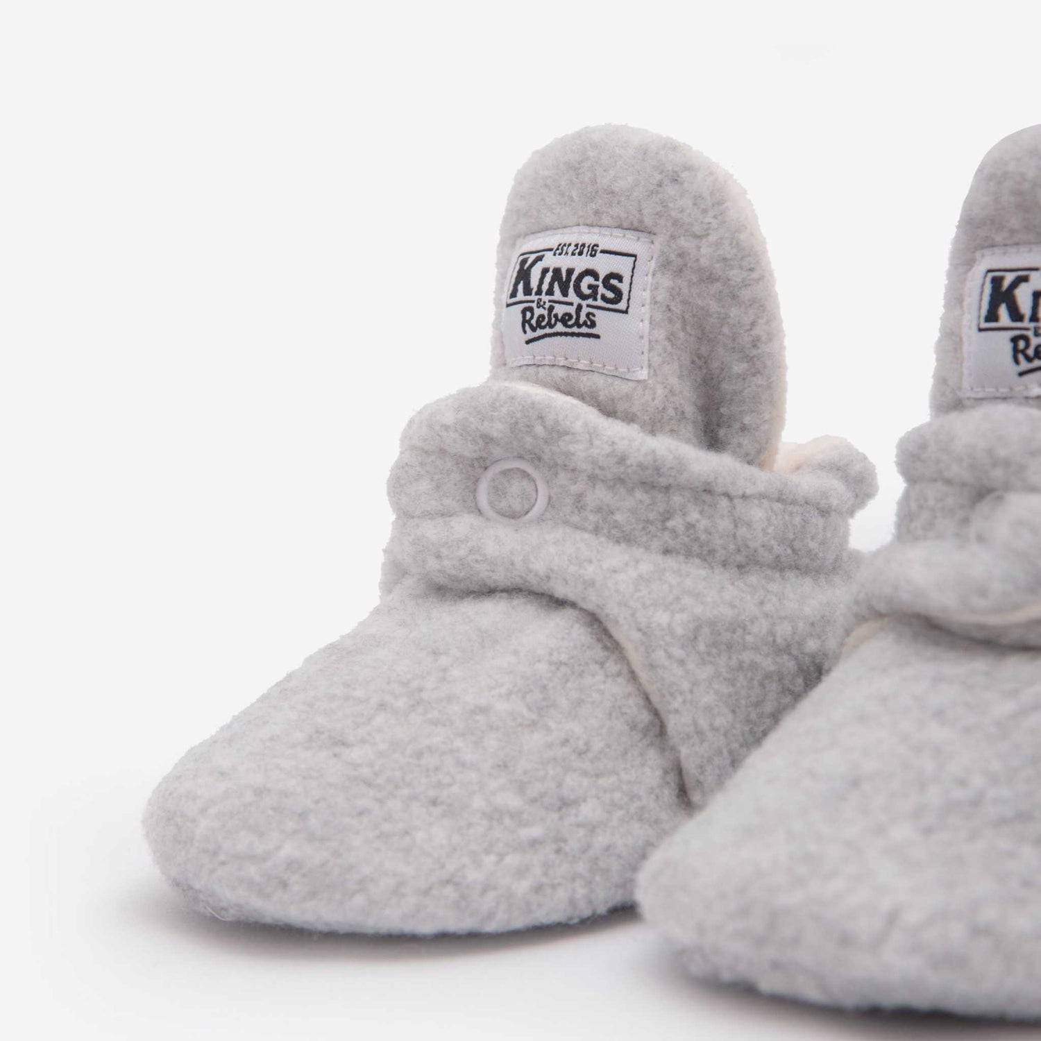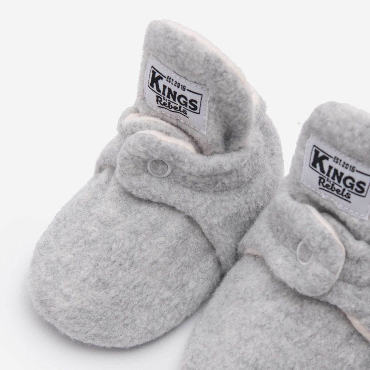Die Kings & Rebels Baby Booties wurden mit einem einfachen und praktischen Druckknopf- Verschluss entworfen, was das Anziehen von strampelnden Babys in wenigen Sekunden ermöglicht. Der komplett um die Ferse verlaufende und über dem Knöchel sitzende, integrierte Gummizug verhindert auch bei sehr aktiven Babys das Herunterrutschen des Booties. Die Booties passen sich perfekt an die individuelle Form der Babyfüße an und schränken somit die natürliche Entwicklung der kleinen Babyfüße nicht ein. Alle Kings & Rebels Baby Booties werden in Handarbeit im eigenen Familienbetrieb hergestellt. ACHTUNG: Größe 12-24 Monate, Laufsohle mit Antirutsch- Noppen Farbe: Grey Innenmaterial: Fleece Außenmaterial: Teddy Fleece Größenübersicht: New Born (9 cm Länge) 3 Monate (10 cm Länge ) 6 Monate (11,5 cm Länge) 12 Monate (13 cm Länge) 18 Monate (14 cm Länge) 24 Monate (15 cm Länge)