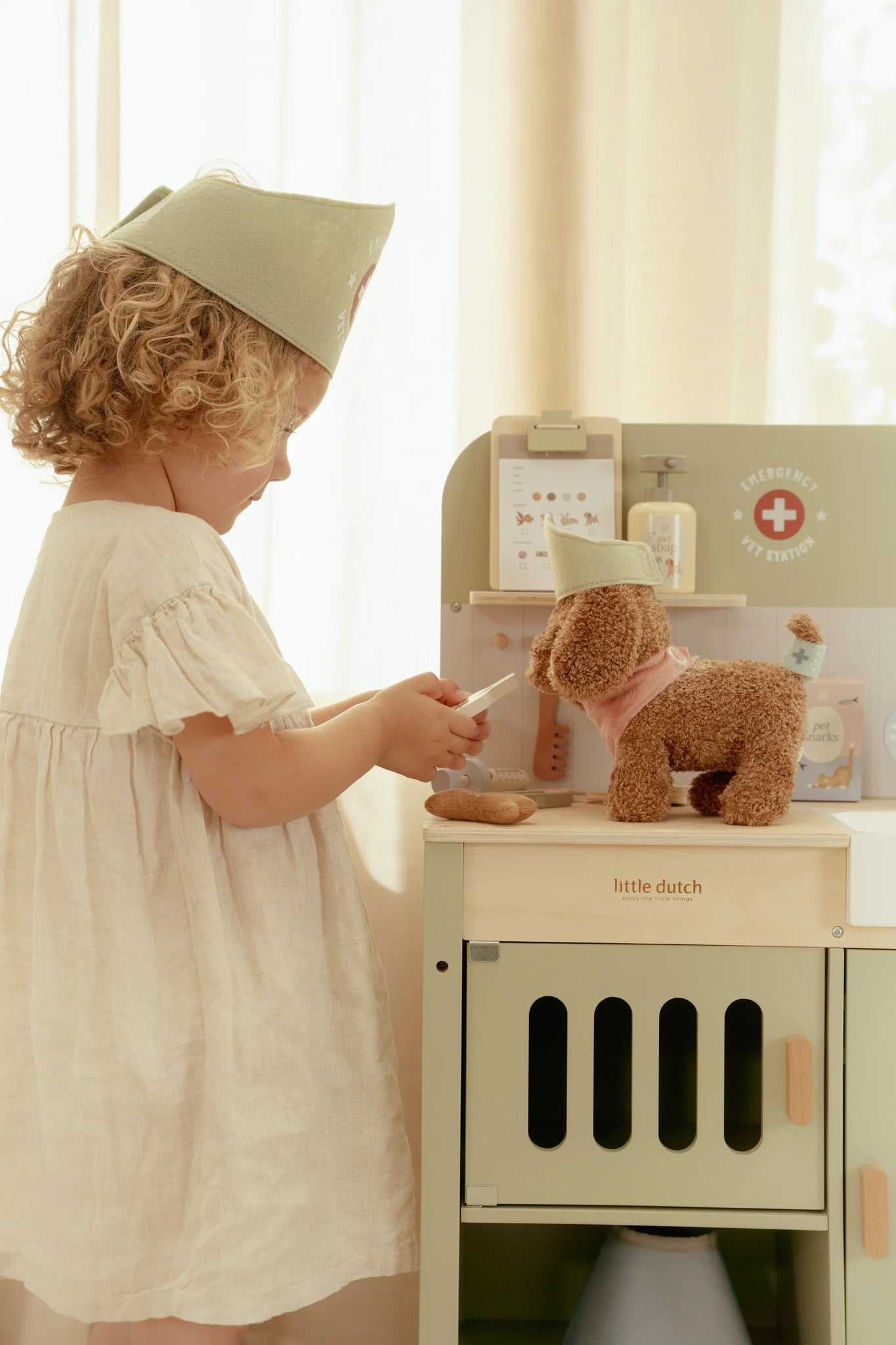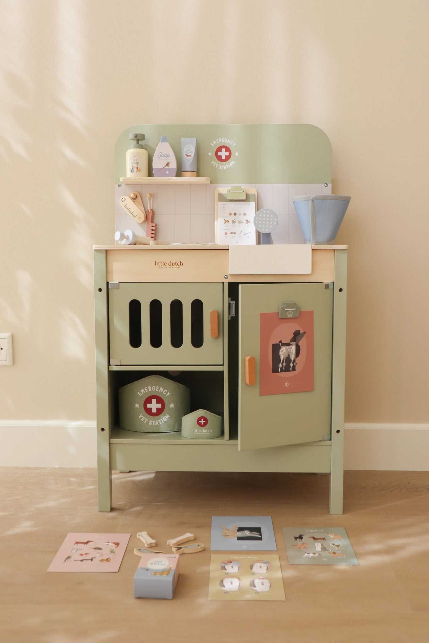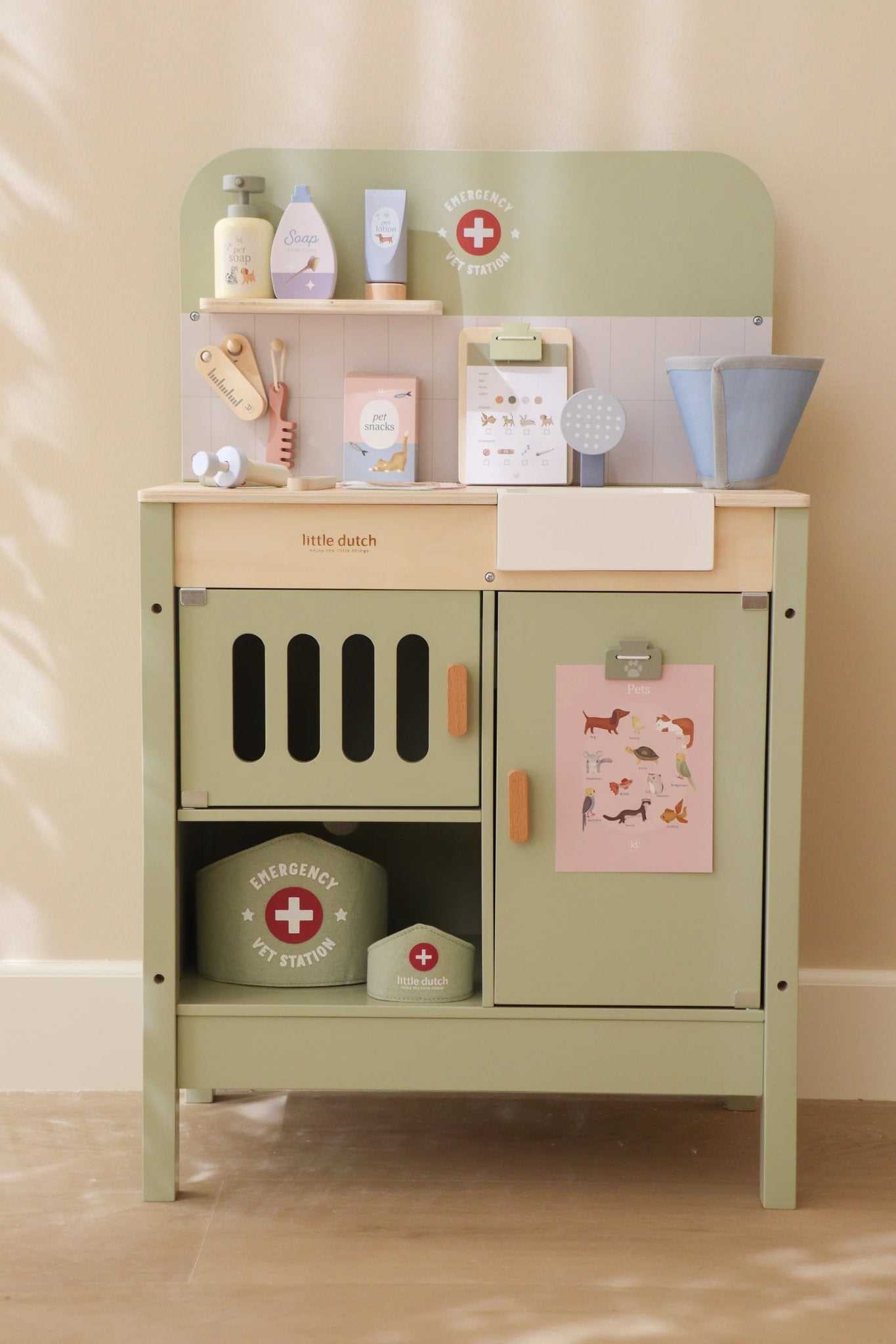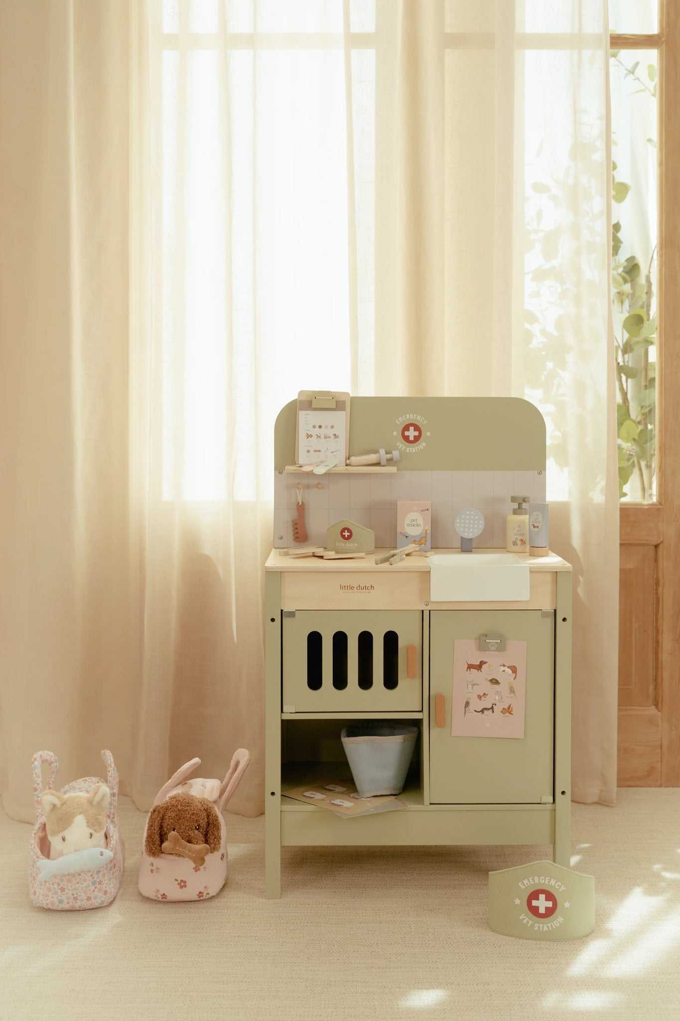 Umfassende Spielstation für kleine Tierfreunde von Little Dutch. Die hölzerne Tierarztpraxis bietet alles, was für die Pflege von Kuscheltieren und Spielzeugtieren benötigt wird: integriertes Waschbecken mit ausziehbarem Duschkopf, Kamm, Thermometer, Spritze und Pflaster. Ergänzt wird das Set durch ein Stoffstirnband und einen Clip zum Aufhängen medizinischer Illustrationen und Röntgenbilder.