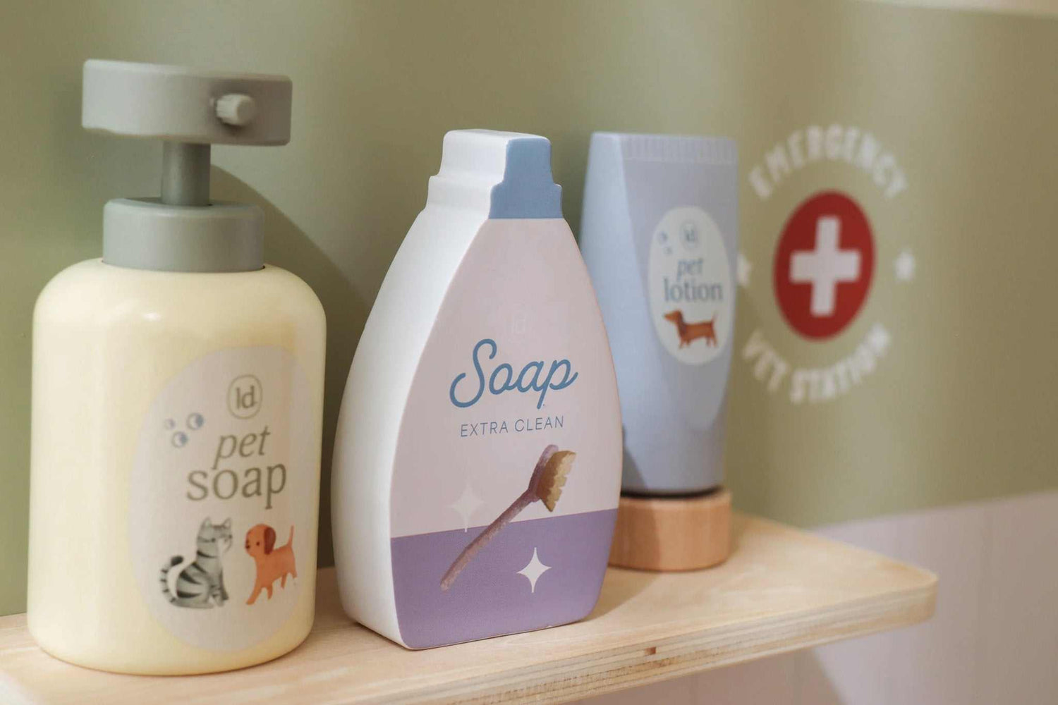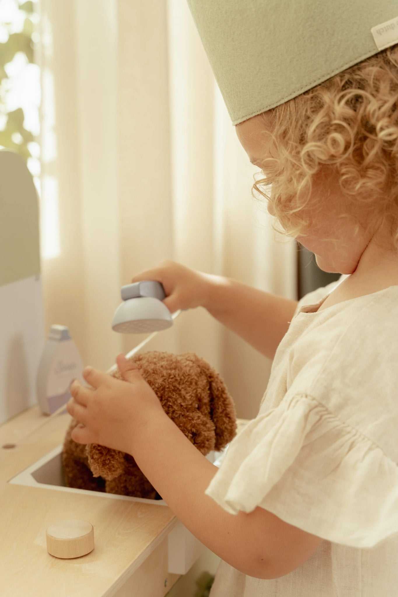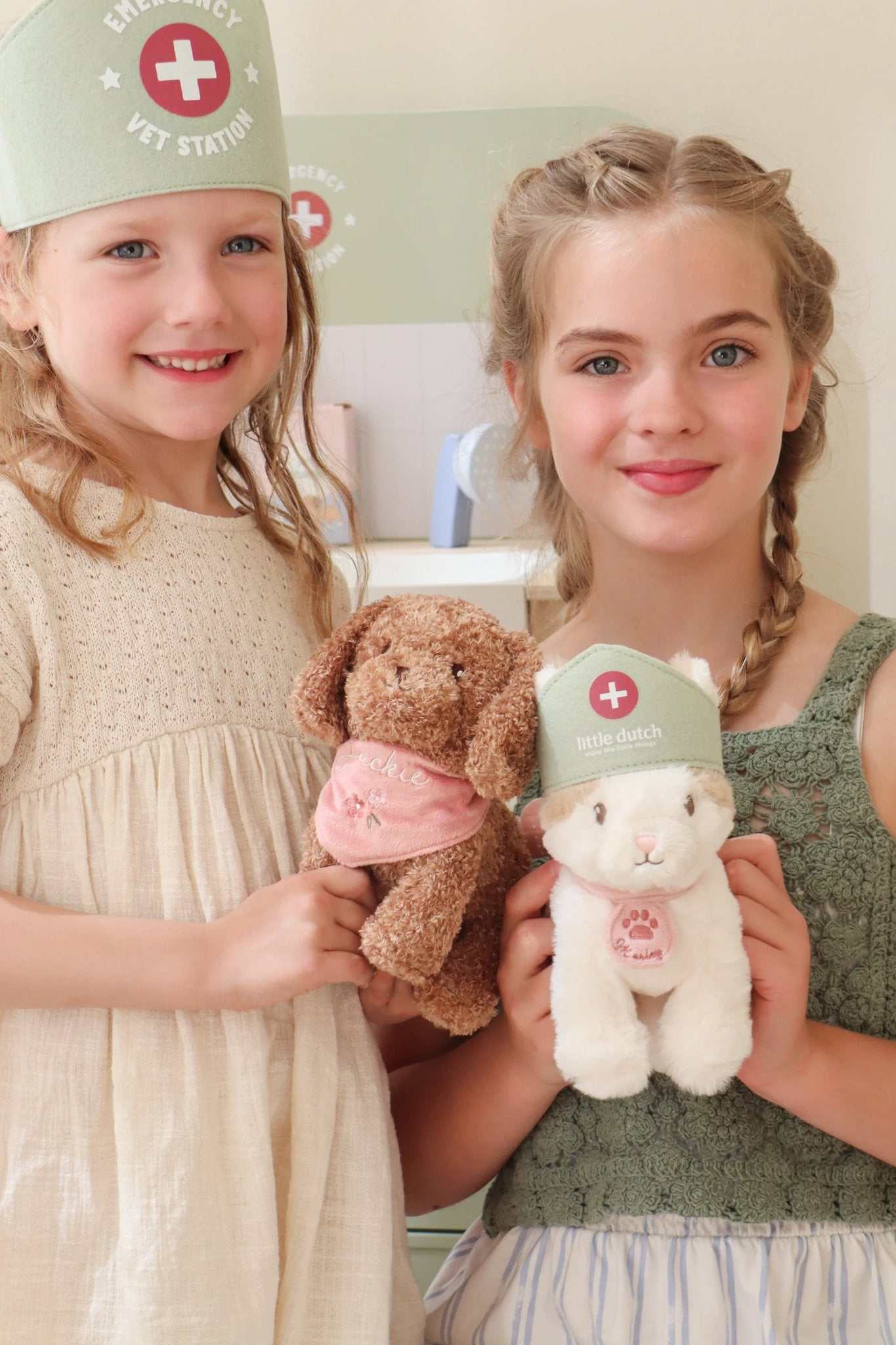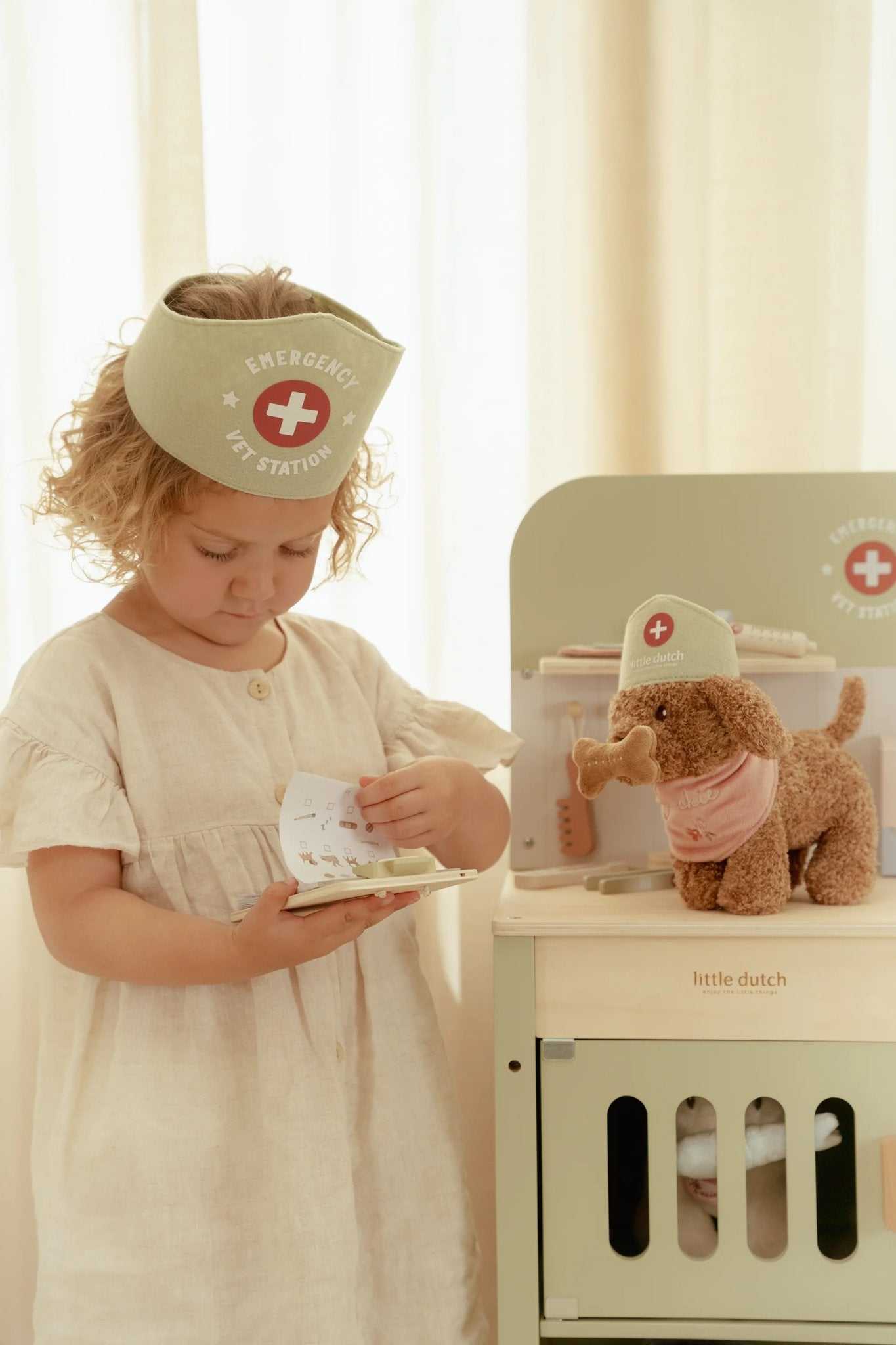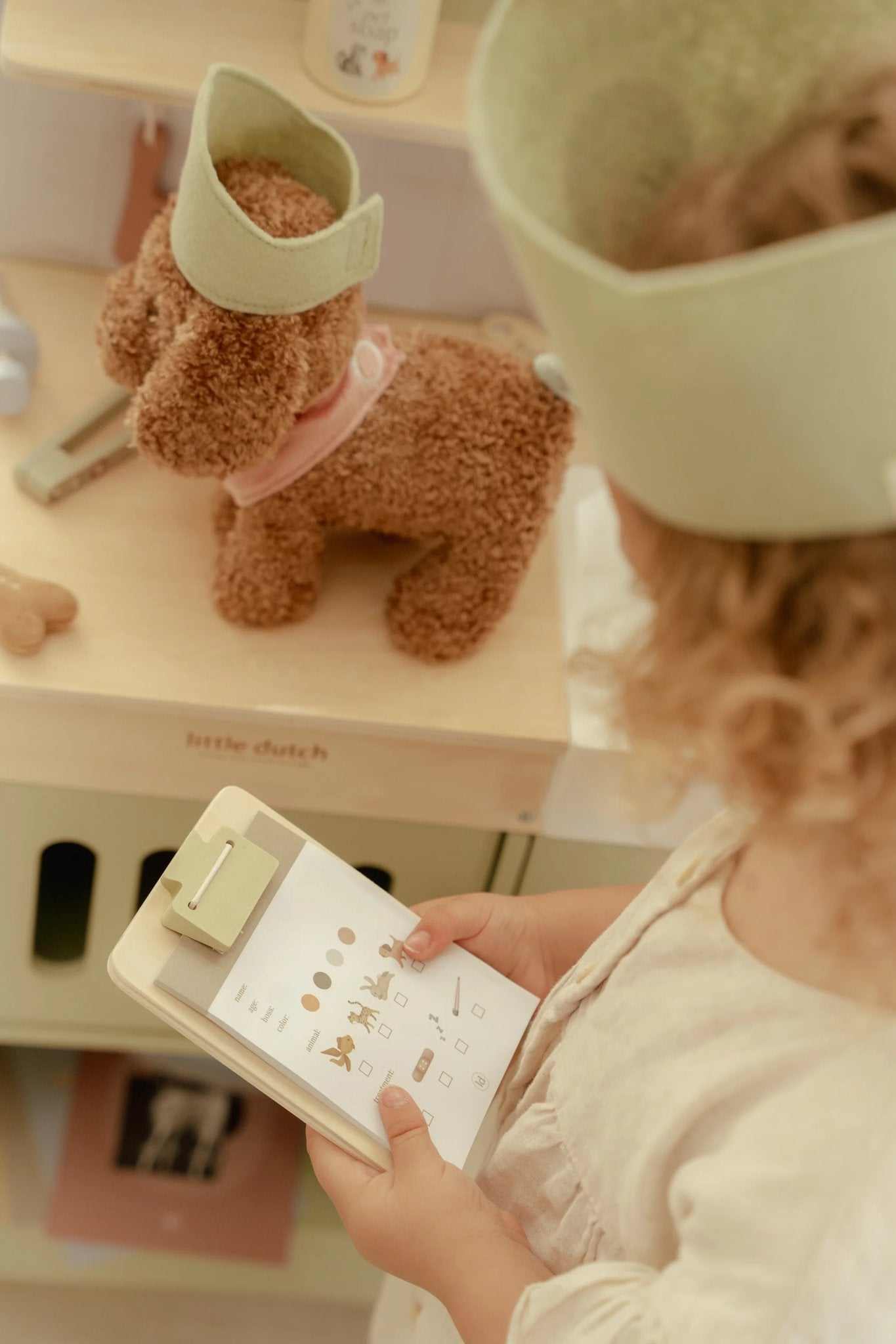 Umfassende Spielstation für kleine Tierfreunde von Little Dutch. Die hölzerne Tierarztpraxis bietet alles, was für die Pflege von Kuscheltieren und Spielzeugtieren benötigt wird: integriertes Waschbecken mit ausziehbarem Duschkopf, Kamm, Thermometer, Spritze und Pflaster. Ergänzt wird das Set durch ein Stoffstirnband und einen Clip zum Aufhängen medizinischer Illustrationen und Röntgenbilder.