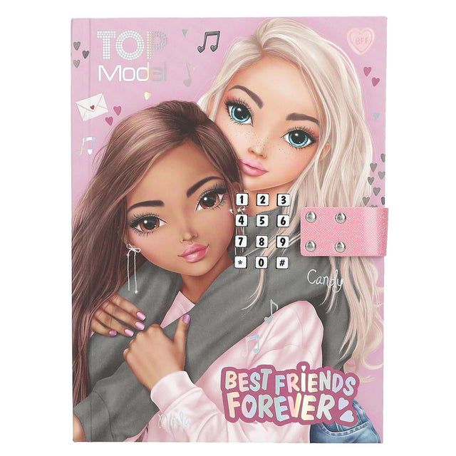 Ein Buch für ganz persönliche Gedanken und Geheimnisse, Das TOPModel-Tagebuch öffnet sich nur, wenn der richtige 4-stellige Code (persönlich einstellbar und änderbar) eingegeben wird. Dann spielt auch der neue TOPModel-Song BEST FRIENDS für ca. 20 Sekunden). Außen ist das Tagebuch in tollem Pink gehalten, mit einem großen Freundinnen-Model-Motiv auf dem Cover und niedlichen Noten, Herzen und Briefen rundherum. Innen warten 80 fein linierte und farbig gestaltete Seiten darauf, beschrieben zu werden.