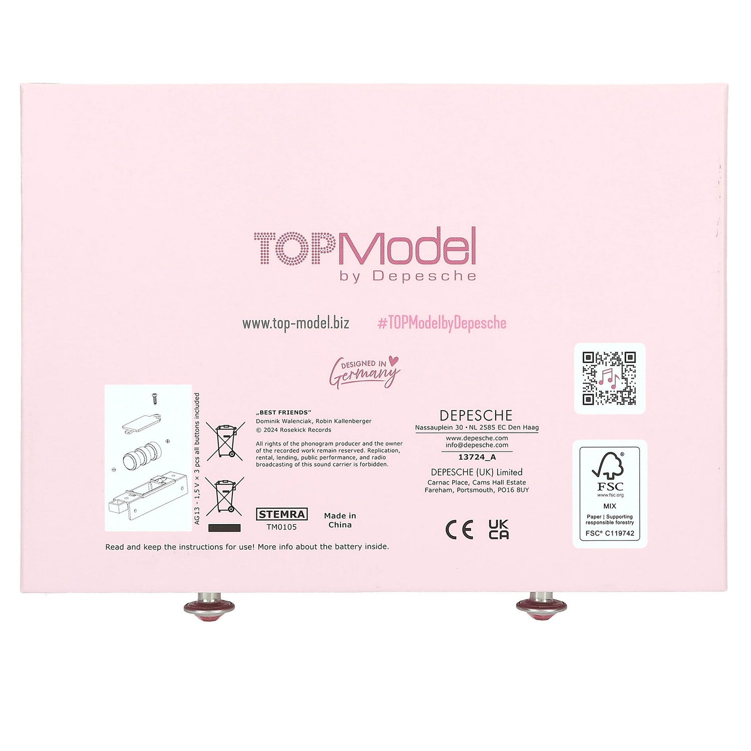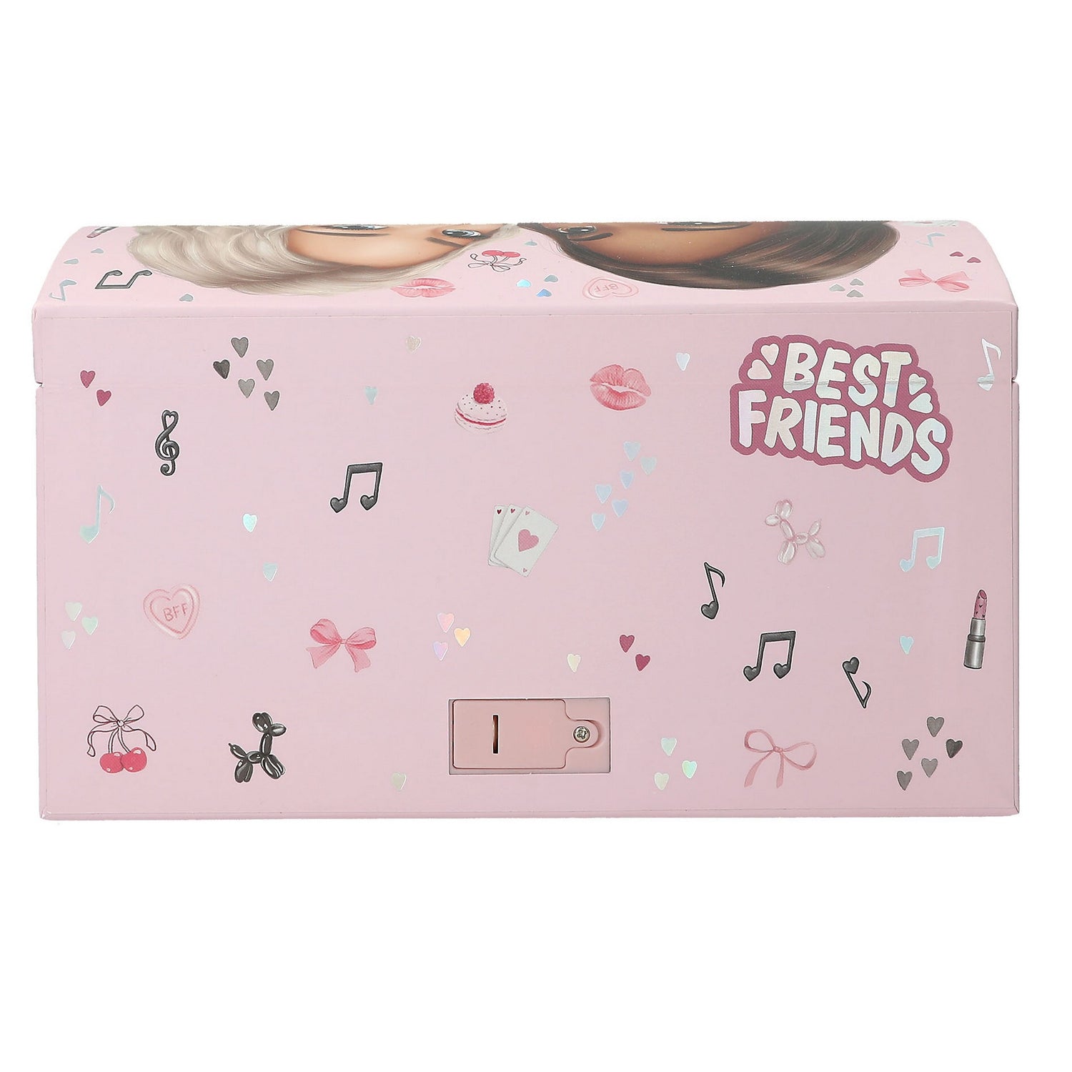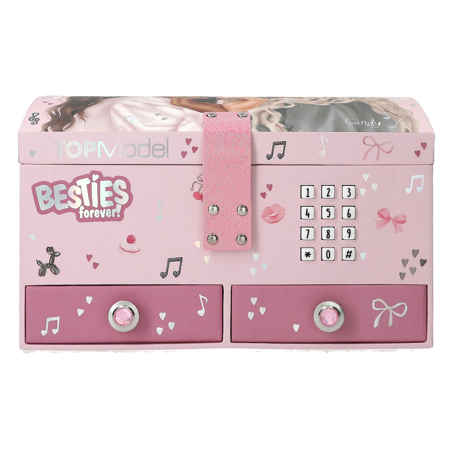 Dieses süße TOPModel-Schmuckkästchen mit Geheimcode-Schloss (persönlich einstell-/änderbar)ist ein Traum für junge Kinderherzen. Beim Öffnen spielt der neue TOPModel-Song BEST FRIENDS für ca. 20 Sekunden, gegliedert in Hauptfach, herausnehmbarem Inlay-Fach sowie zwei Schubladen für Schmuck oder kleine Schätze und Geheimnisse: Das rosafarbene TOPModel-Schmuckkästchen öffnet sich nur, wenn der richtige 4-stellige Code eingegeben wird (persönlich einstellbar/änderbar). Mit hübschen Model-Motiven und niedlichen kleinen Icons außen und innen.