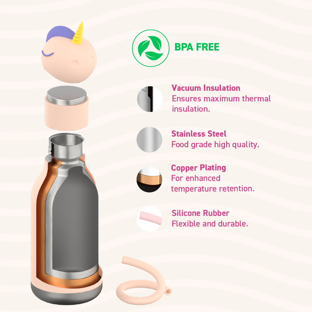 Die Flasche ist absolut auslaufsicher und lässt sich dank Drehverschluss auch von kleinen Händen leicht öffnen. Der integrierte Silikon-Strohhalm unterstützt selbstständiges Trinken und der weiche Außenmantel sorgt für ein angenehmes Gefühl beim Greifen. Der abnehmbare Silikon-Motivkopf ist nicht nur ein Blickfang, sondern auch ein lustiges Extra zum Sammeln und Tauschen. Die Flasche ist BPA- und bleifrei und somit eine gesunde Wahl für jeden Tag. Es wird Handwäsche empfohlen.