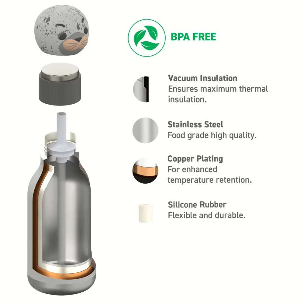 Die Flasche ist absolut auslaufsicher und lässt sich dank Drehverschluss auch von kleinen Händen leicht öffnen. Der integrierte Silikon-Strohhalm unterstützt selbstständiges Trinken und der weiche Außenmantel sorgt für ein angenehmes Gefühl beim Greifen. Der abnehmbare Silikon-Motivkopf ist nicht nur ein Blickfang, sondern auch ein lustiges Extra zum Sammeln und Tauschen. Die Flasche ist BPA- und bleifrei und somit eine gesunde Wahl für jeden Tag. Es wird Handwäsche empfohlen.