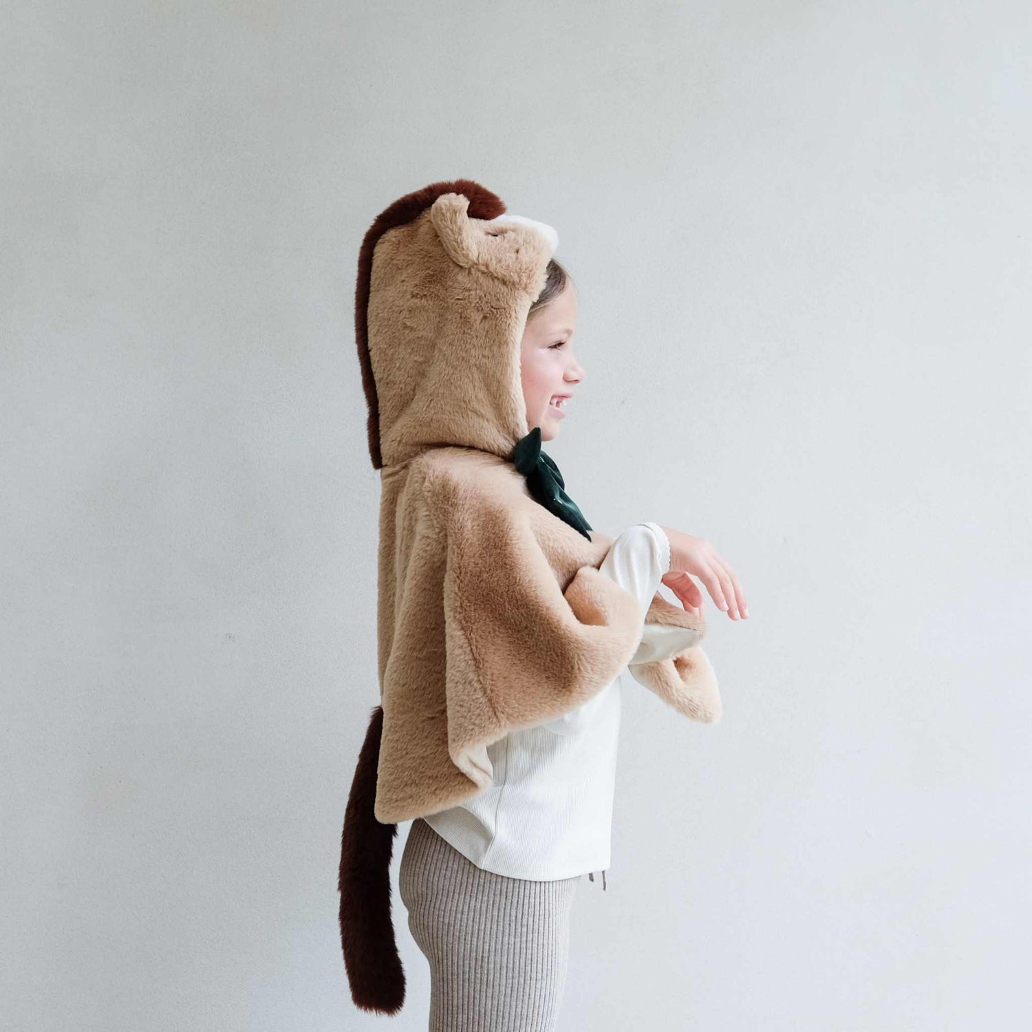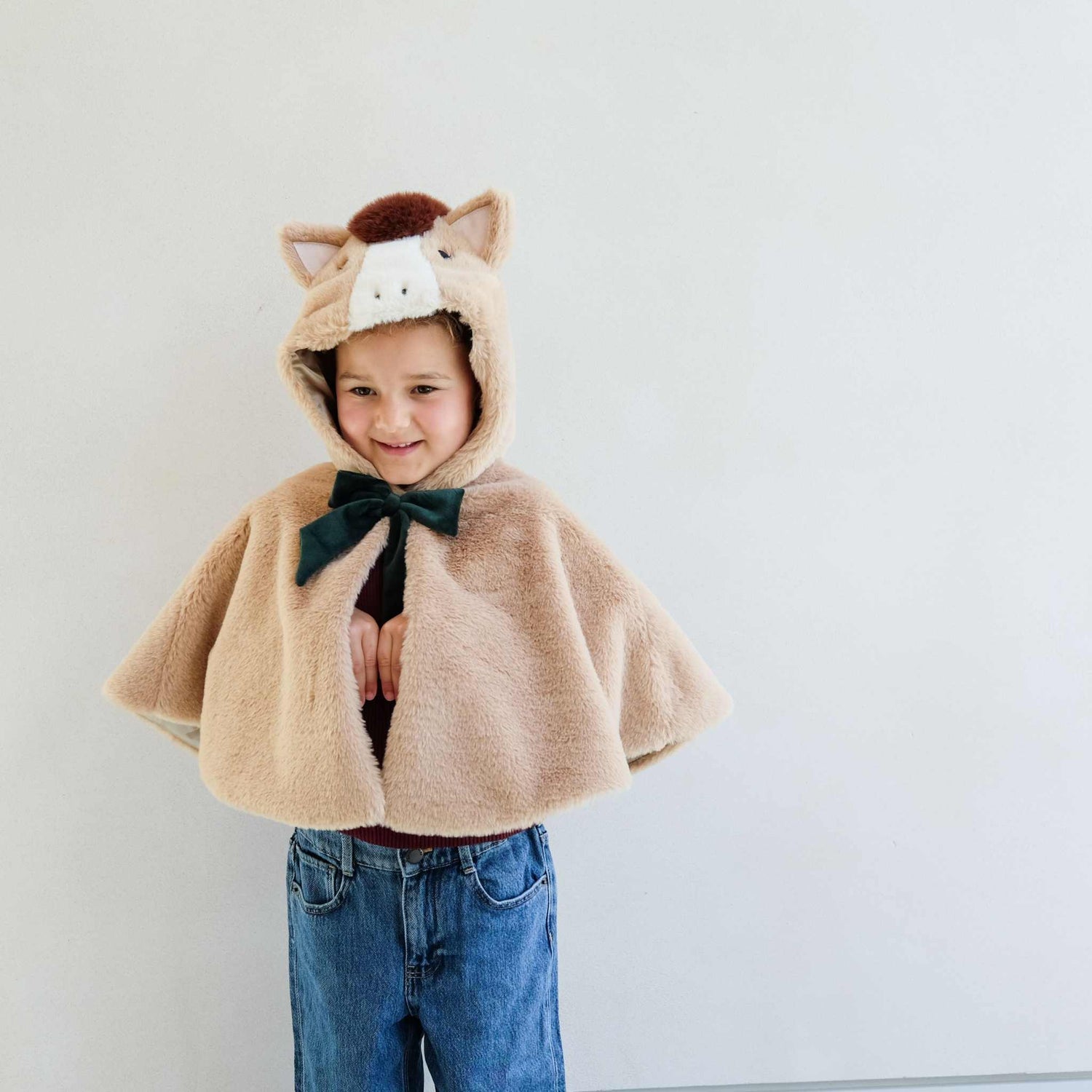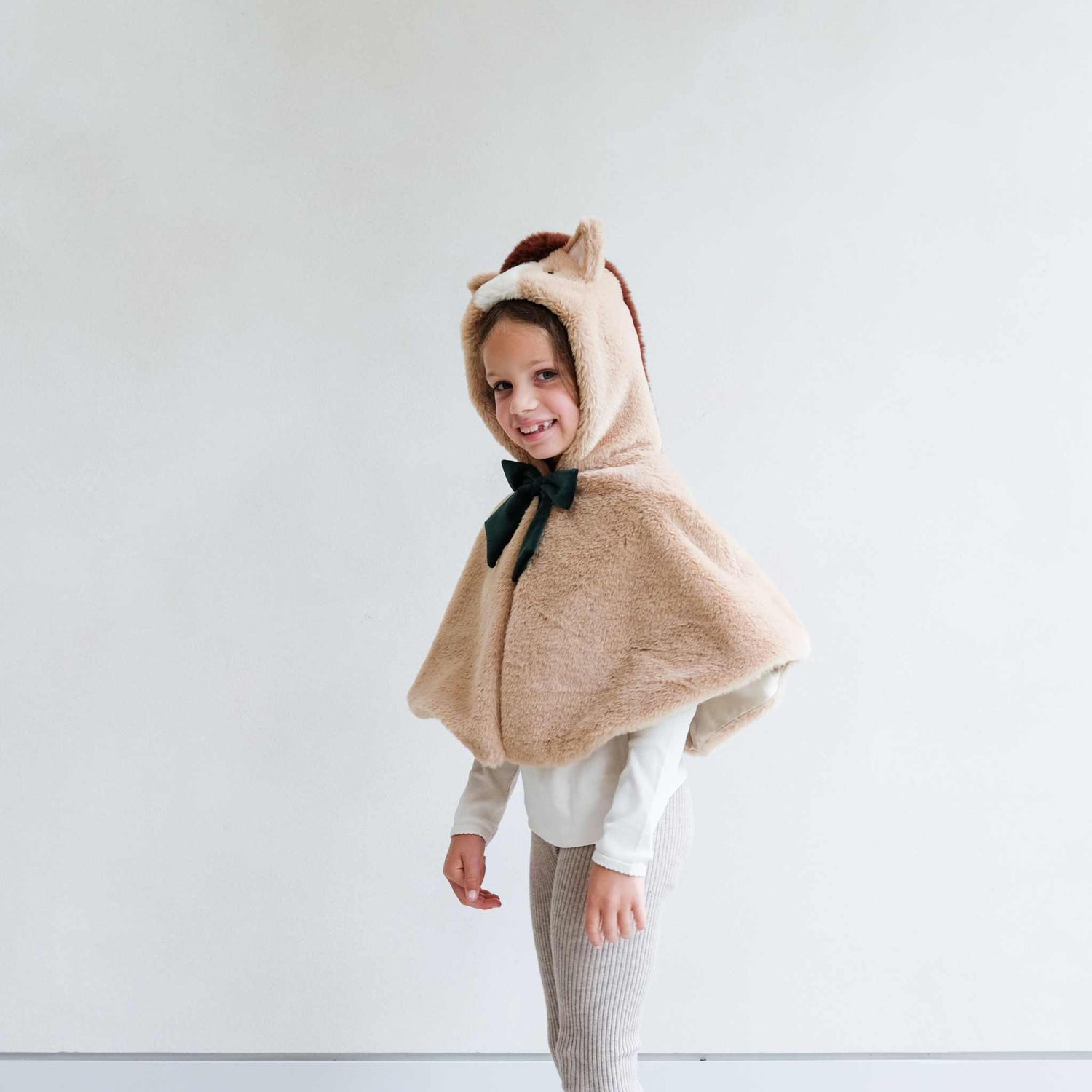 Dieses tolle Cape ist passend für Kinder von 3-10 Jahren. Hergestellt aus weichem Kunstfell mit Satinfutter und einem Druckknopfverschluss unter der tiefgrünem Samtschleife.