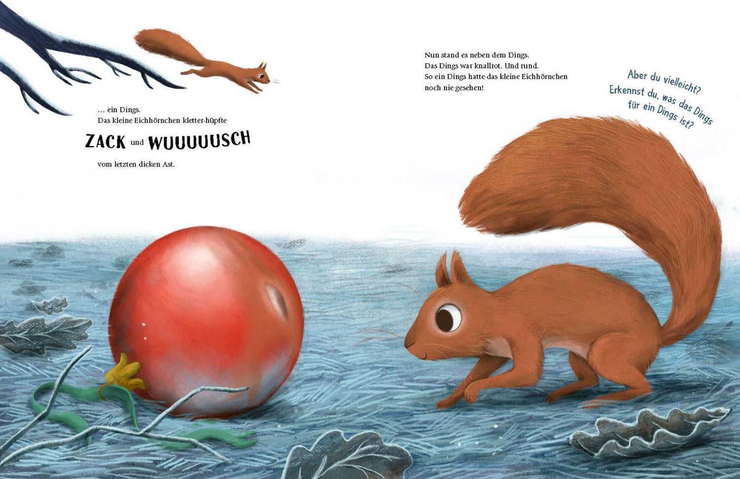 Das Eichhörnchen seufzt vor Glück, als es auf dem Waldboden ein glitzerndes Etwas entdeckt, dunkelrot und kugelrund. Ob das wohl eine besonders große Himbeere ist? Aber doch nicht mitten im Winter! Zusammen mit den anderen Waldtieren versucht das Eichhörnchen herauszufinden, was das Weihnachtsdings für eine Funktion hat. Und am liebsten möchte es jeder für sich allein beanspruchen. Großherzig bringen sie es schließlich dahin zurück, wo es von zwei Geschwisterkindern schon sehnlich vermisst wird: an den Tannenbaum.