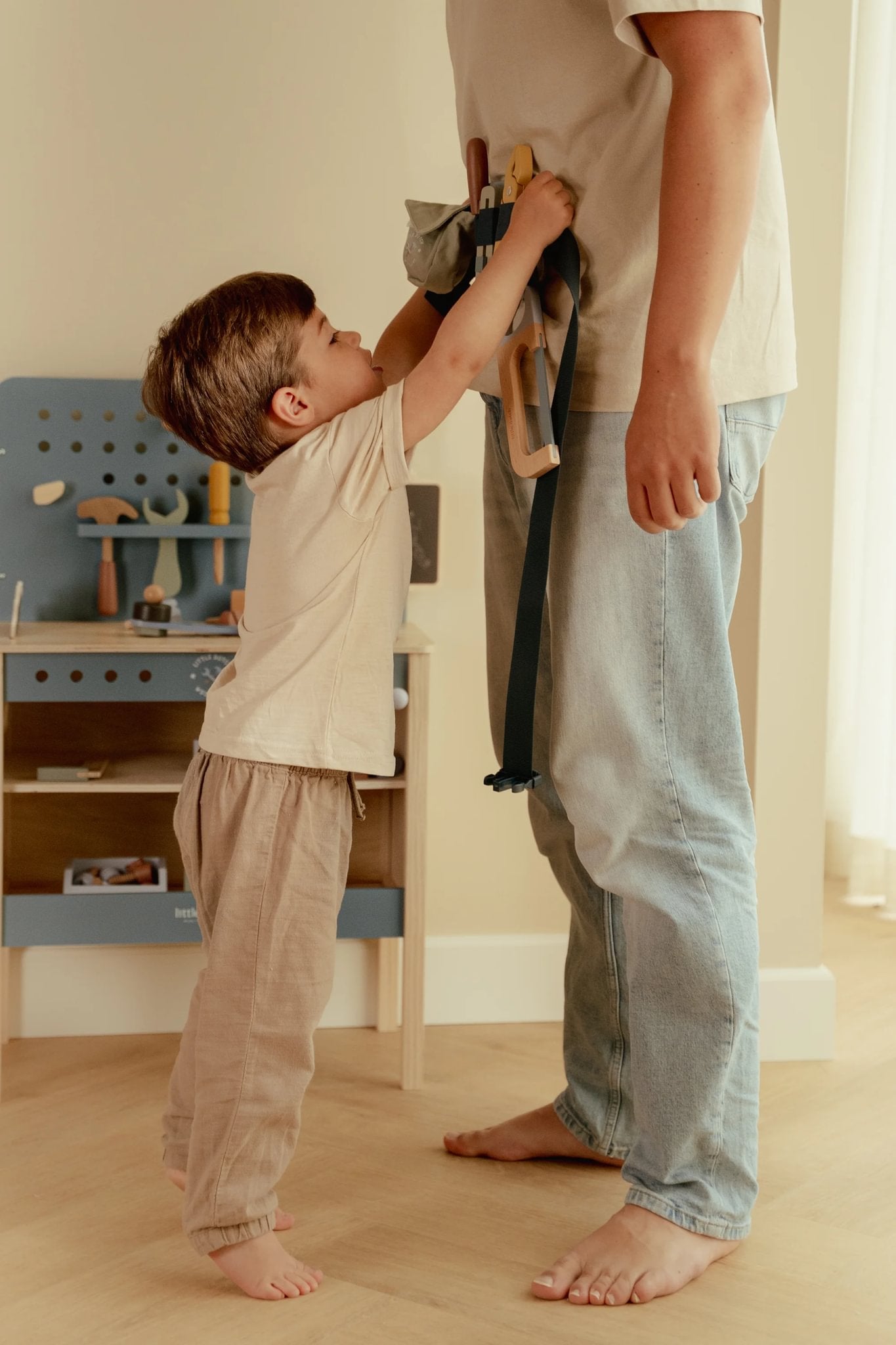 Praktischer Werkzeuggürtel aus Holz von Little Dutch – ein Must-have für kleine Heimwerker. Ausgestattet mit fünf verschiedenen Werkzeugen, darunter Hammer, Schraubendreher und Schraubenschlüssel. Der verstellbare Gürtel sorgt für optimalen Sitz beim Spielen. Perfekt für fantasievolle Rollenspiele und zur Förderung der motorischen Entwicklung. In Kombination mit Werkbank und Werkzeugkasten entsteht ein kompletter Spiel-Arbeitsplatz.