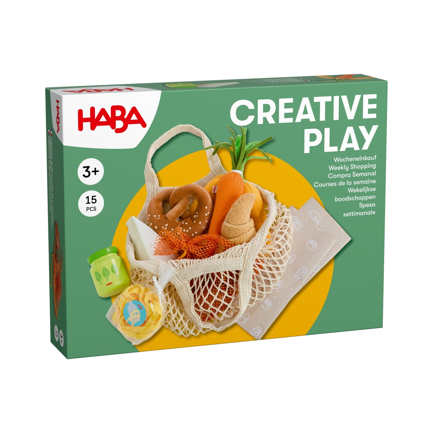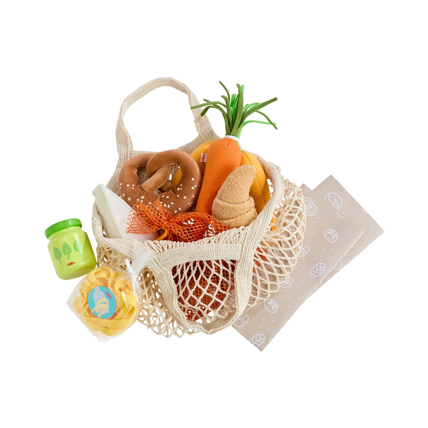 Mit diesem liebevoll gestalteten Einkaufsnetz von Haba, mit Lebensmitteln wird jeder Marktausflug zum fantasievollen Rollenspiel. Ob Croissant, Käse, Möhren oder Pesto – die Kombination aus Holz- und Stoffelementen lädt dazu ein, Alltagssituationen nachzuspielen und erste Einkaufserlebnisse kreativ zu gestalten. Ideal geeignet für die Spielküche oder den Kaufladen, ist dieses Set eine tolle Ergänzung für Rollenspiele rund ums Einkaufen, Kochen und Haushalten. Gleichzeitig fördert es spielerisch die Feinmotorik, die Sprache und das soziale Verhalten.