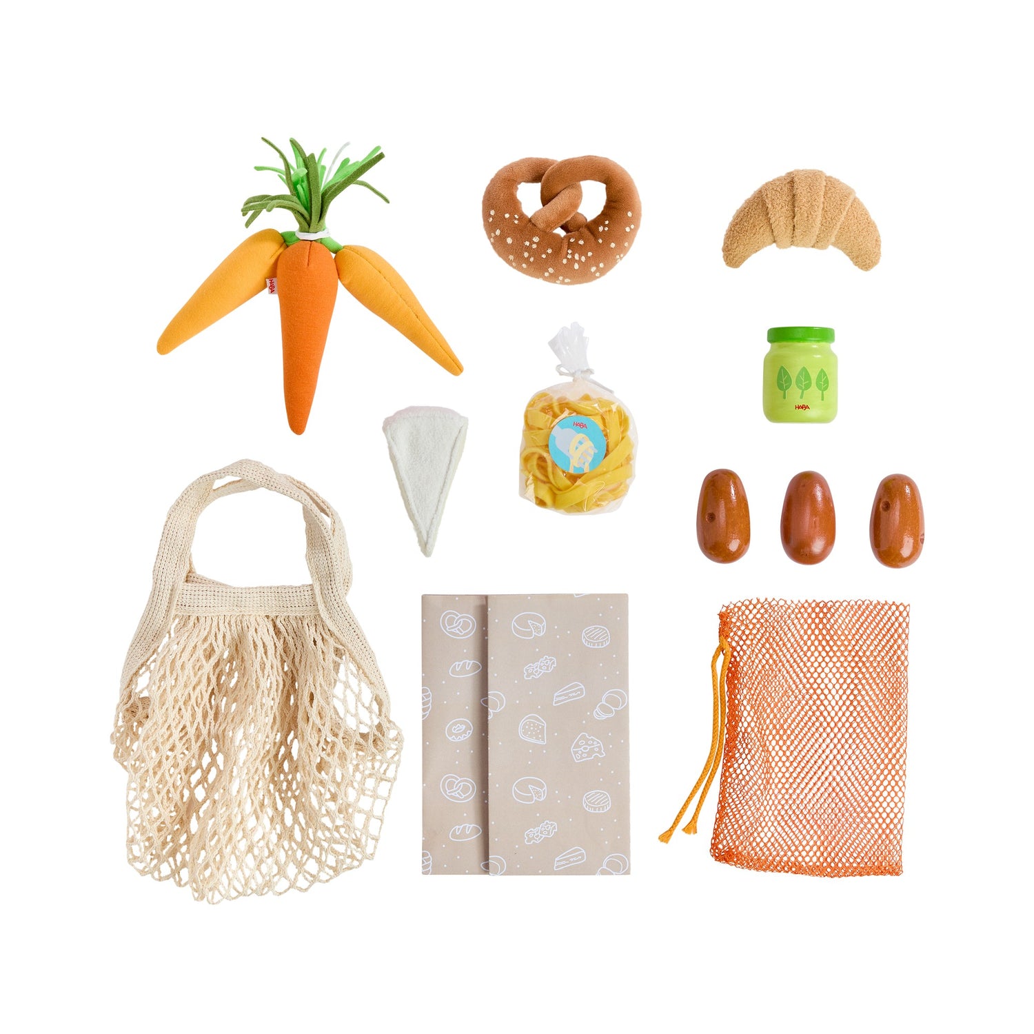 Inhalt: 1 Einkaufsnetz, 3 Kartoffeln, 3 Möhren, 1 Portion bunte Nudeln, 2 Papiertüten, 1 Croissant, 1 Brezel, 1 Stück Camembert, 1 Glas Pesto