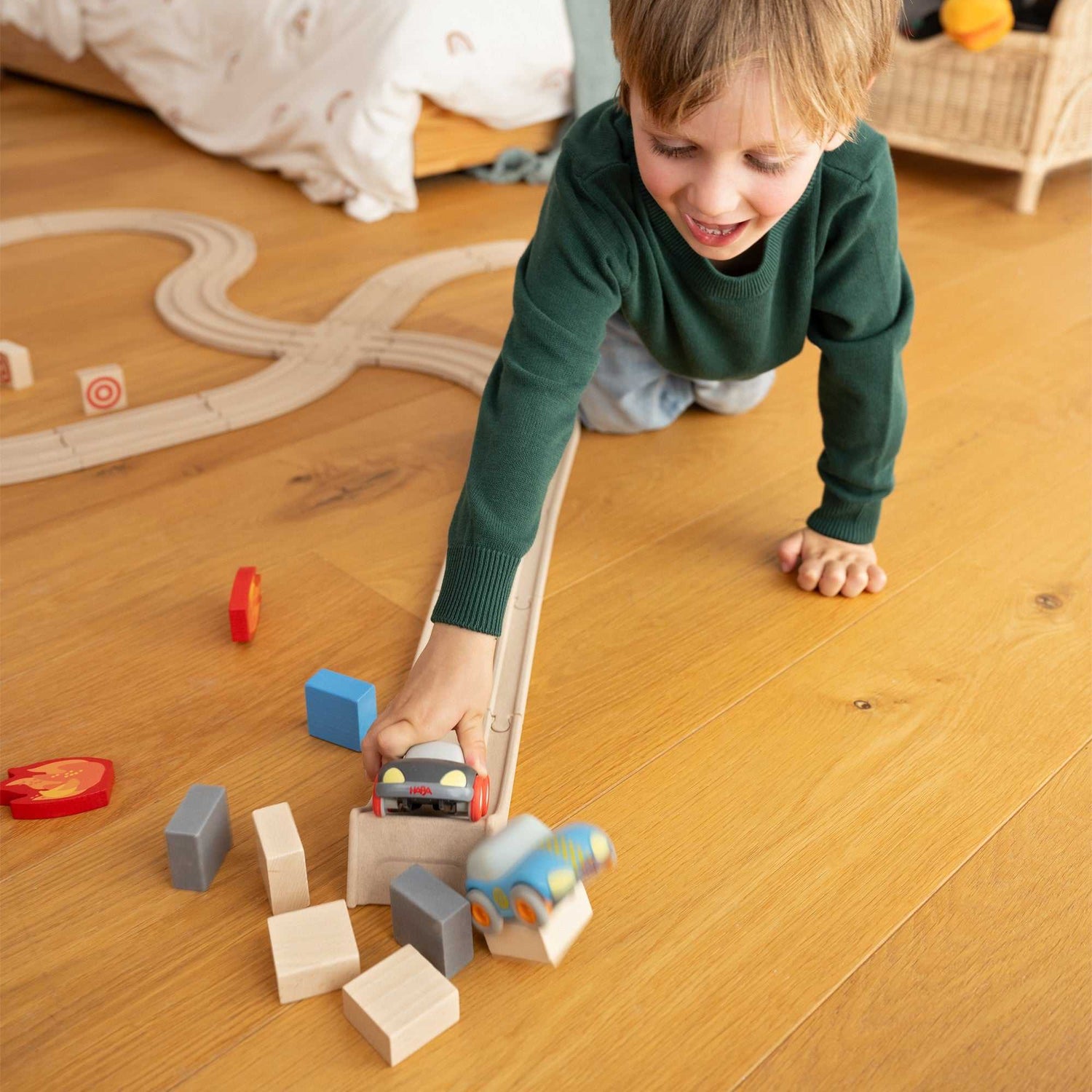 Die Haba Cars Sets setzen ein Zeichen für Nachhaltigkeit und Umweltschutz. Mit Streckenelementen aus 100 Prozent recyceltem holzbasiertem Material und Autos aus recyceltem ABS leistet Haba einen wichtigen Beitrag dazu und schafft gleichzeitig ein einzigartiges Spielerlebnis für Kinder. Sämtliche Sets aus der Reihe Haba Cars sind miteinander kombinierbar. Ergänzungsset findest du auch hier in unserem Shop.