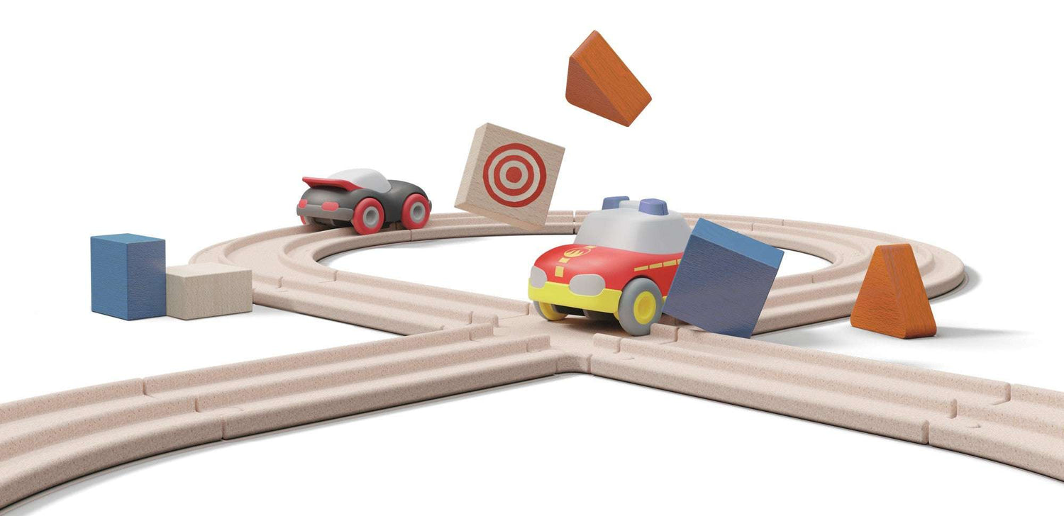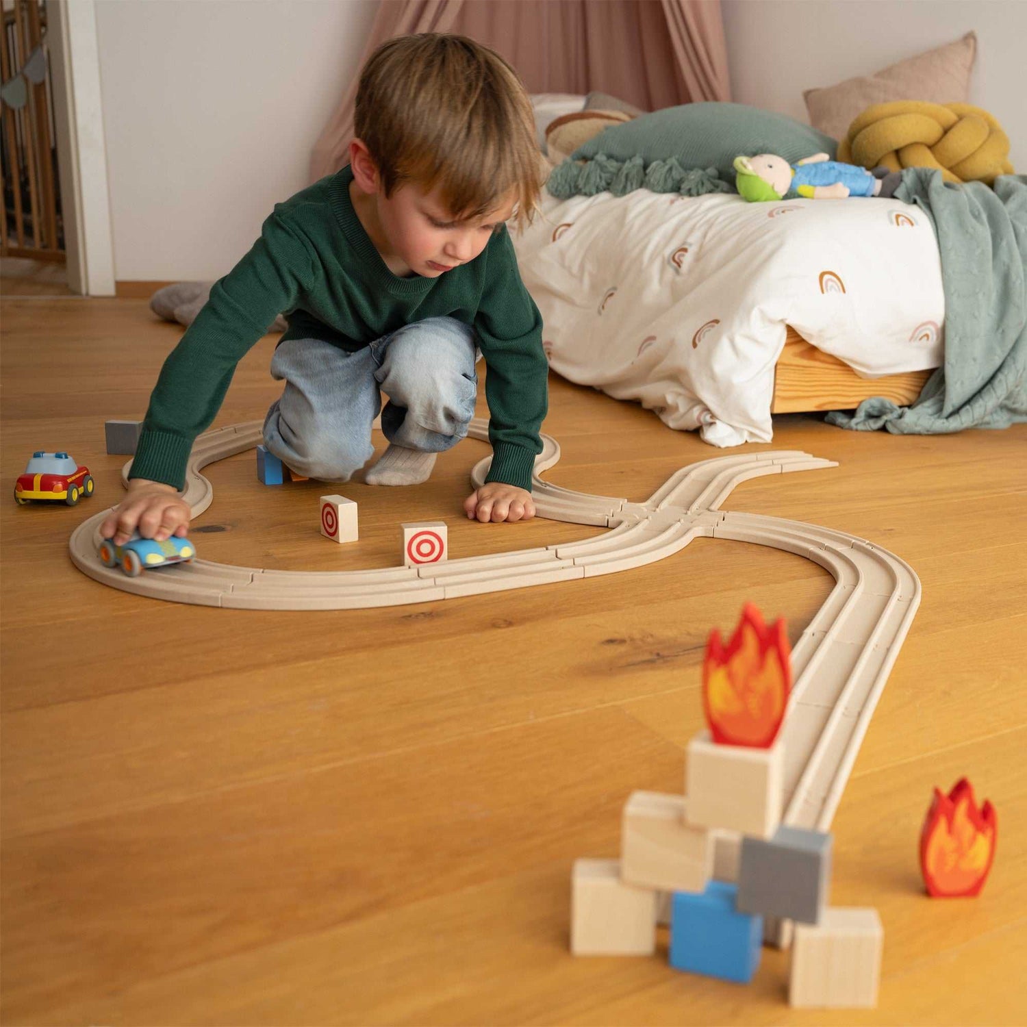 Alle Teile der Rennbahn kommen ohne scharfe Kanten aus. Sie lassen sich auch von kleinen Händen gut greifen und festhalten, sodass die Minis spielerisch ihre Motorik trainieren können.