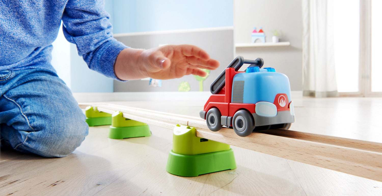 Der flinke Feuerwehr-Leiterwagen von HABA besitzt einen rasanten Schwungmotor.